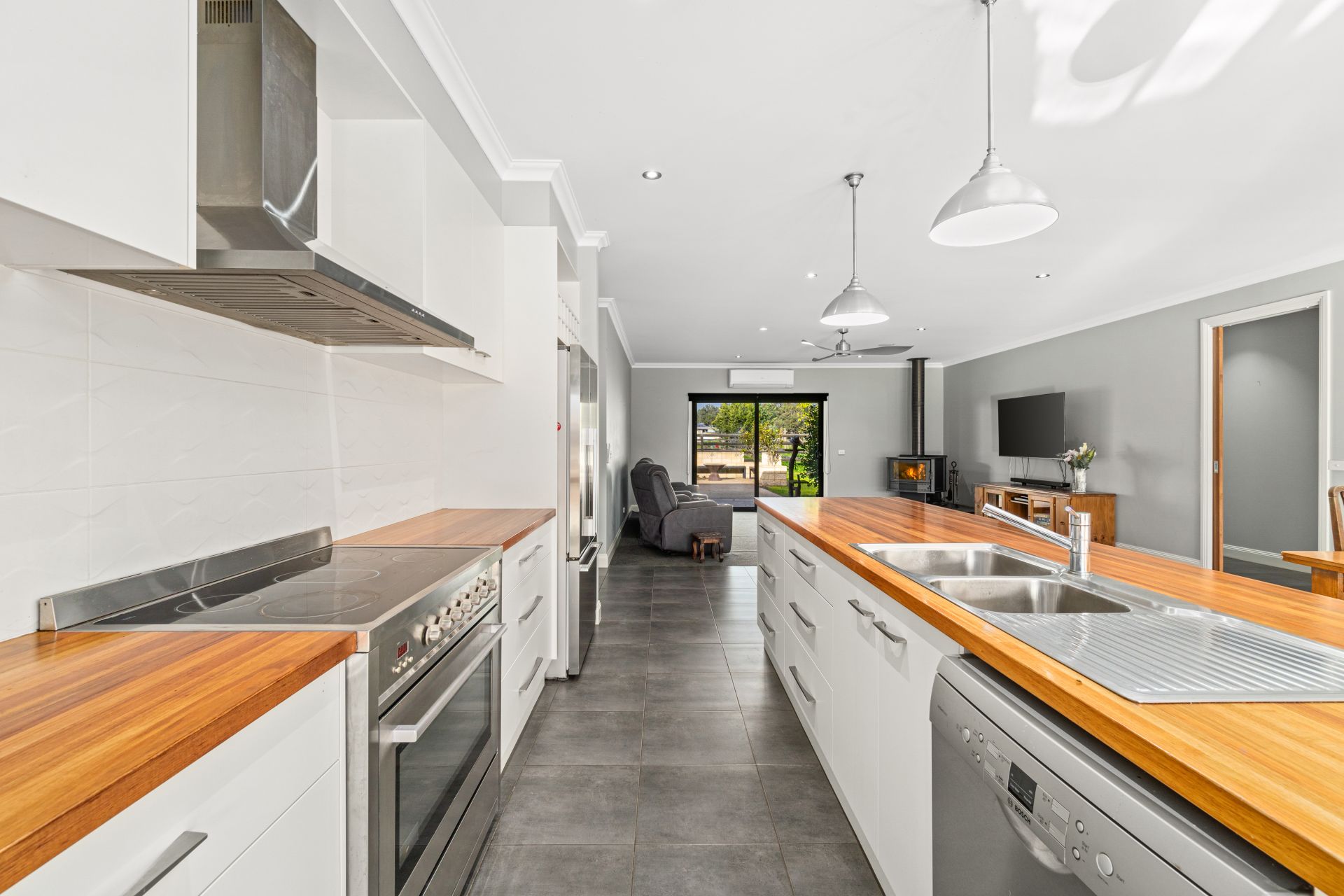 Impressive features include the timber kitchen benchtop with large butlers pantry, wood fire heating, split system air-conditioning, ceiling fans, high ceilings, bluetooth surround system and an additional outside toilet for when entertaining.
