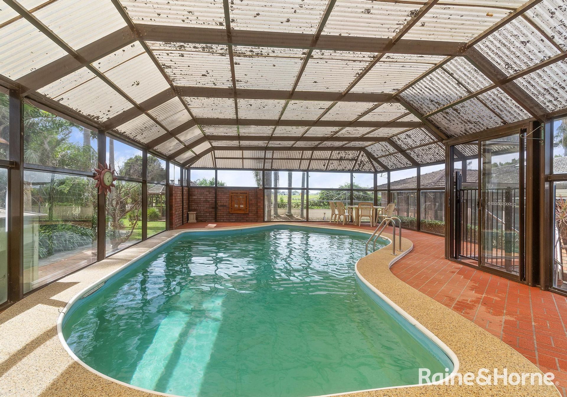 In addition to the main dwelling, the property includes practical amenities to enhance daily life. These features include various sheds, a spacious carport, ample undercover entertainment areas, and an enclosed heated pool room.