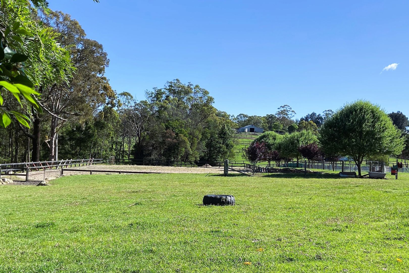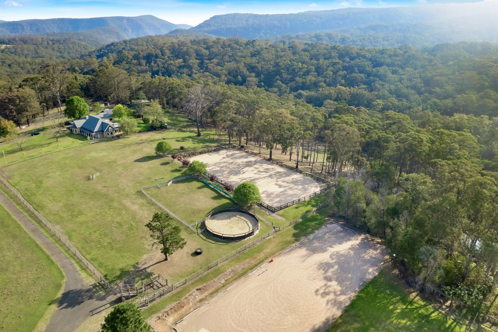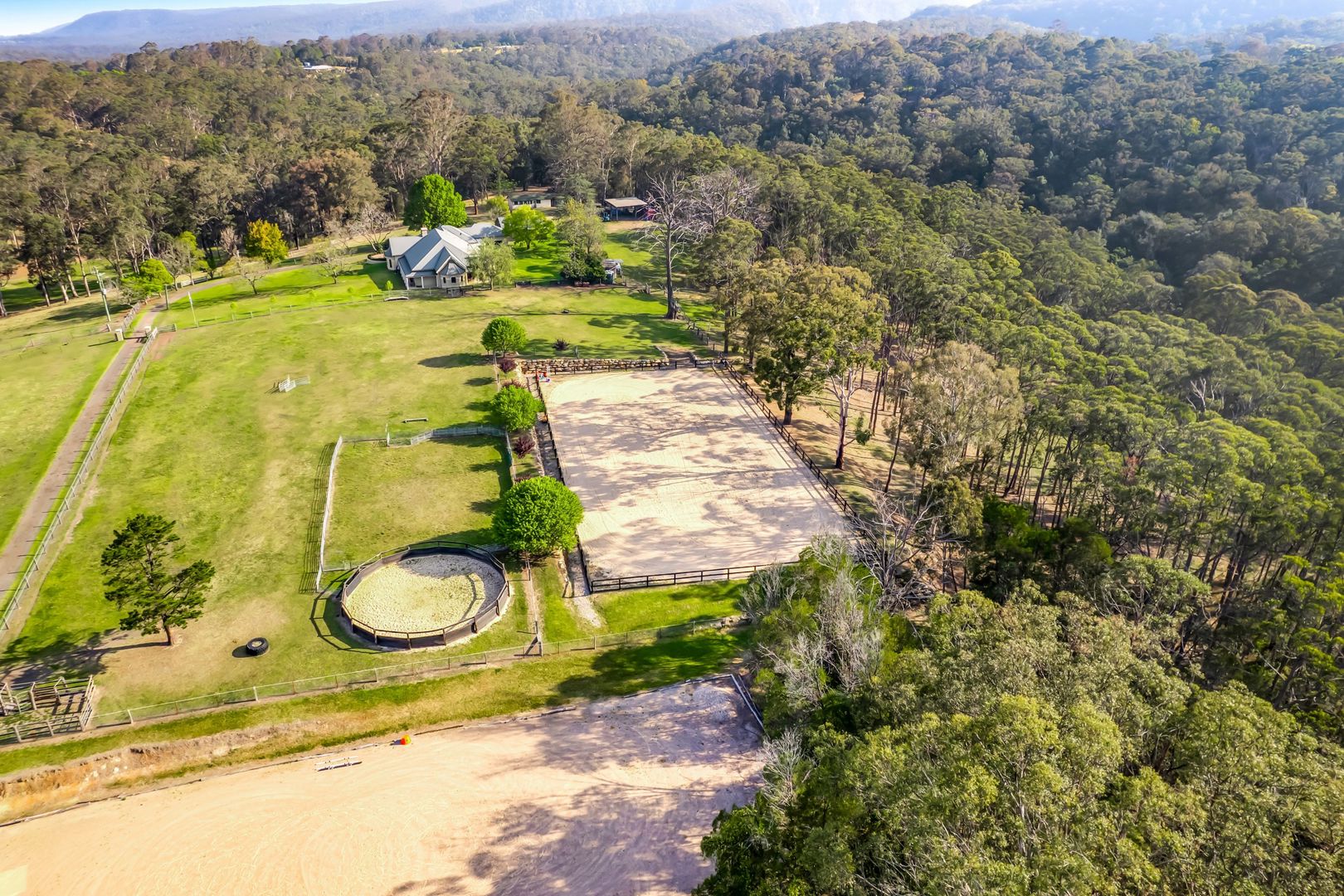 - Timber round yard, 60m x 30m sand arena suits show jumping
