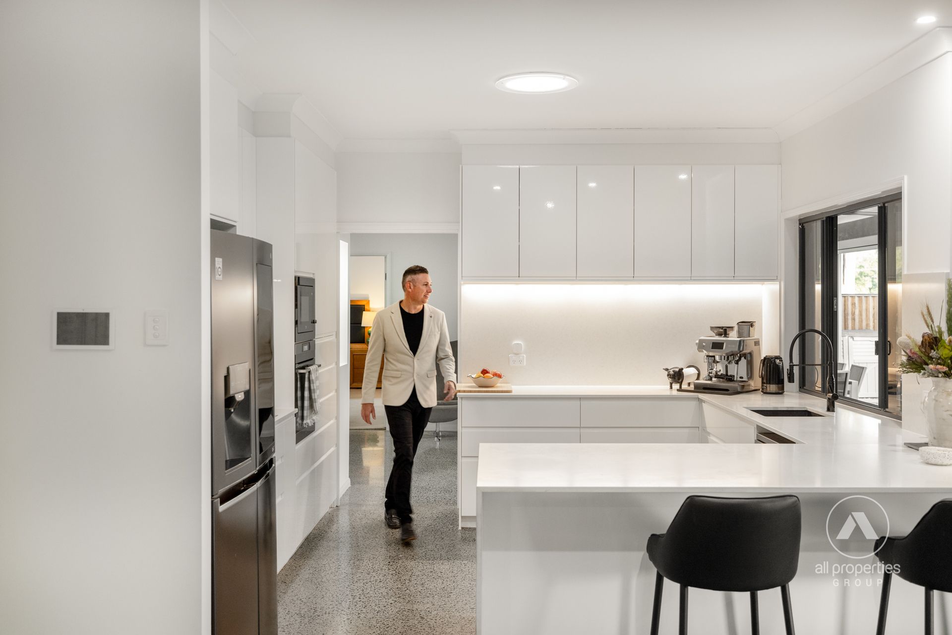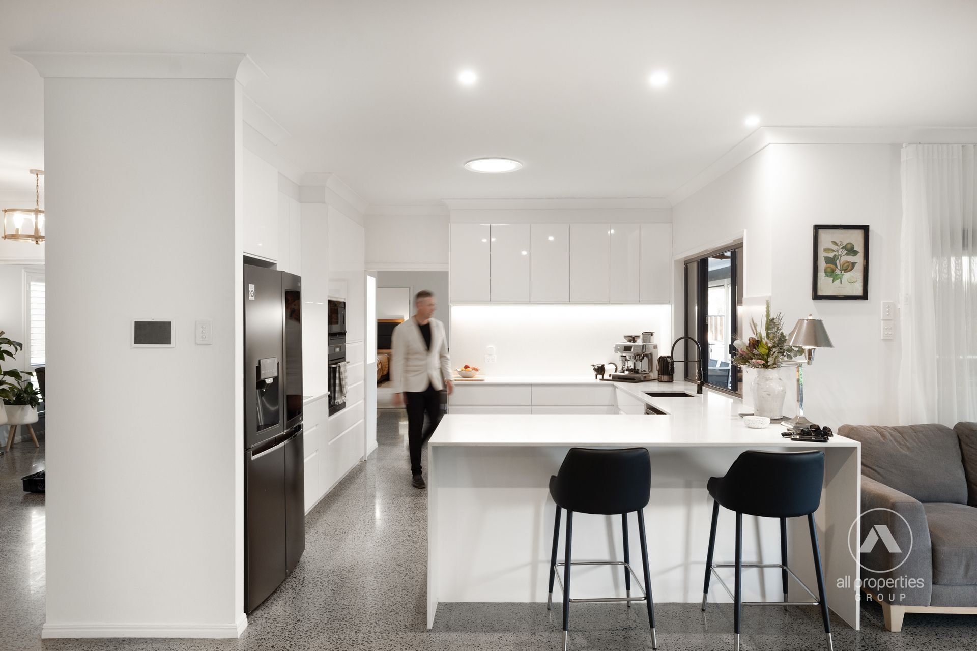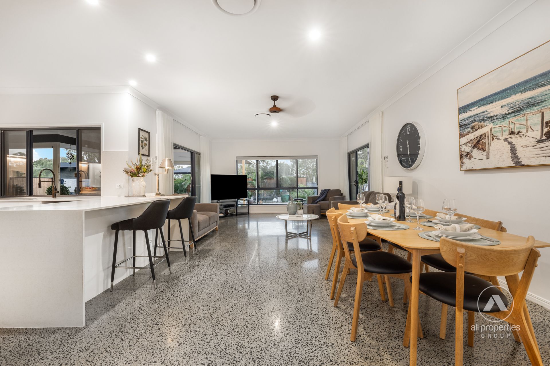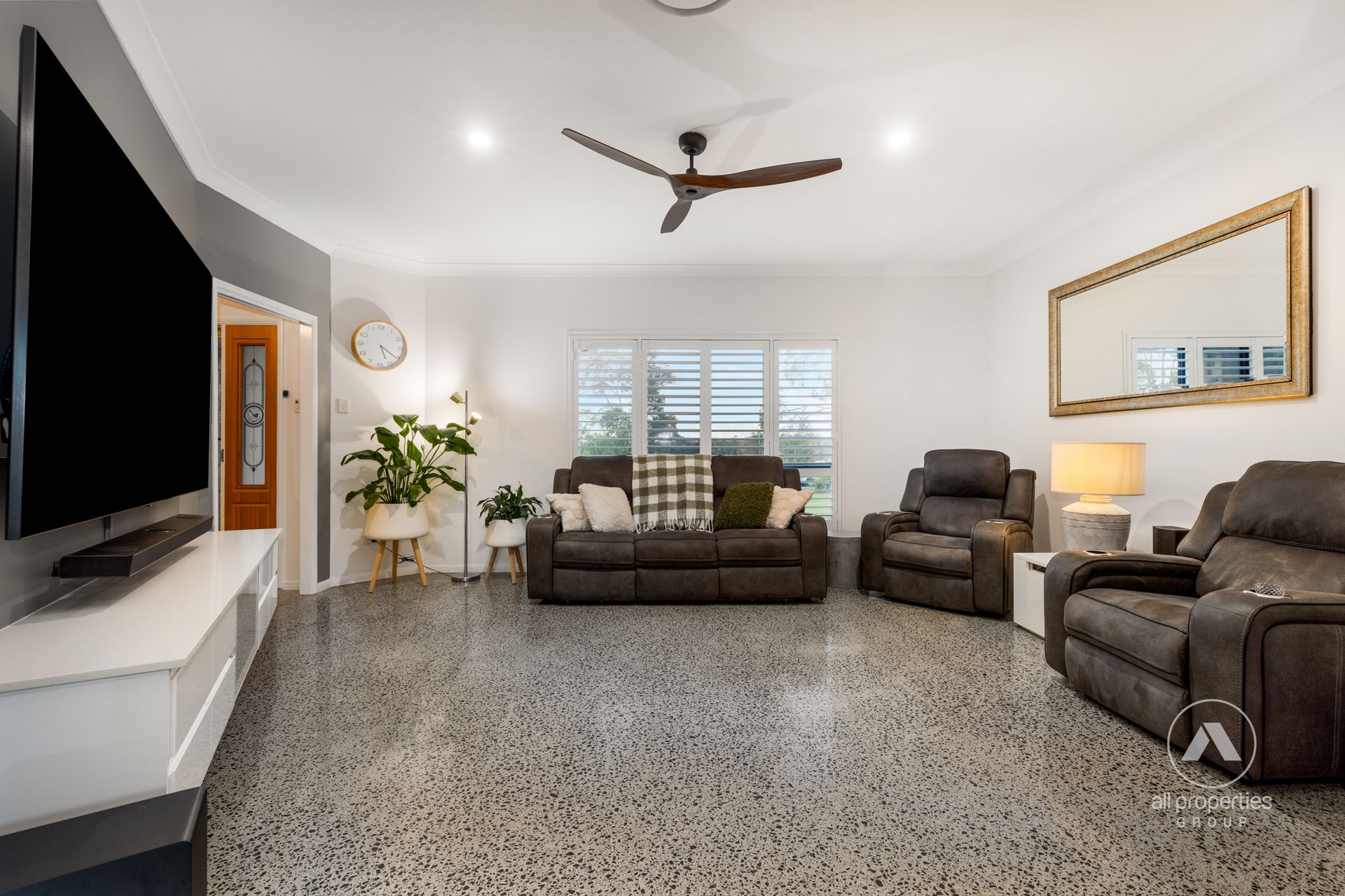 - Living Area 1: Formal lounge & dining, air-conditioned with polished concrete flooring & floating TV cabinet