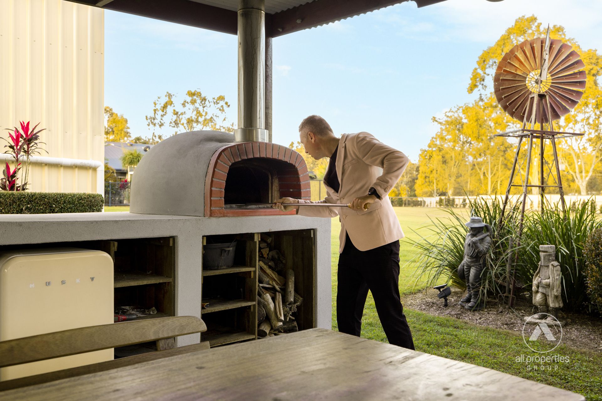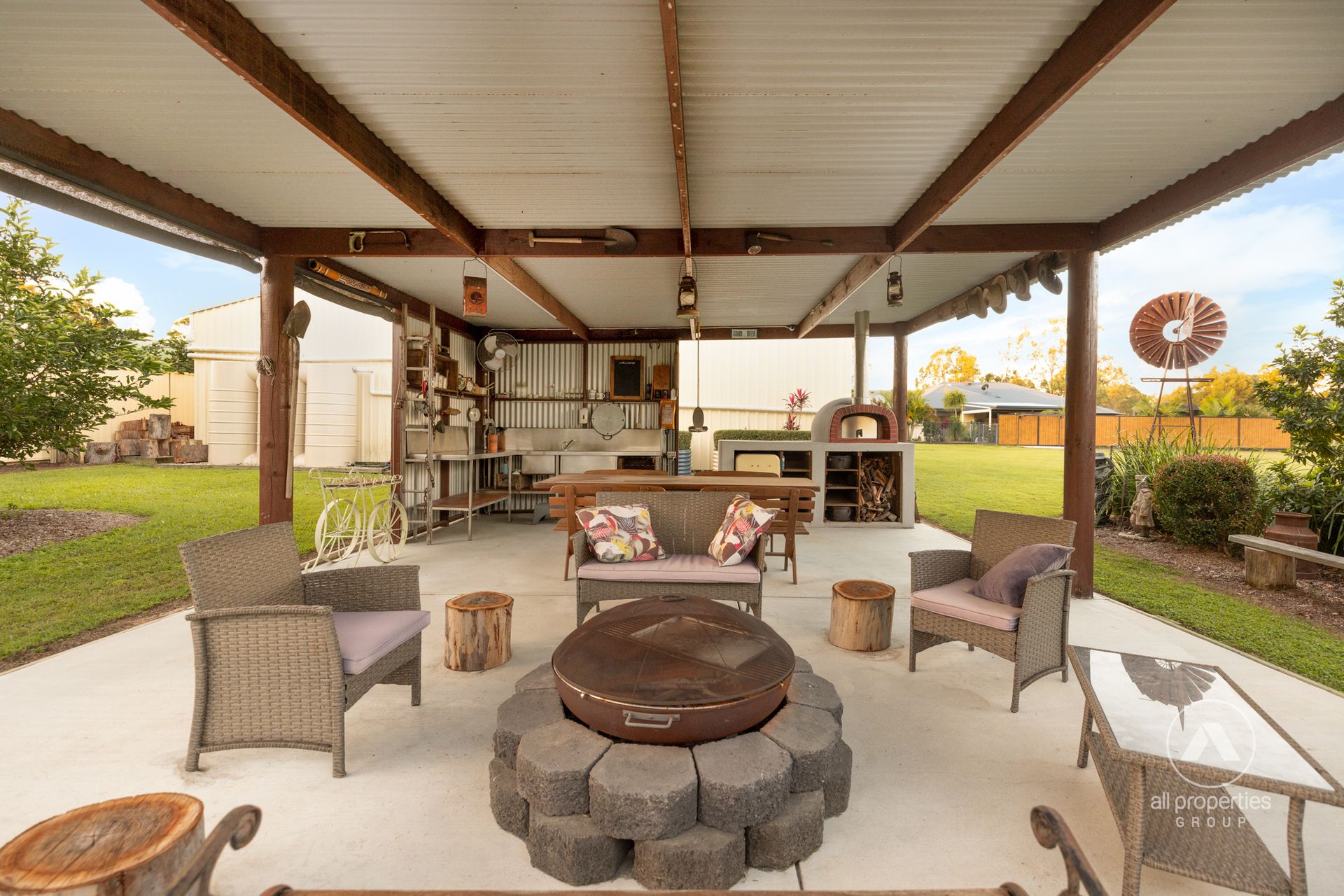 - Camp kitchen with Tuscan pizza oven + stainless steel sink & bench + firepit