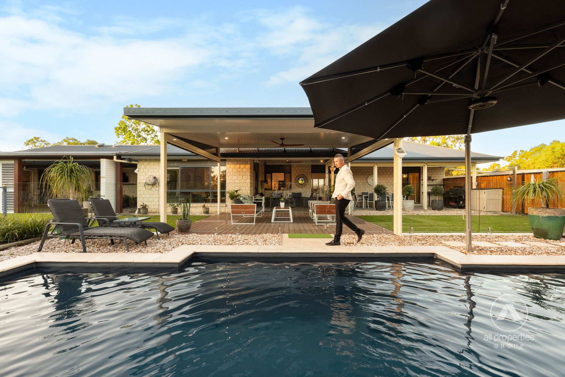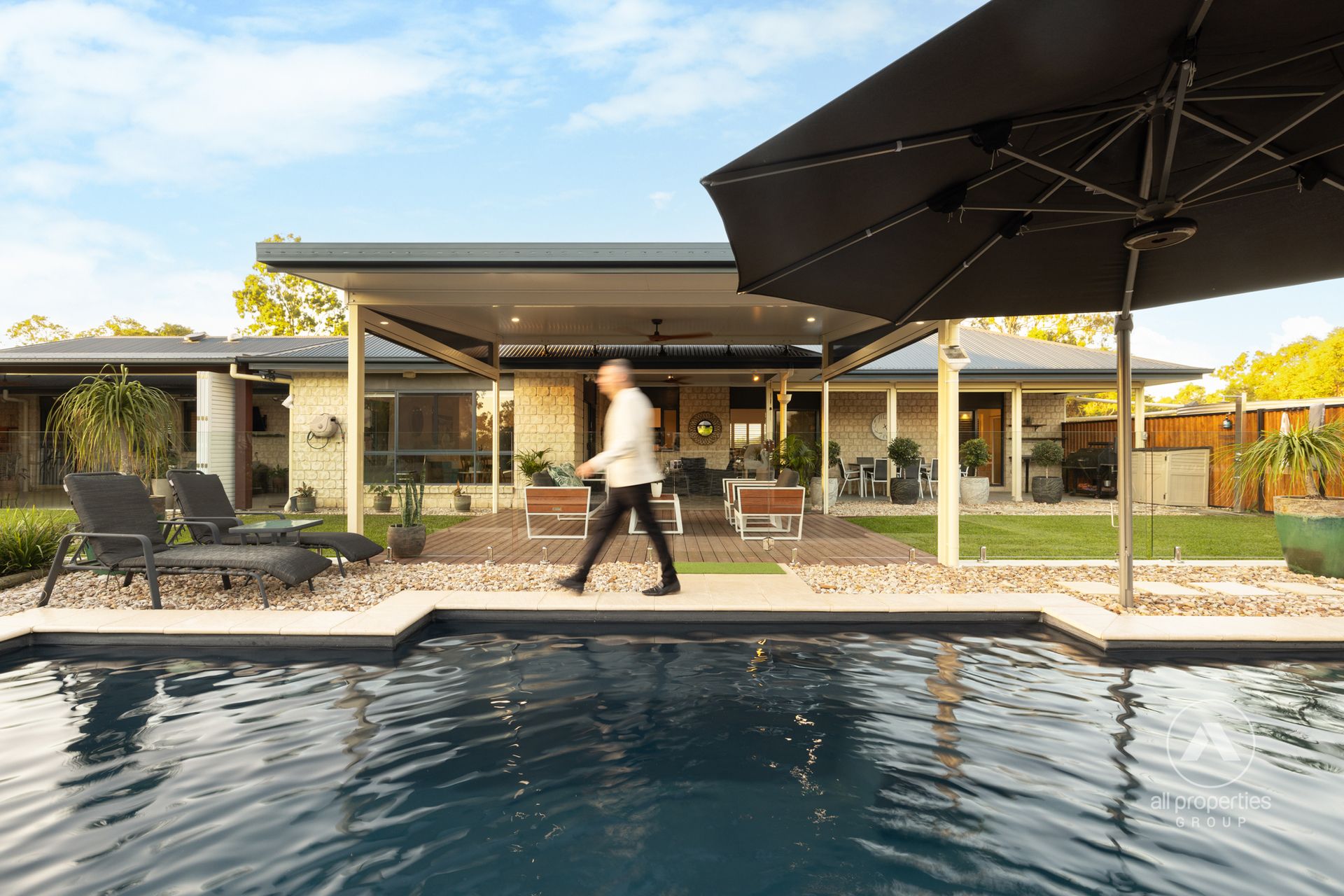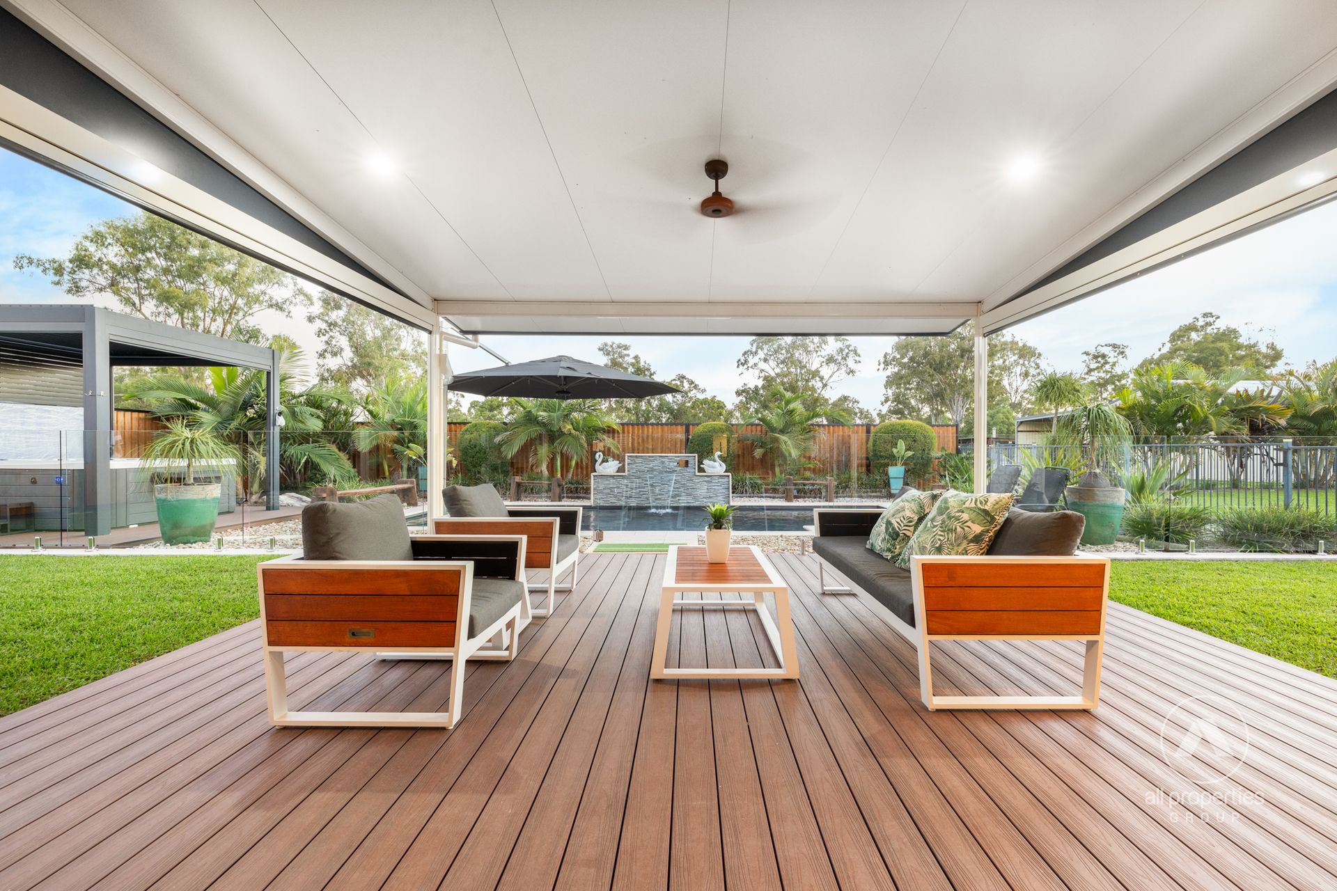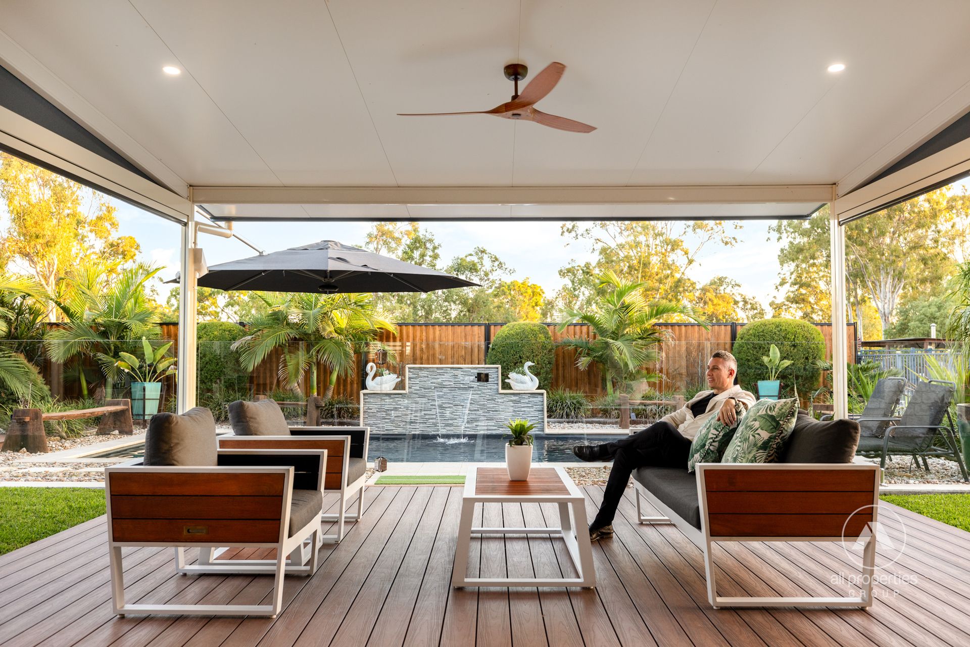 - Alfresco Space 1: Semi-polished concrete flooring + remote controlled sun blind system + composite timber-look decking towards pool + colorbond timber-look fencing