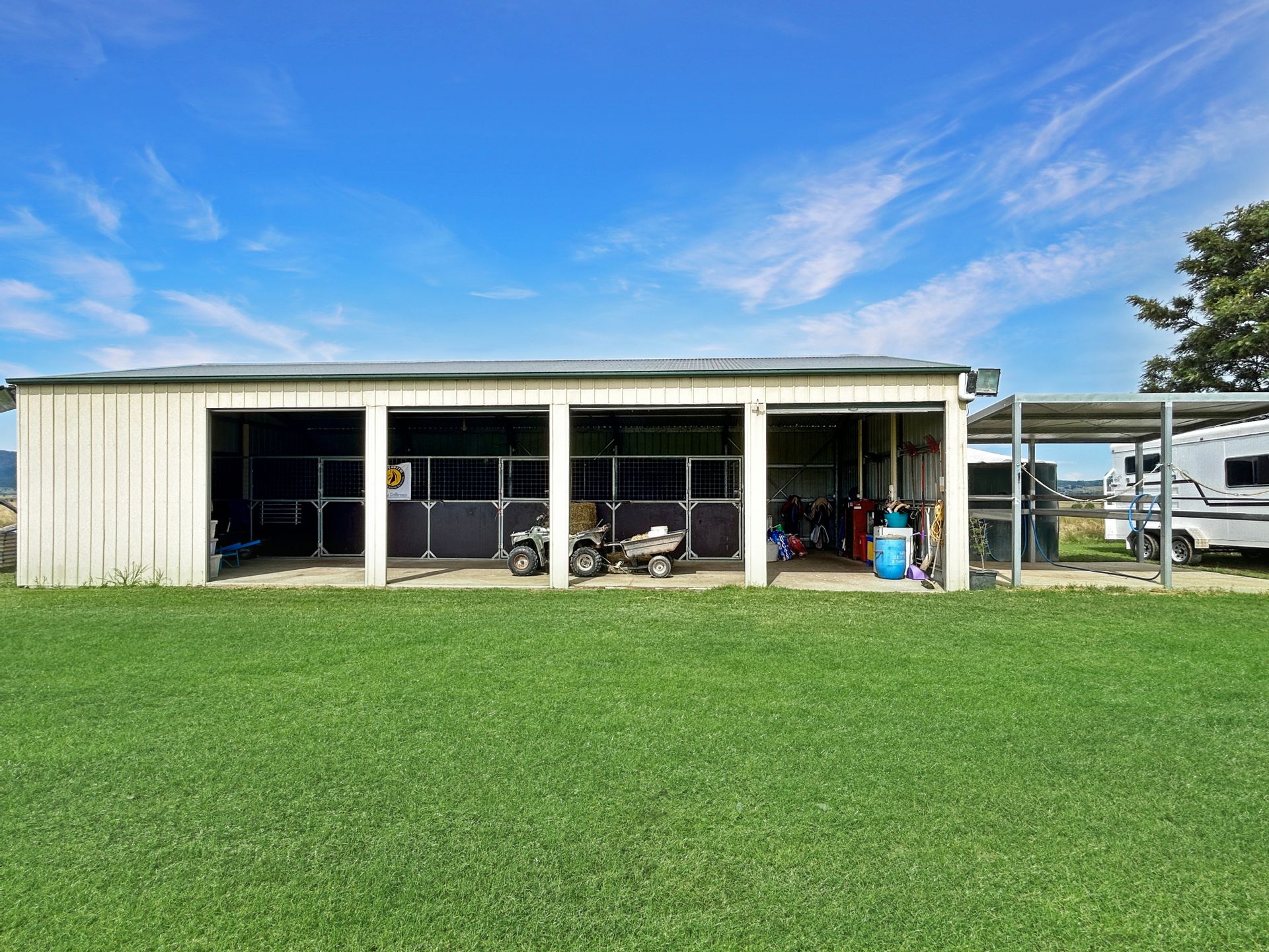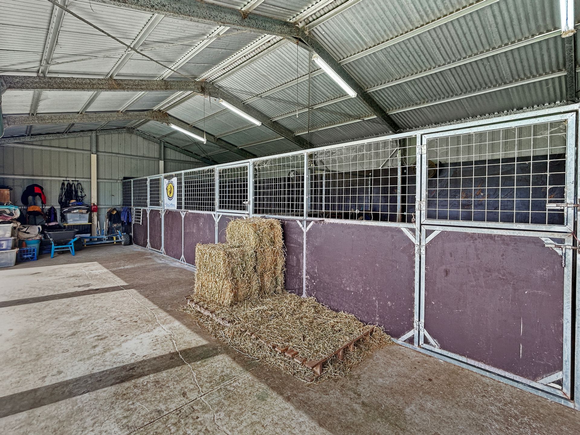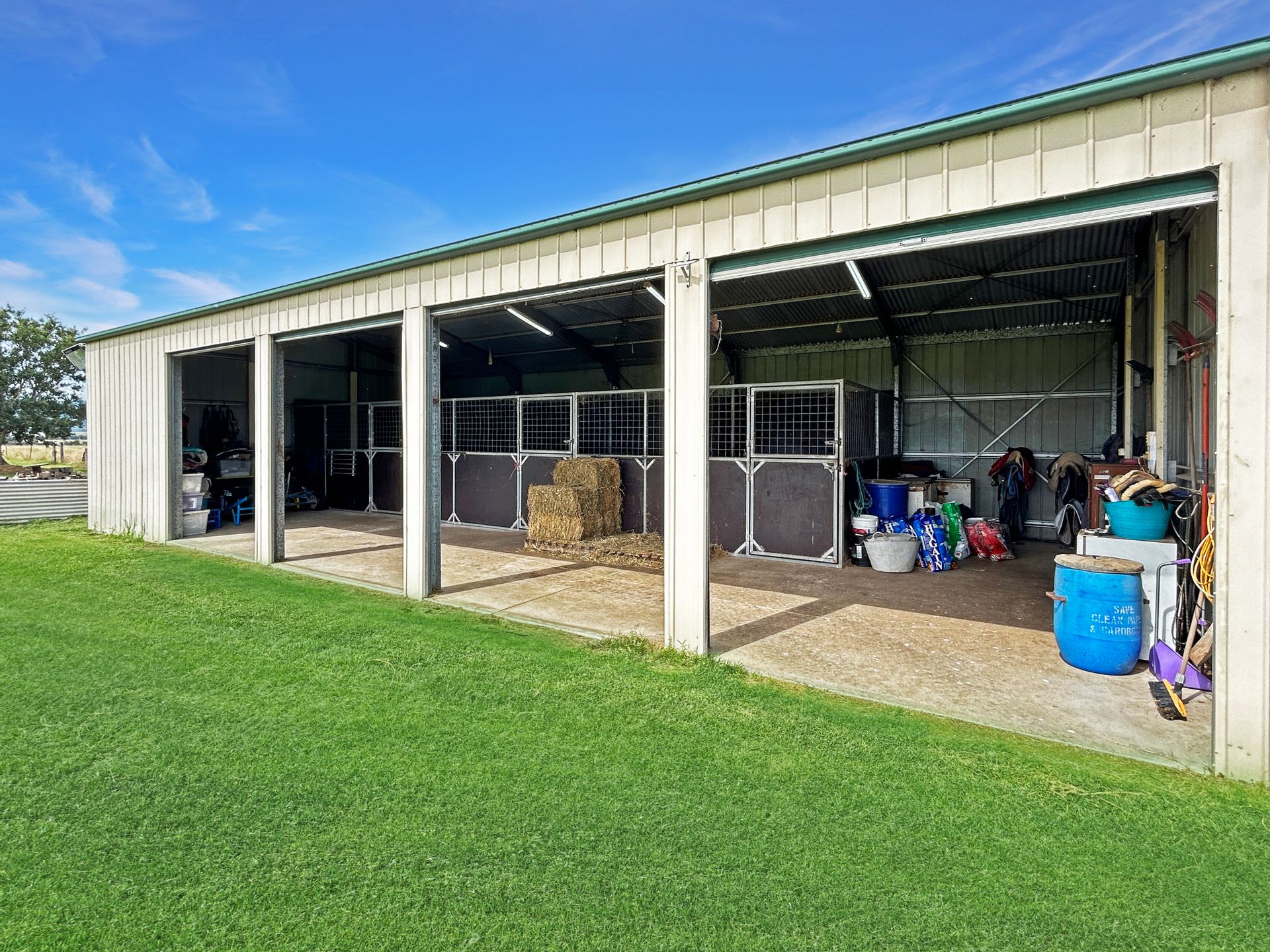 • 5 Bay lockable shed with 3 enclosed horse stables with fans plus tack and feed storage.