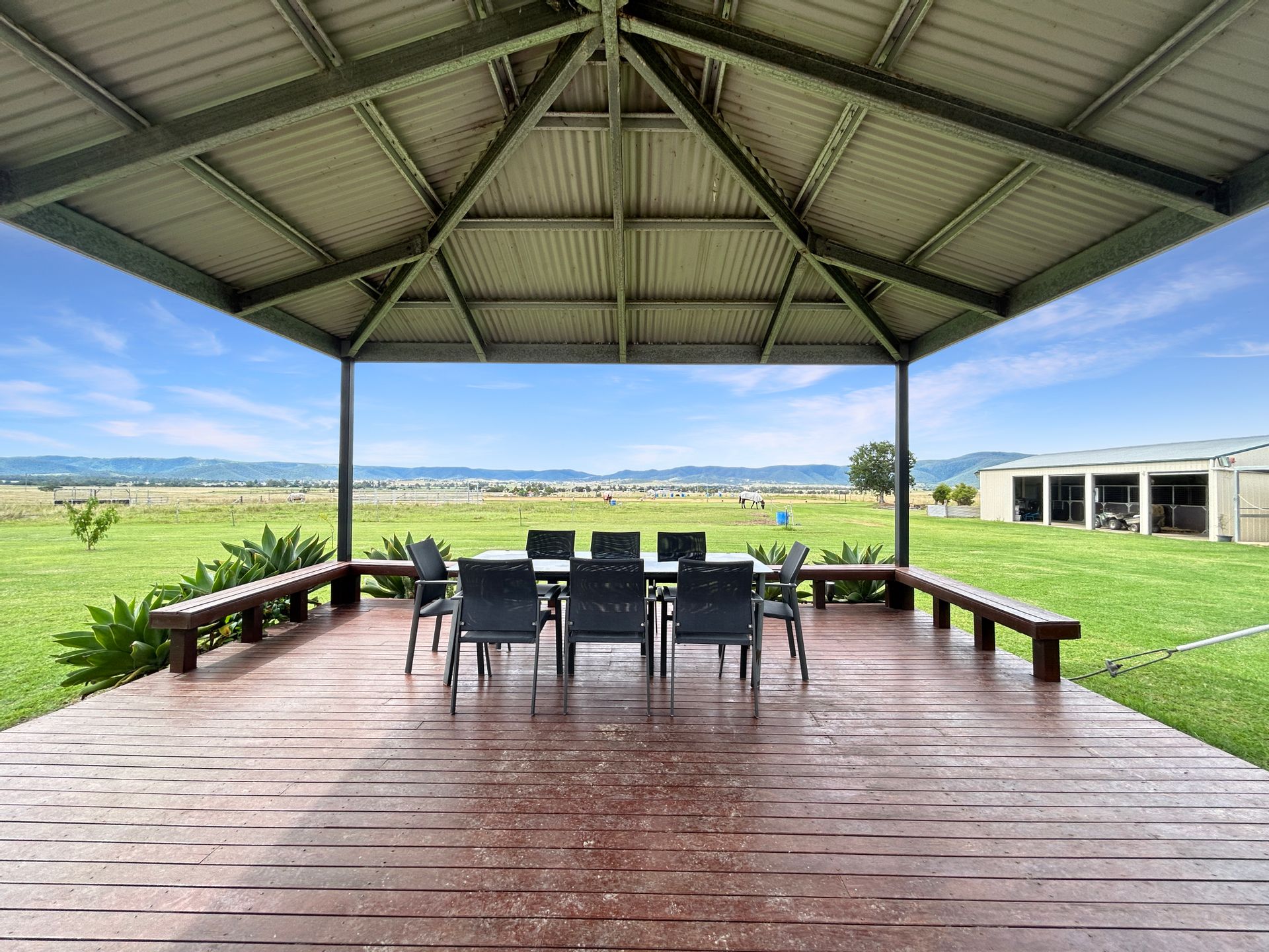 Step outside and discover a large pergola entertainment area, ideal for al fresco dining or simply soaking in the beauty of the surrounding mountains. The fully fenced house yard and paddocks ensure the safety of your horses and provide them with ample space to roam and graze.