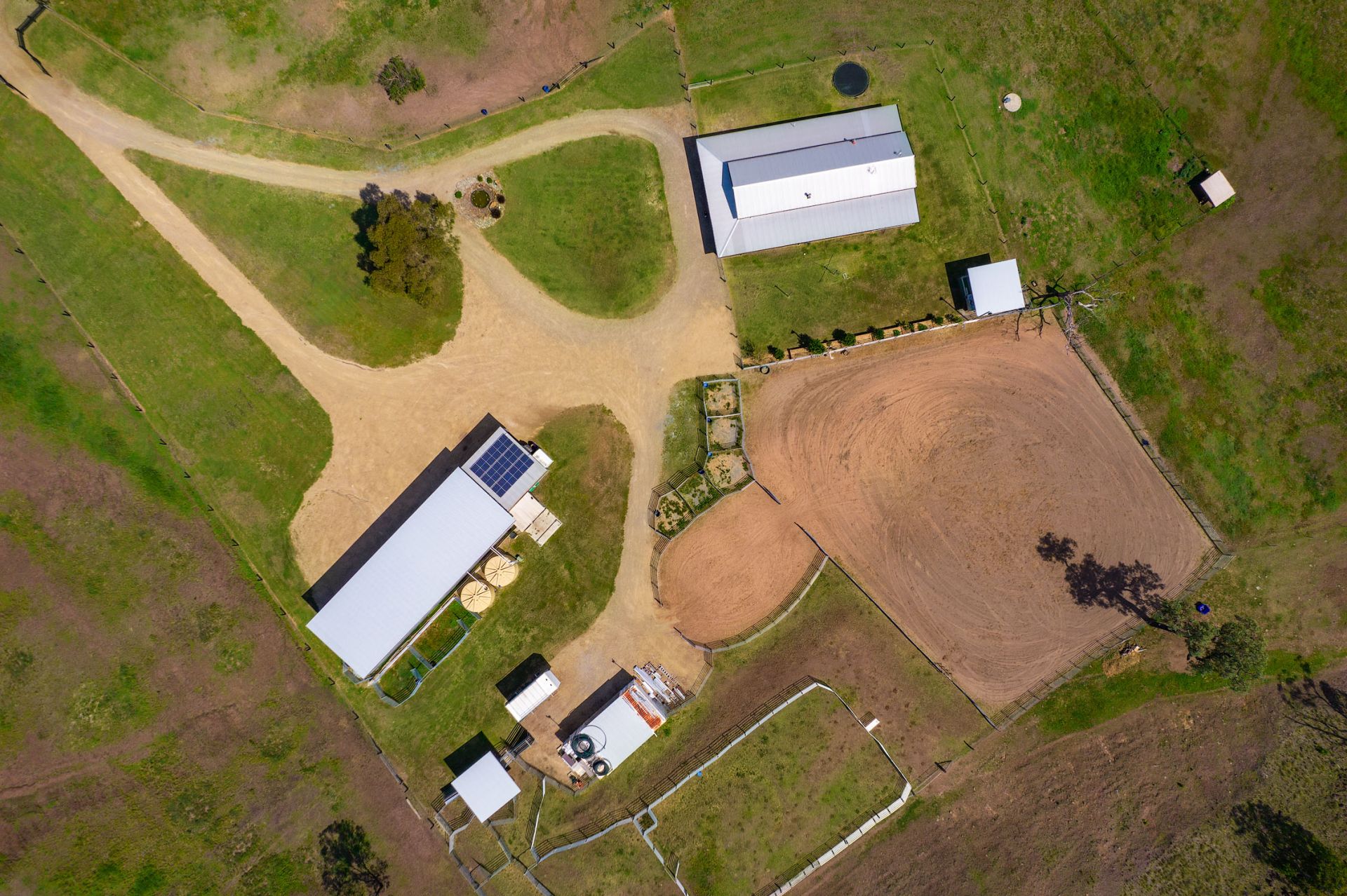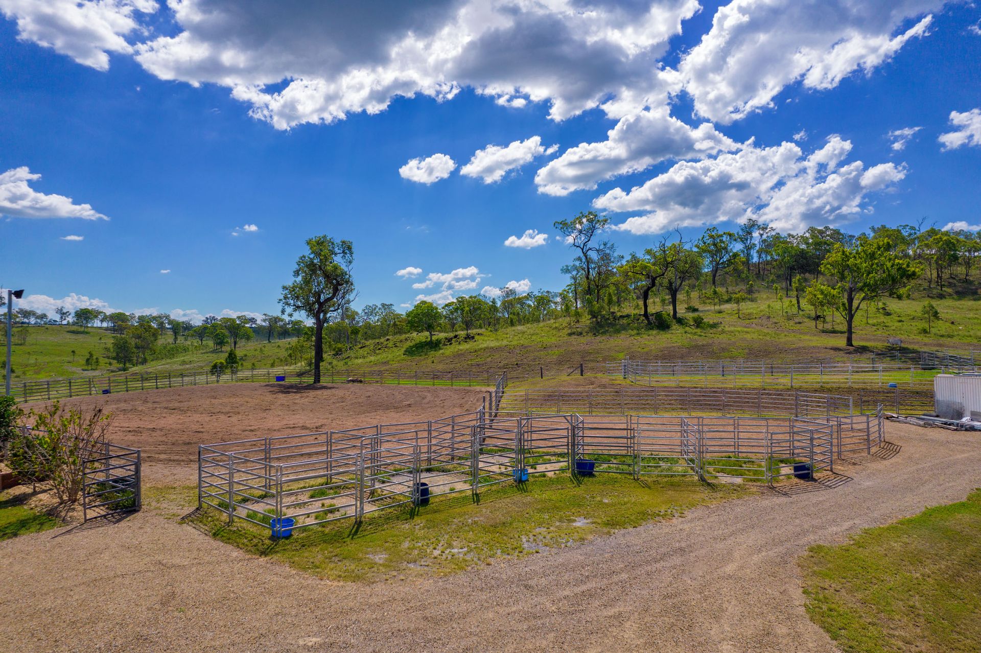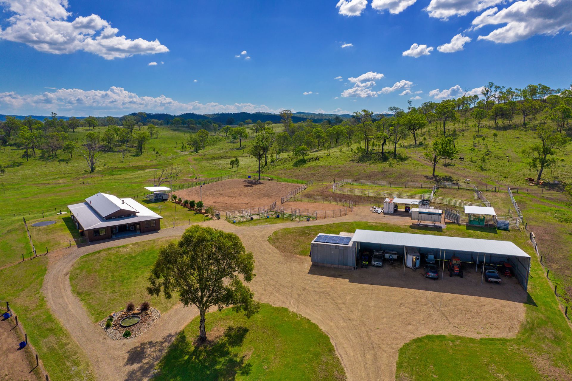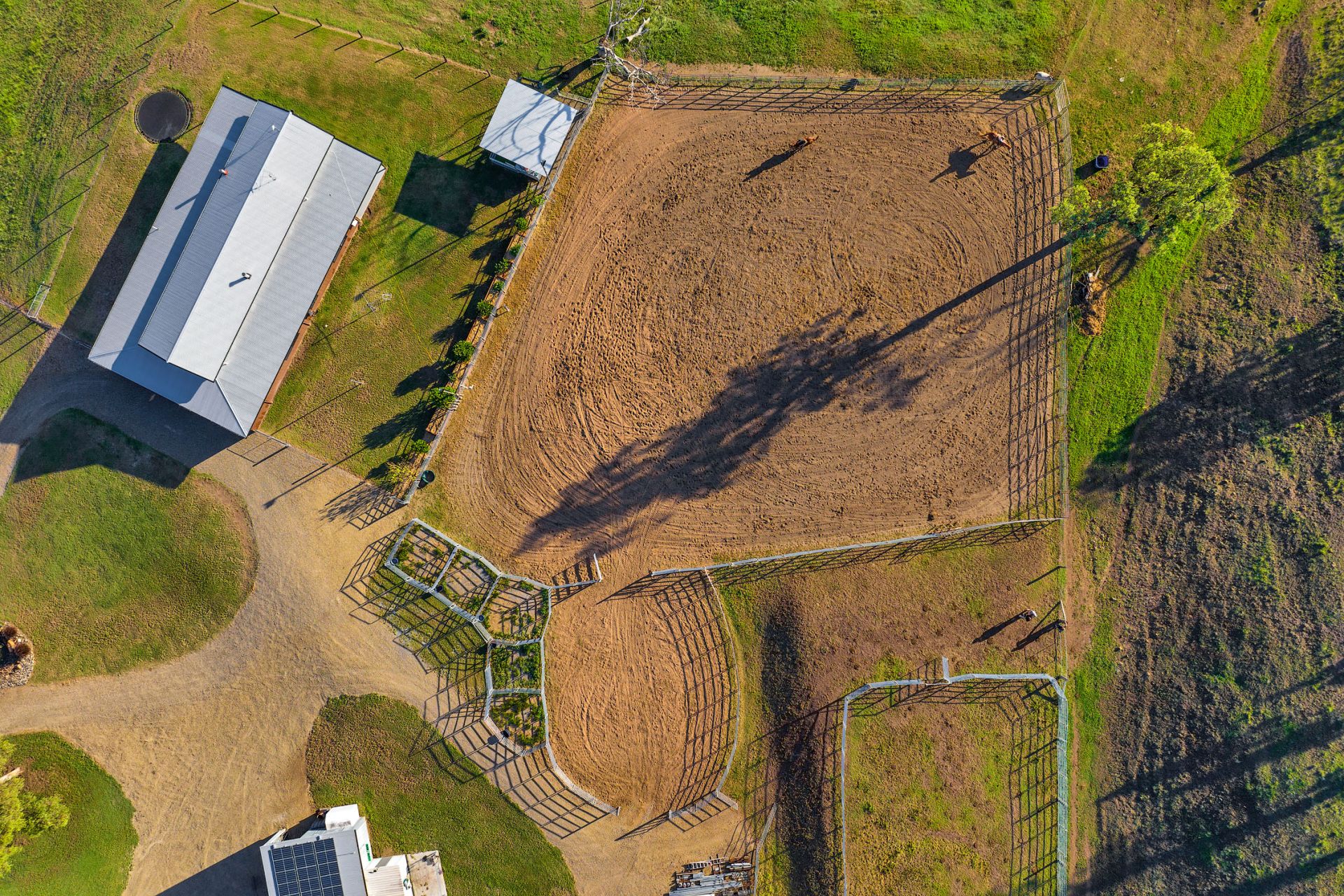 Fenced into 9 horse paddocks featuring timber split posts with 4 strand electric and concrete waters troughs to all, Full sand arena and cutting pen under lights, Enclosed tack room, 7 x day stables