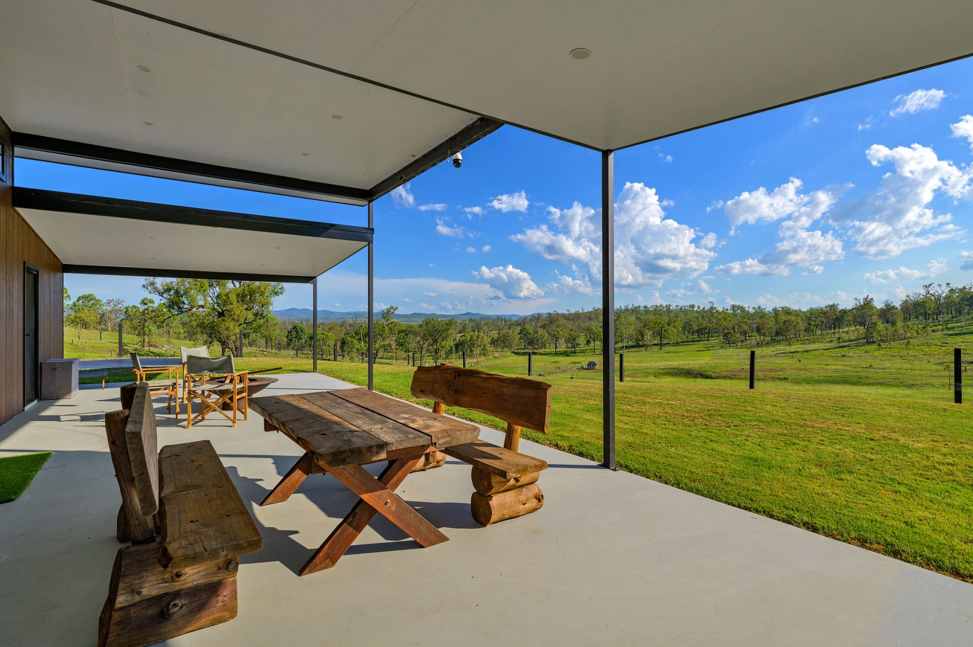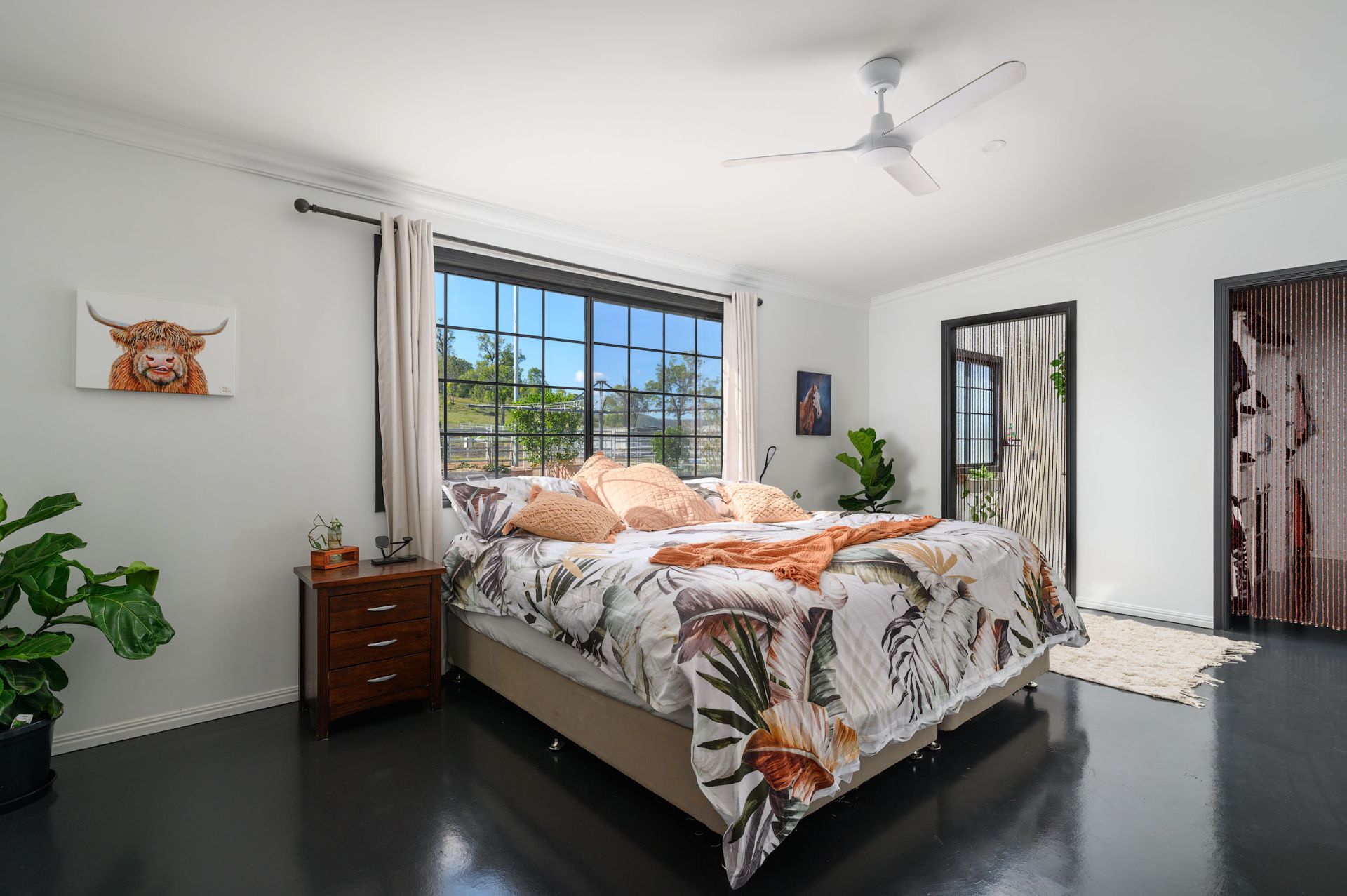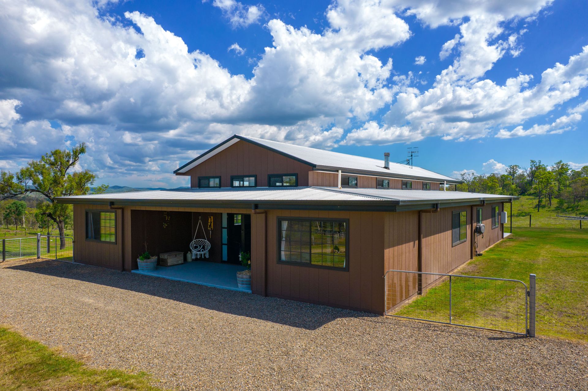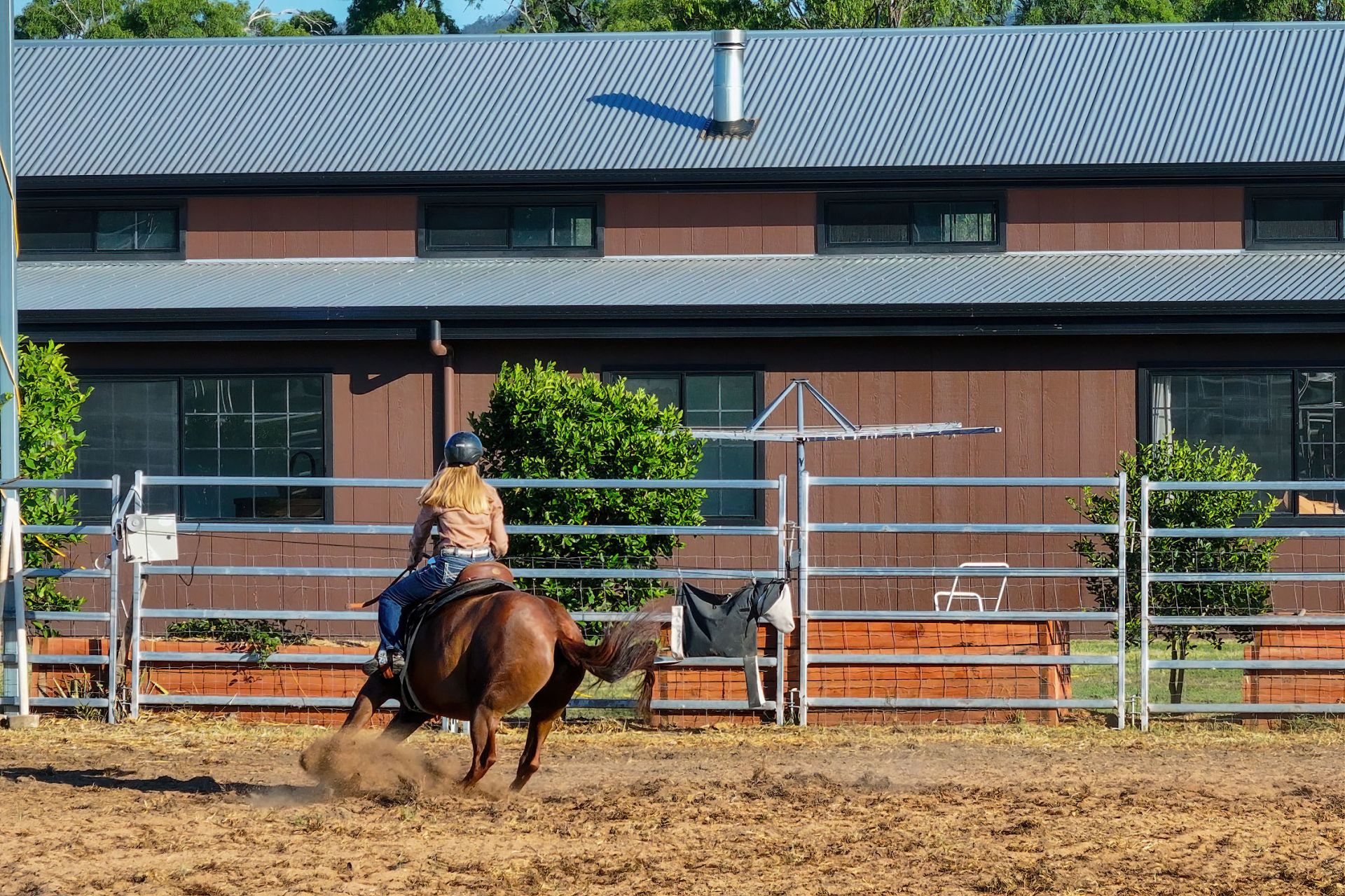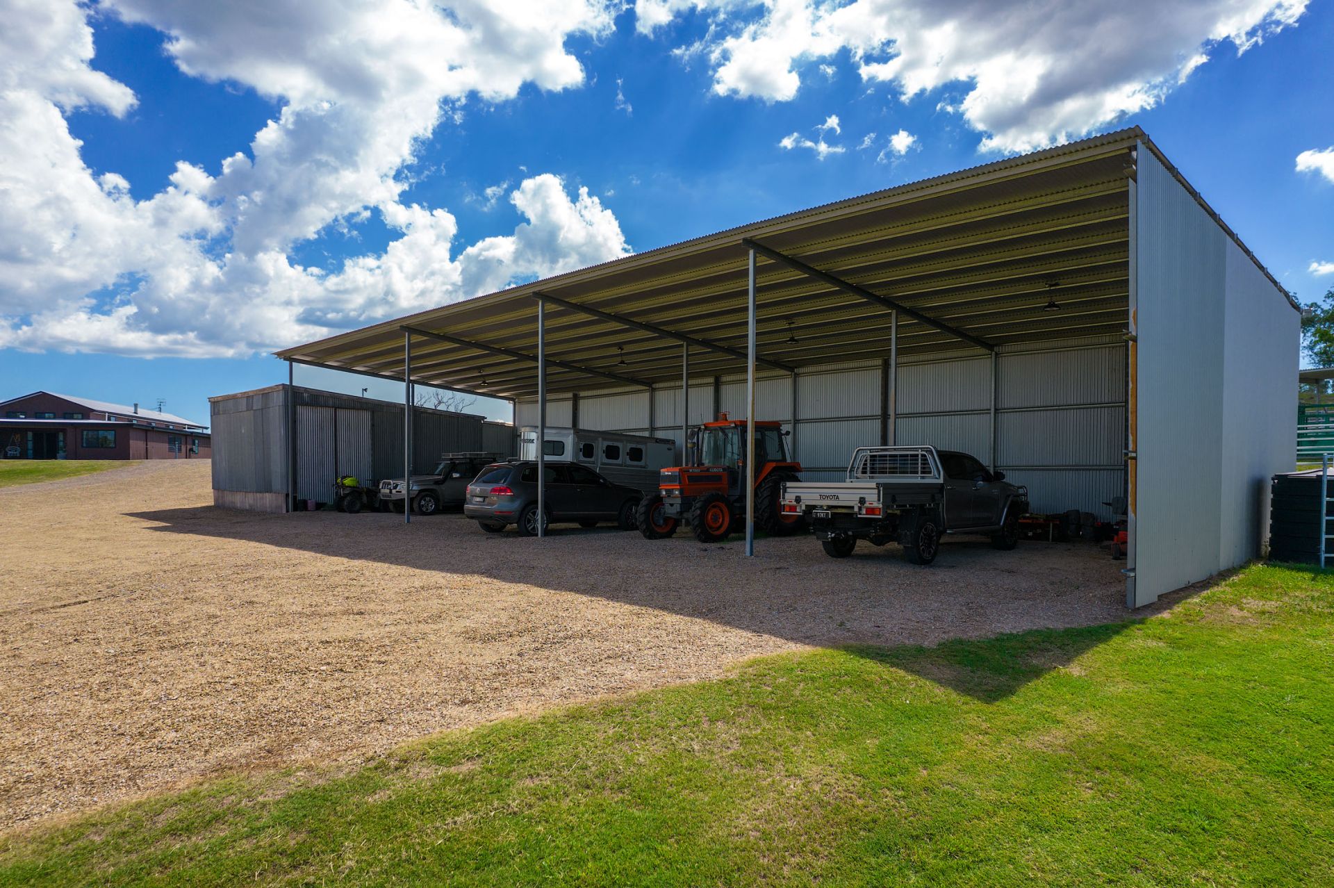 Fenced into 9 horse paddocks featuring timber split posts with 4 strand electric and concrete waters troughs to all, Full sand arena and cutting pen under lights, Enclosed tack room, 7 x day stables