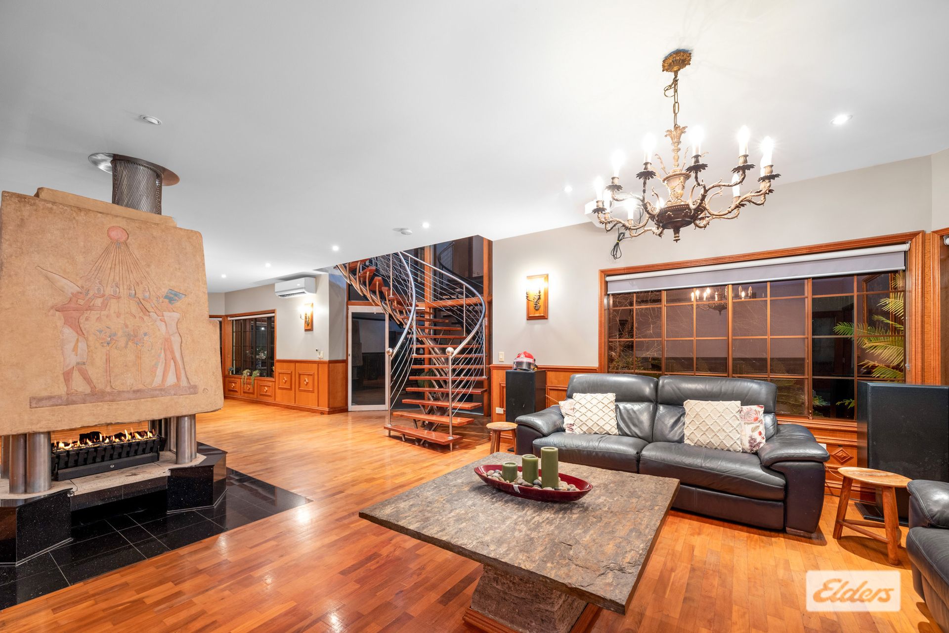 Revel in the ambiance of a unique gas fireplace, complemented by a bespoke architecturally engineered staircase, Spanish brass chandelier, and a glass pane entrance that adds modern flair and sophistication to this exquisite property.