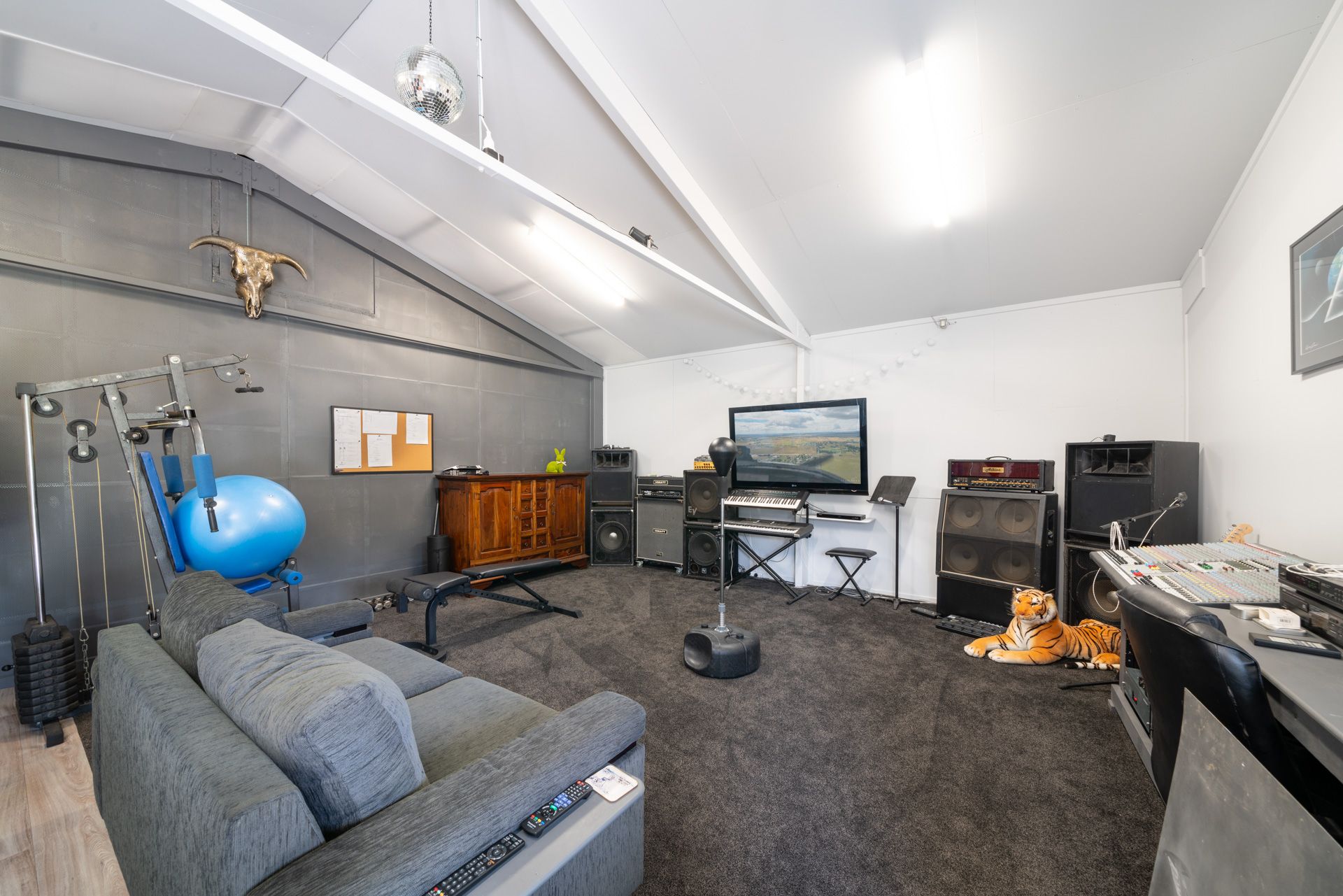 1 x shed at 8m x 12m (half a 2-car garage, half a teen retreat)