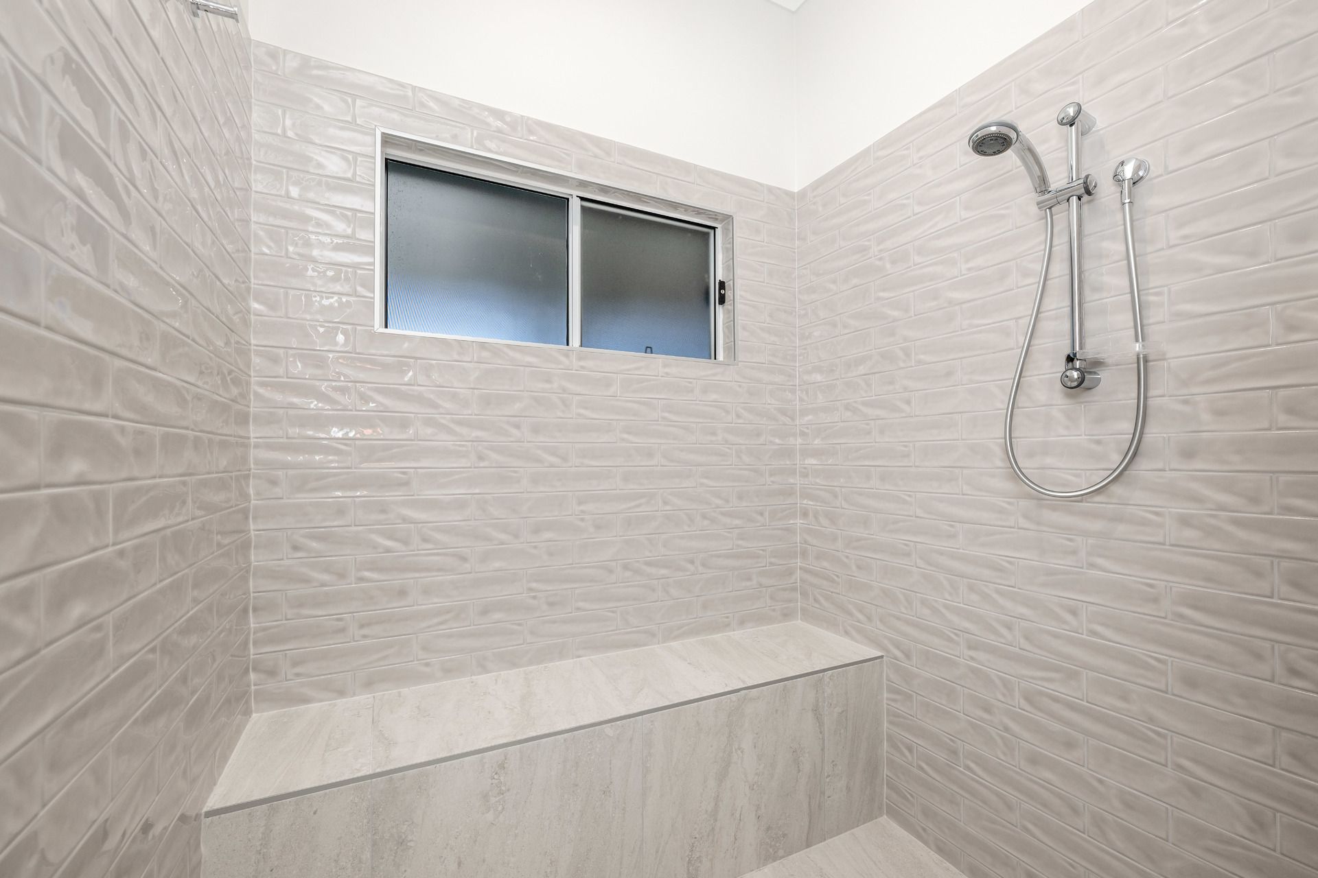 *Main bathroom offers tiled seat in the shower, tiled niche & floating stone top vanity