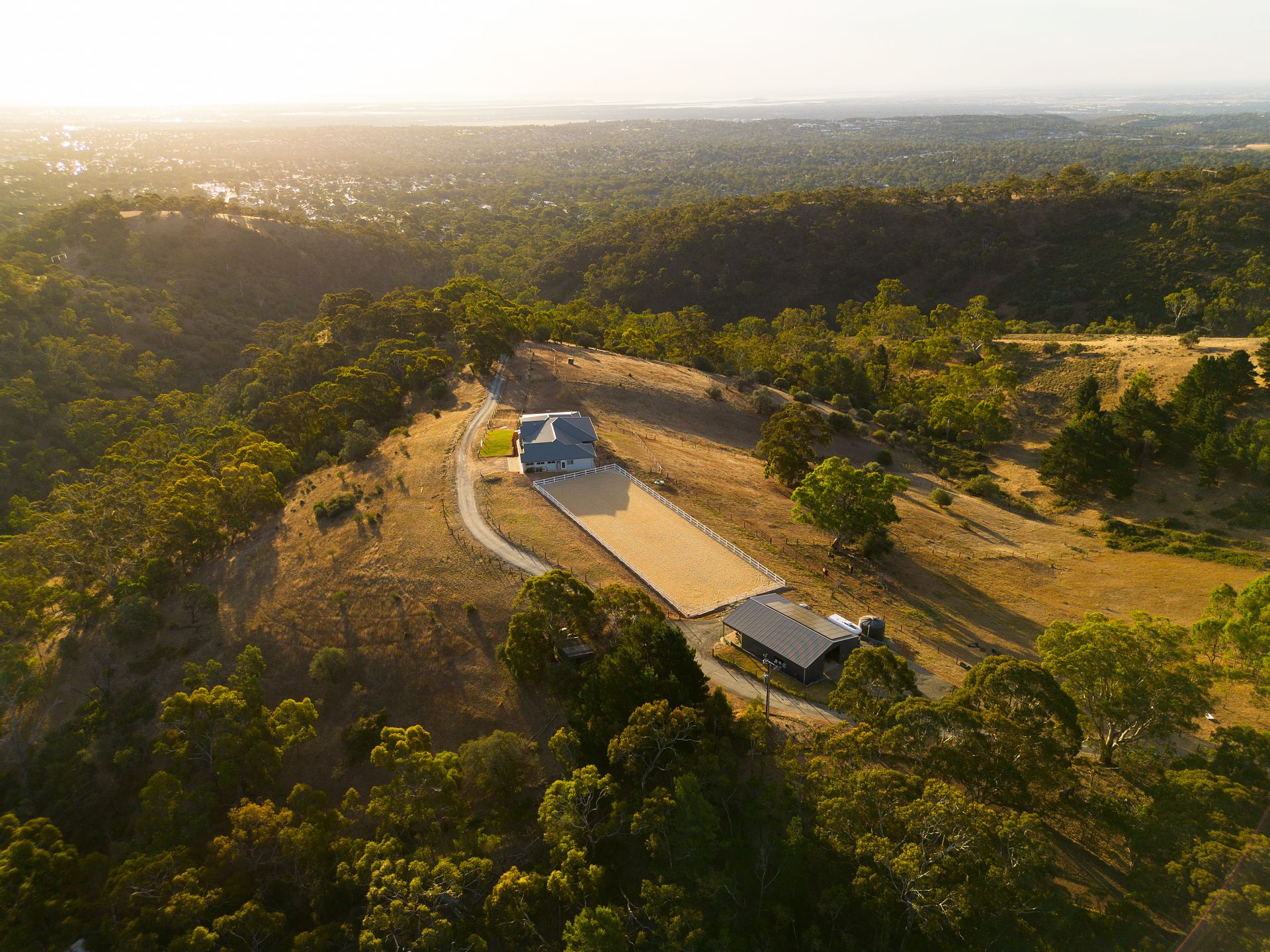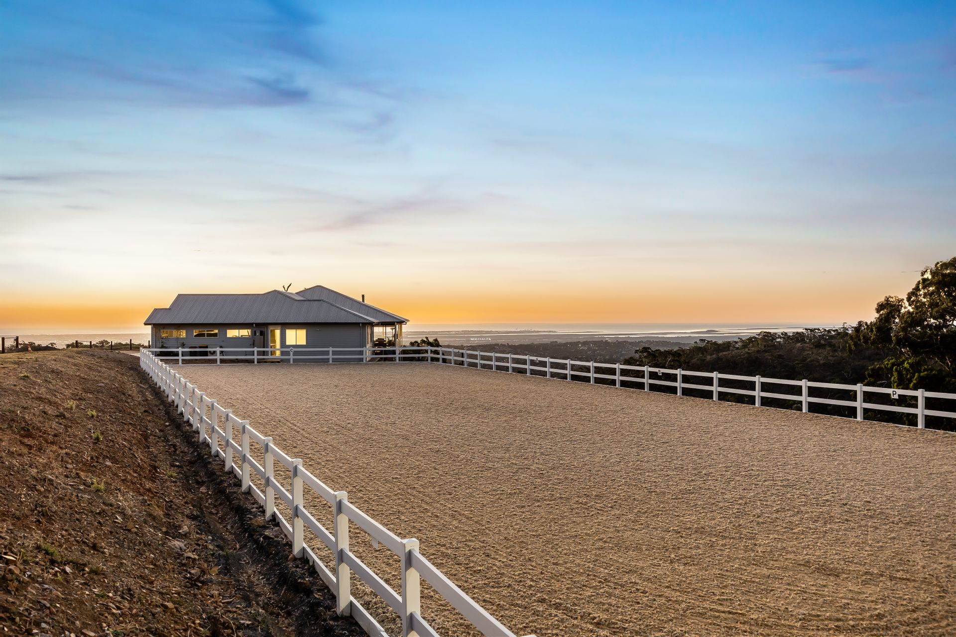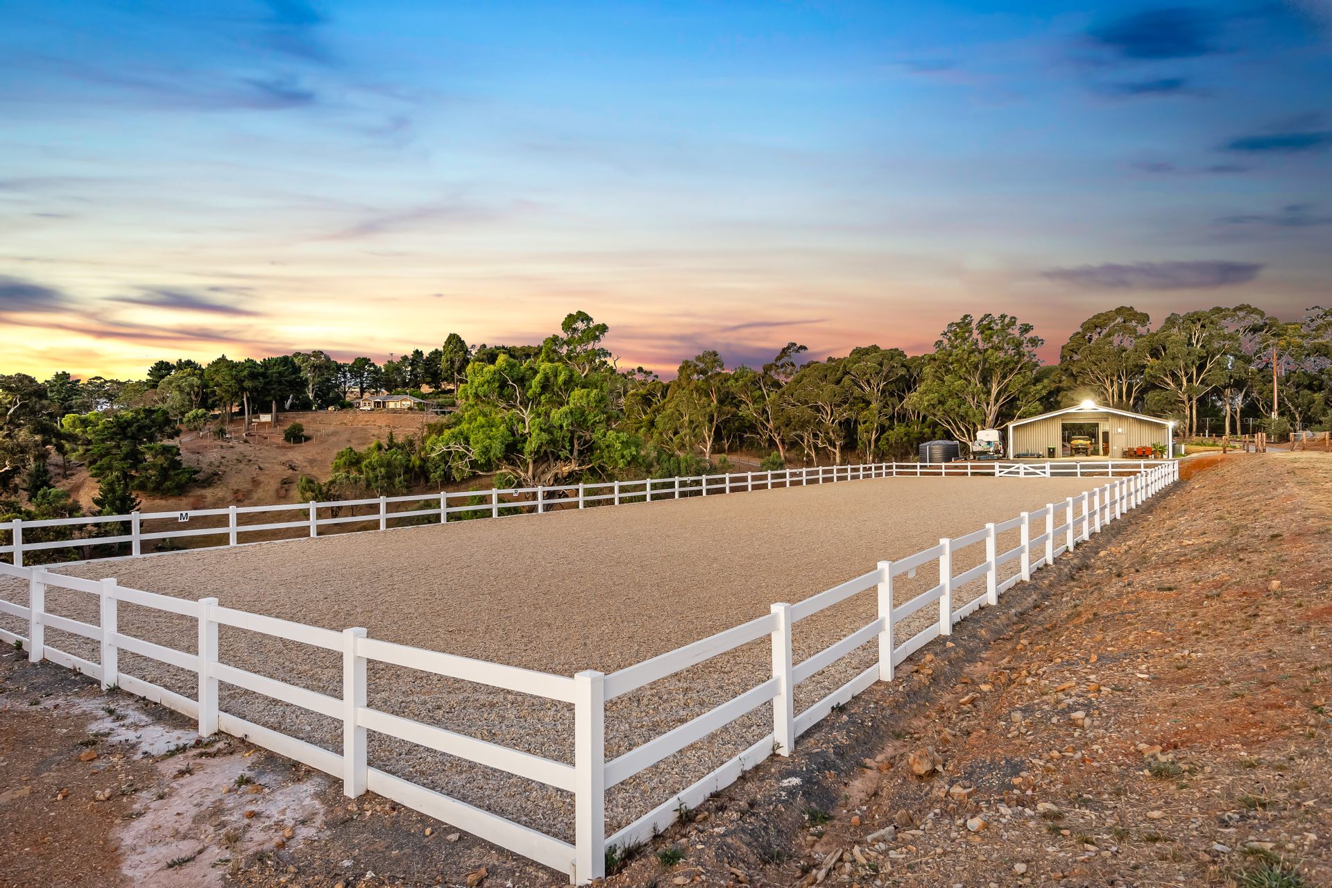 • 60x20m horse arena constructed by Oakwood Recreation and Landscaping with power, flood light, cameras, Soiltex and sand surface, and Polvin PVC fencing with 20-year warranty.