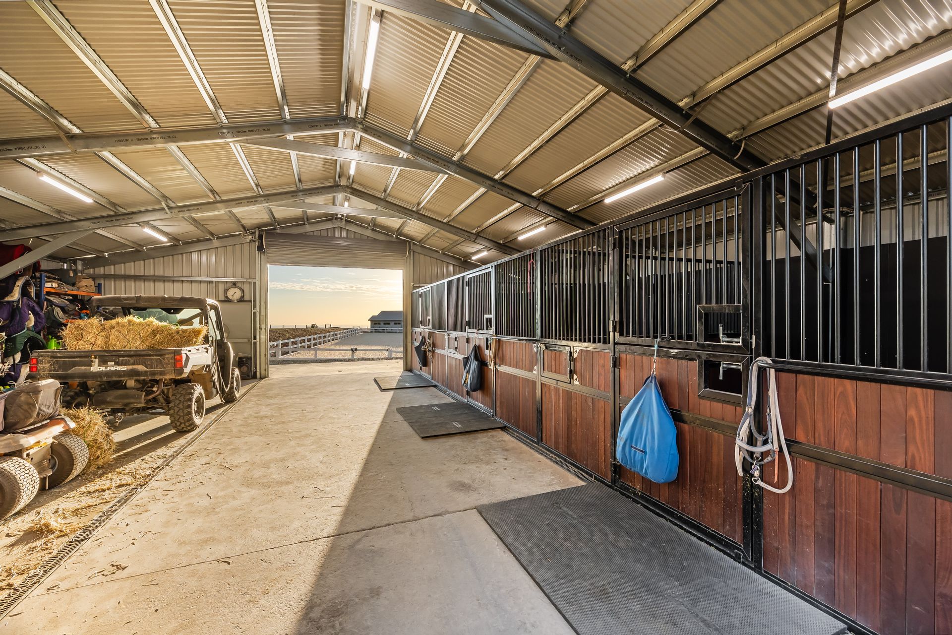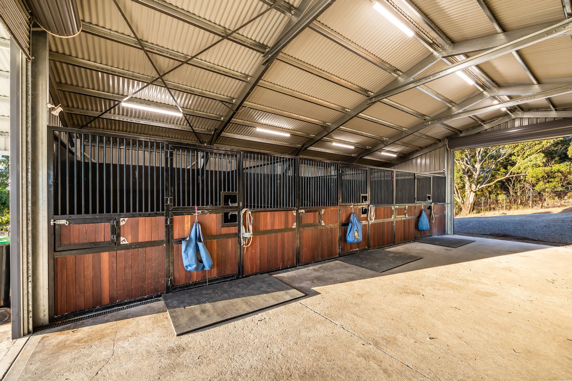 • Large powered shed/stables with dual electric roller doors, electric hot water service and horse wash, three 4x4m Jarrah stables designed by Equine Stables Designs with removable SureFoot matting, and adjacent parking for float and trailer