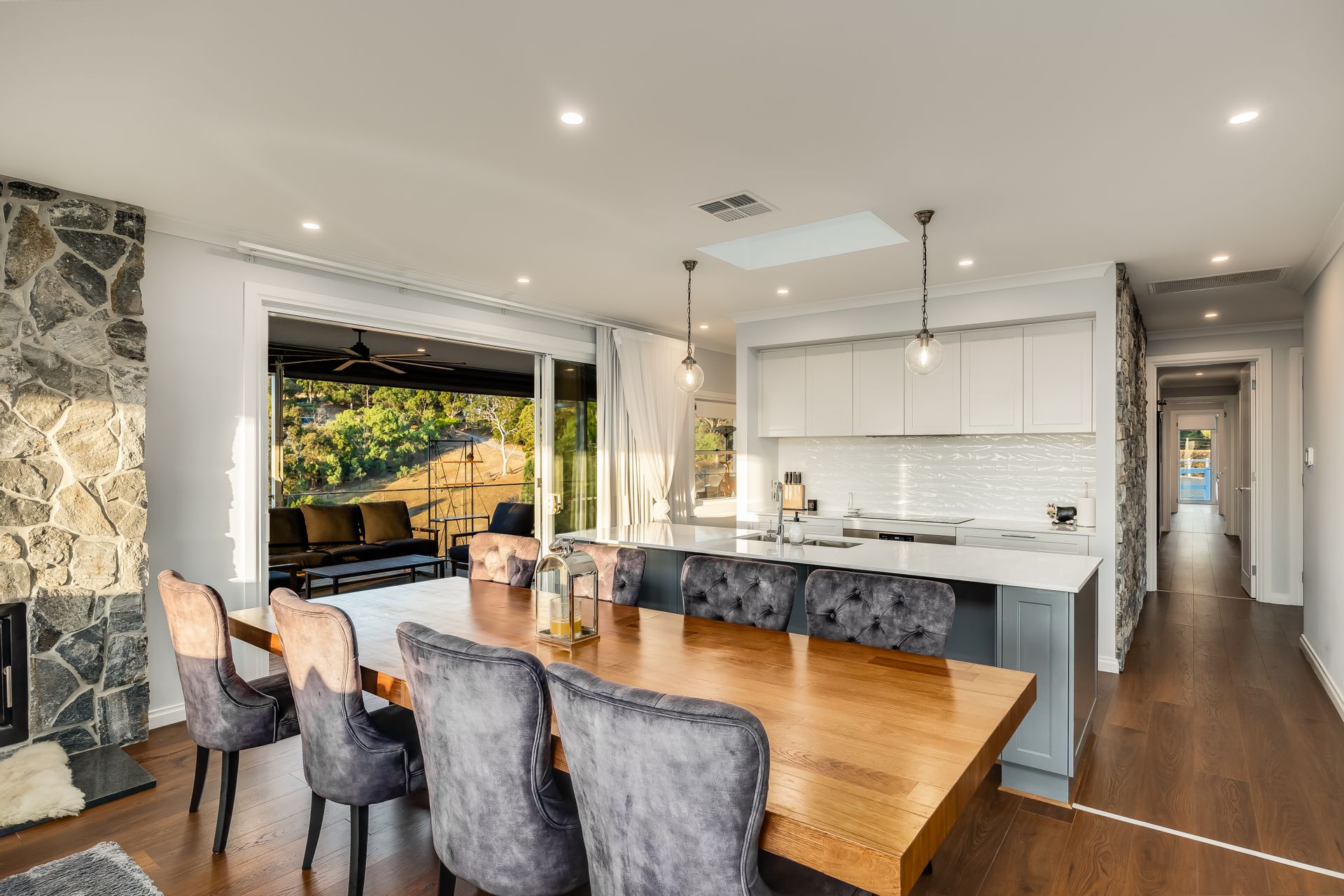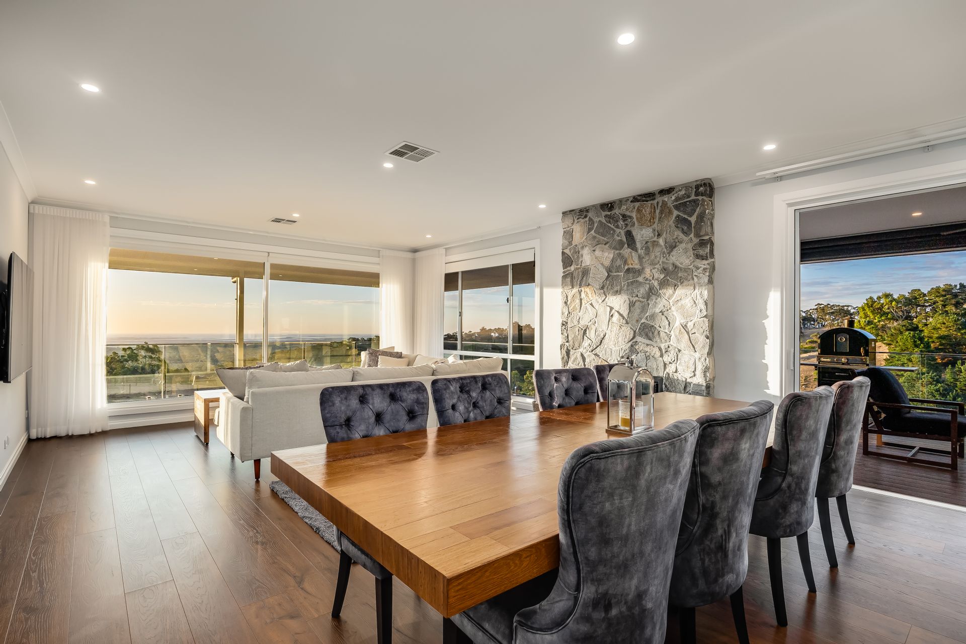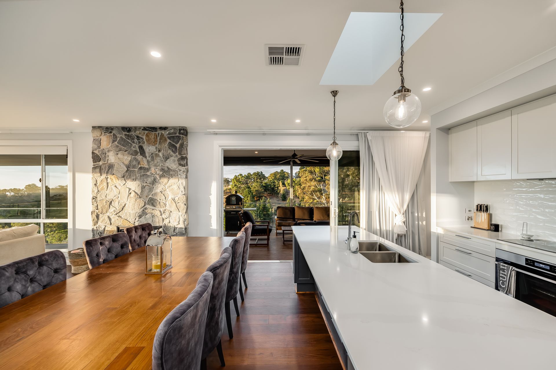 The heart of the home is its open-plan living space, anchored by a gourmet kitchen featuring a large 'Calcutta gold' stone island bar and top-of-the-line Westinghouse appliances. This space seamlessly transitions to the alfresco dining area on the wraparound balcony, equipped with all-weather blinds and ceiling fans, making it perfect for year-round entertaining. Inside, the cosy lounge with a feature wood fire set in hand-laid stone provides a warm and inviting atmosphere during cooler months. With its combination of luxury, functionality, and breath taking surroundings, this property is designed to offer an opulent yet grounded living experience in the picturesque setting of Upper Hermitage.