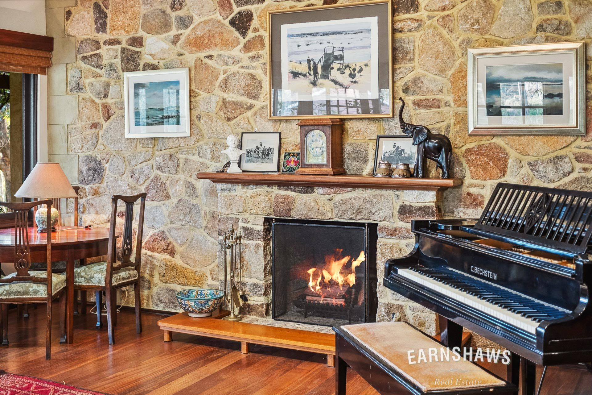 North and south facing family room with cosy wood fire, raked ceilings & abundance of natural light through large windows & double French doors opening onto courtyard and timber deck