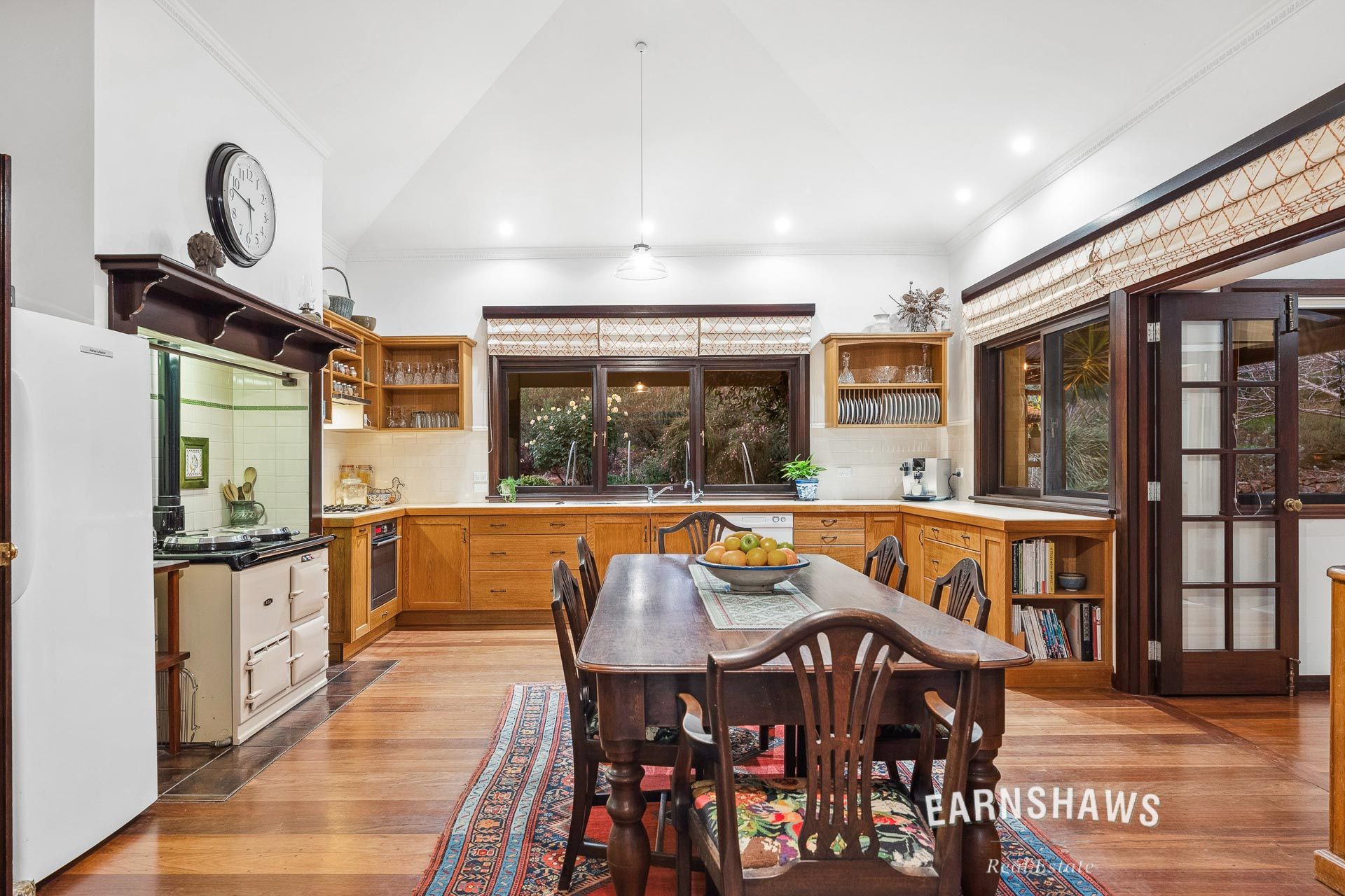 Large, country style kitchen with gas-fired AGA cooking range, magnificent views, polished timber floorboards, raked ceiling, pendant & downlight lighting & timber French doors