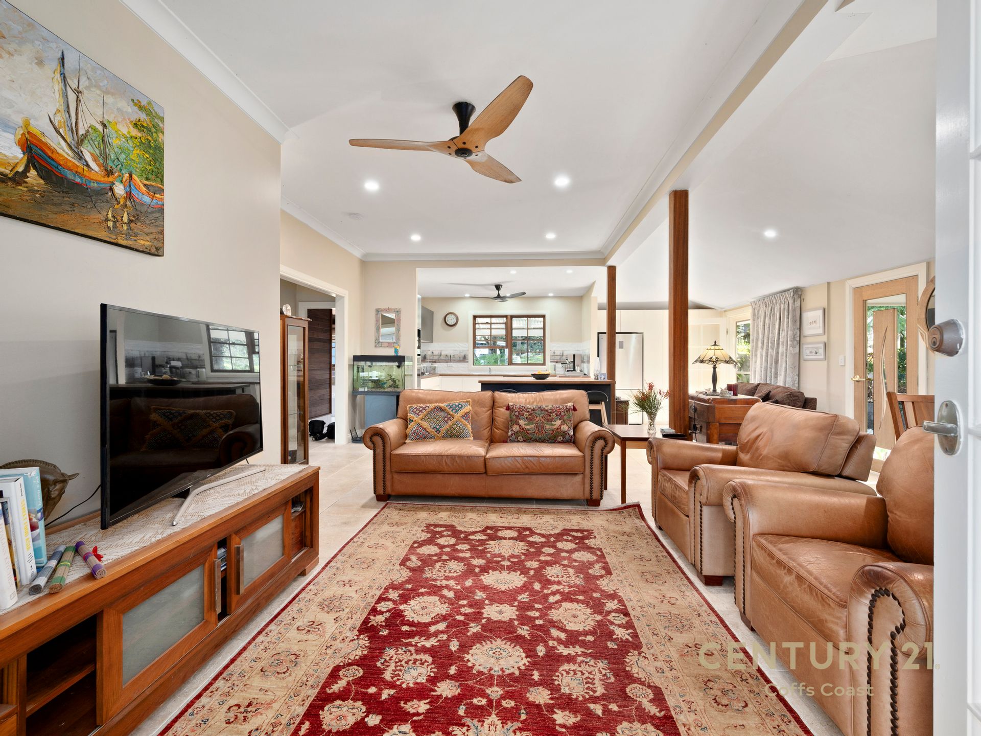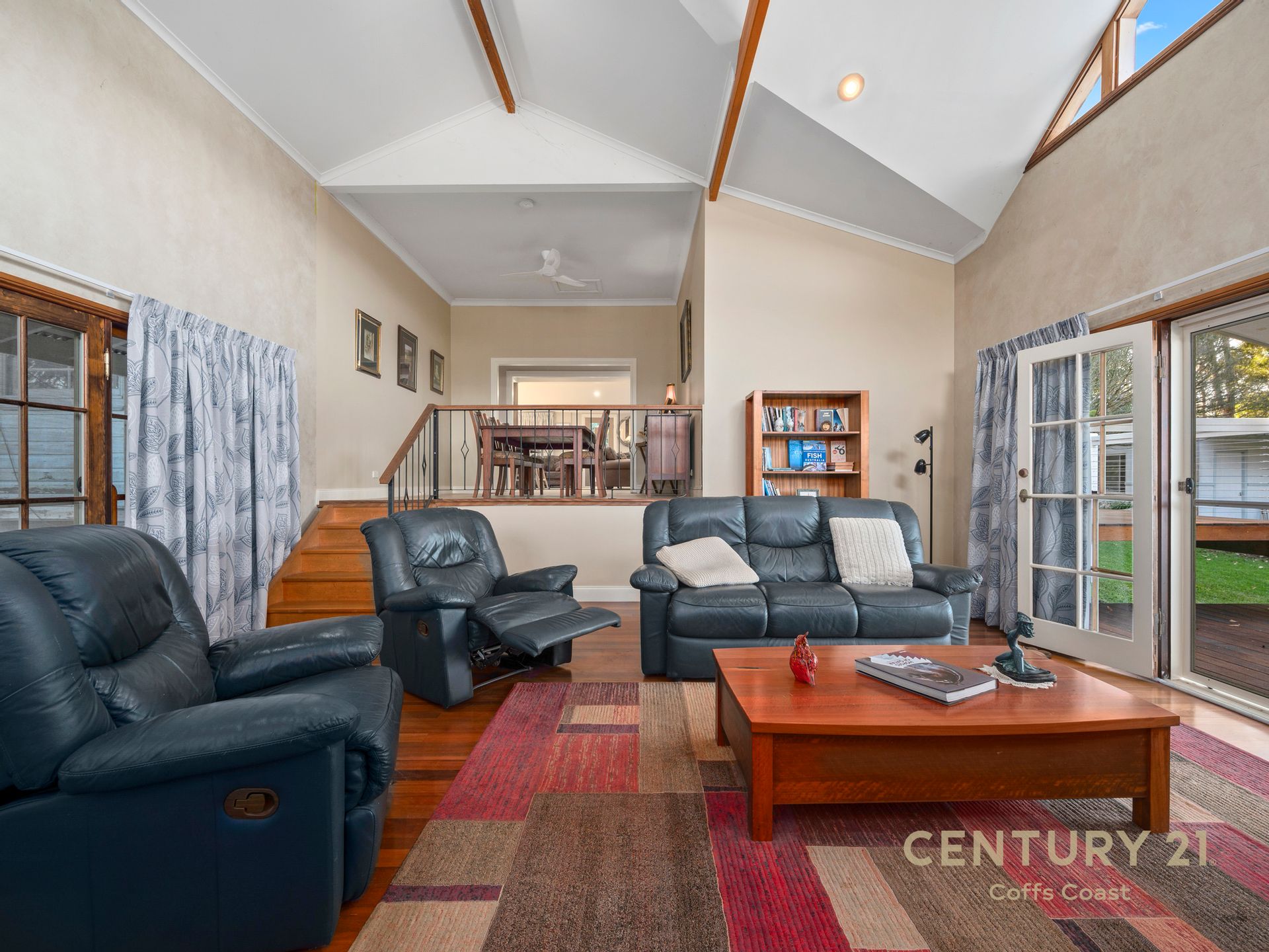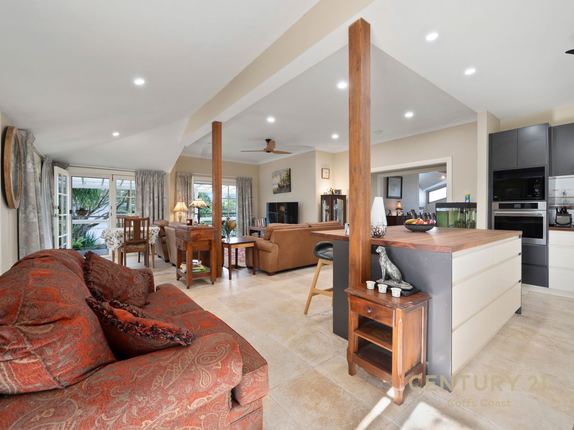 Spanning generously proportioned split levels, the residence boasts four bedrooms, each with veranda access, an open-plan kitchen and dining area, 2 bathrooms, and four luxurious living areas.
