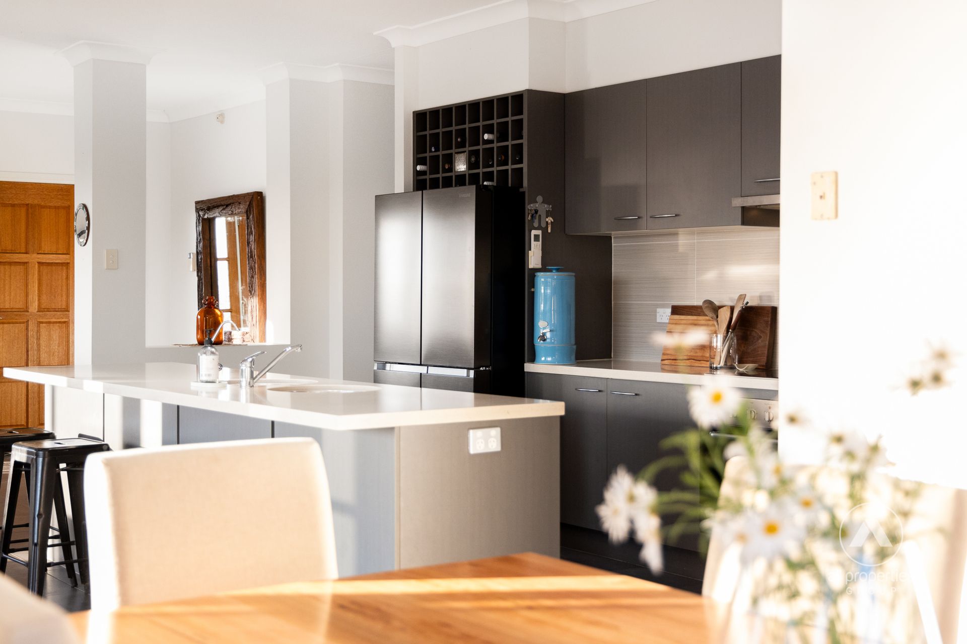 At the heart of this residence is a gourmet kitchen, a chef's dream with its expansive 40mm Caesarstone benchtops, premium appliances, and ample storage space. The layout not only offers the perfect environment for culinary creativity but also frames stunning views, ensuring that every meal preparation feels inspired by nature.