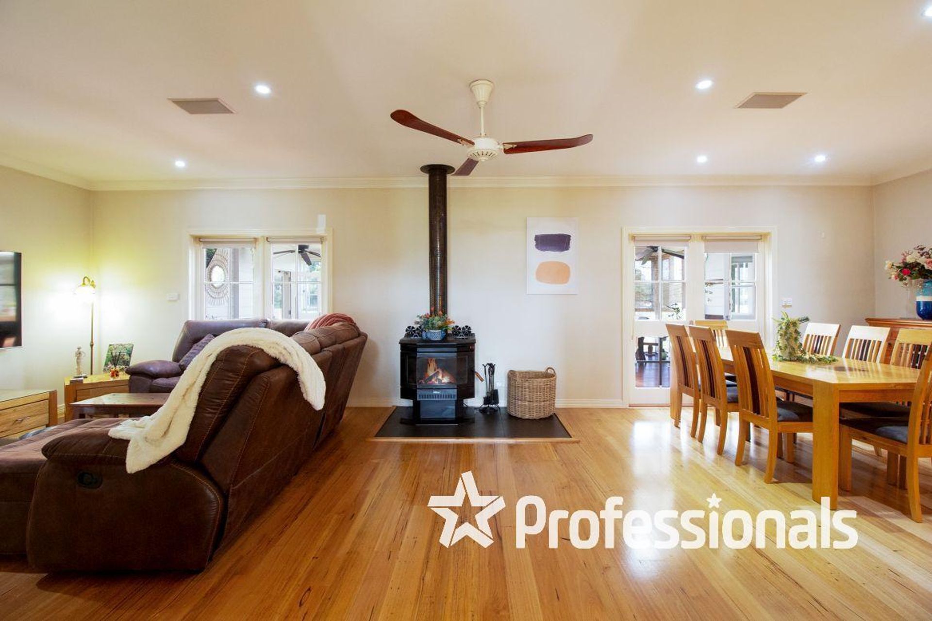 The separate formal family dining room provides space to relax by the solid fuel heater, which radiates warmth through all bedrooms, four of which have built-in robes.