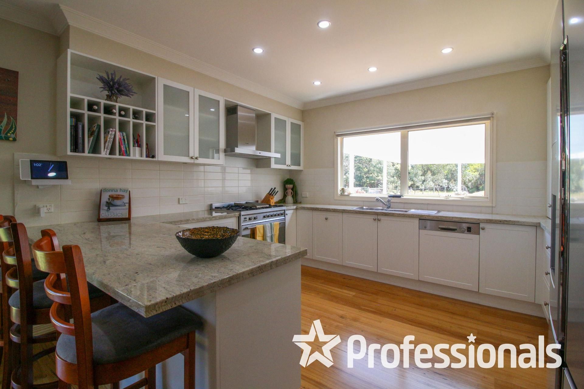 The well-appointed kitchen features expansive Indian granite benchtops, a walk-in pantry, and quality gas/electric appliances, overlooking an open-plan lounge and dining area. French doors lead out to an enclosed alfresco area, perfect for year-round entertaining.