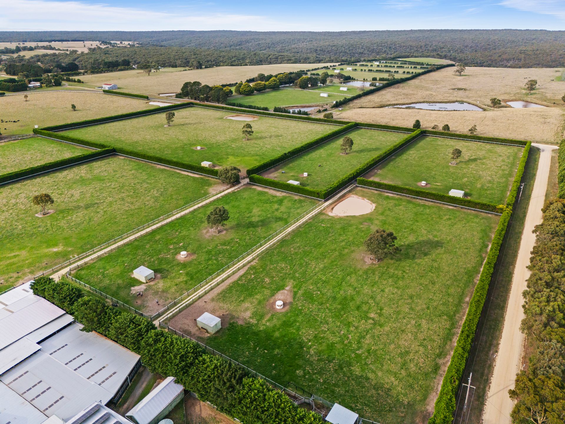 • 12 large paddocks, 25 smaller paddocks all with raised troughs & shelter sheds.