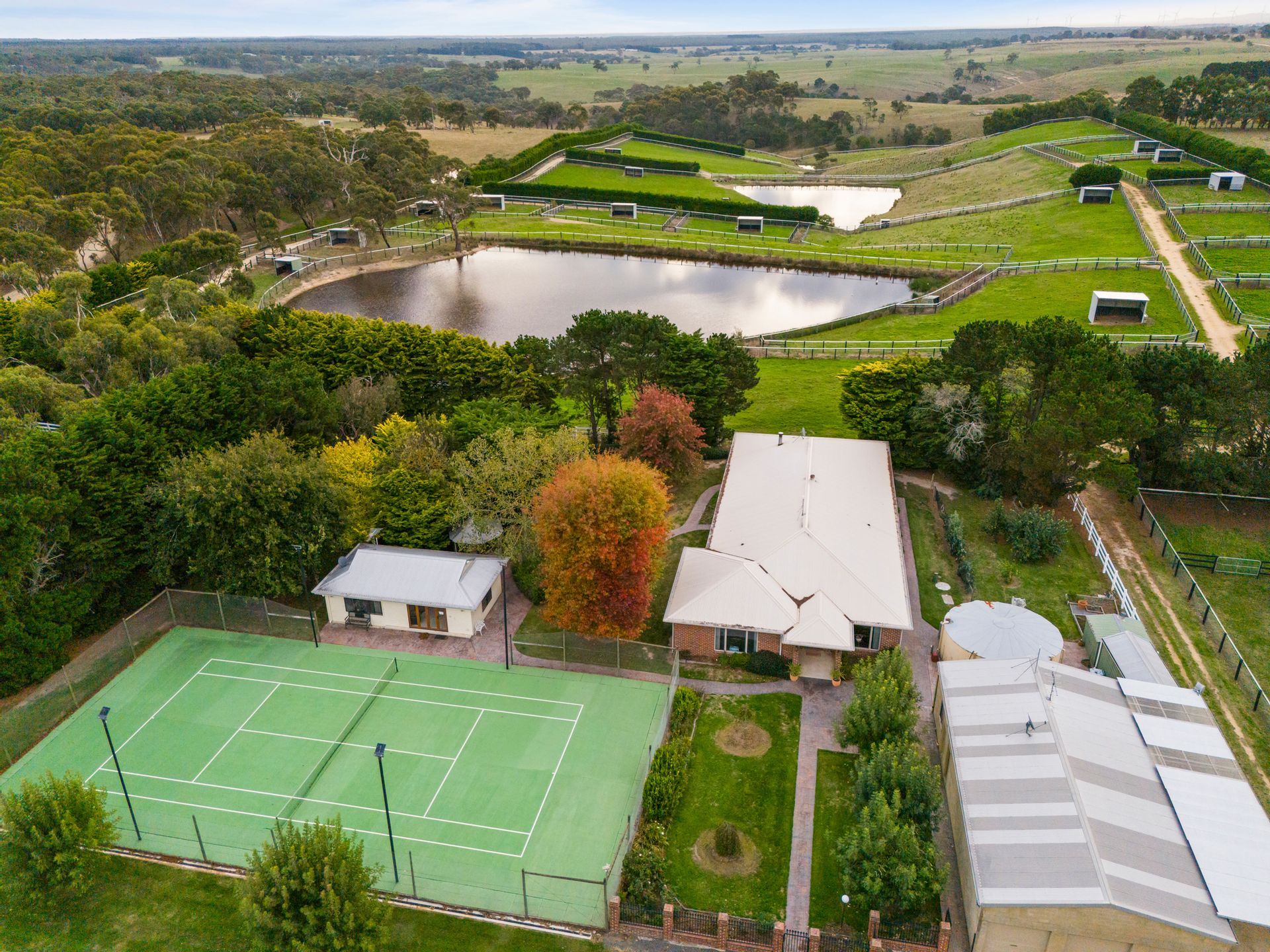 Coupled with a beautifully appointed home, flood lit tennis court with club room incorporating gymnasium, significant stable complex and network of paddocks with shelter sheds all interconnected with excellent laneways.