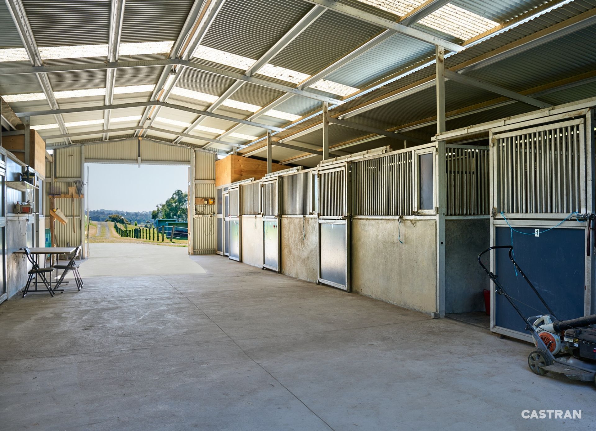 For equine enthusiasts, the property is exceptionally well-appointed and has top-tier infrastructure. The extensive improvements include multiple improved paddocks, a fully lit horse arena with power and water, and a surrounding exercise/trotting track complete with a large water feature/dam. There is also a round yard and well-maintained stables, complete with a bathroom, laundry facilities, tack room, outdoor yards, and hay shed. The sealed driveway from Boundary Road ensures all-weather access to the main residence and stables. At the same time, the additional service drive allows access to the machinery shed, lower paddocks, arena and hay shed. The established gardens and three large dams add charm and practicality to the estate.