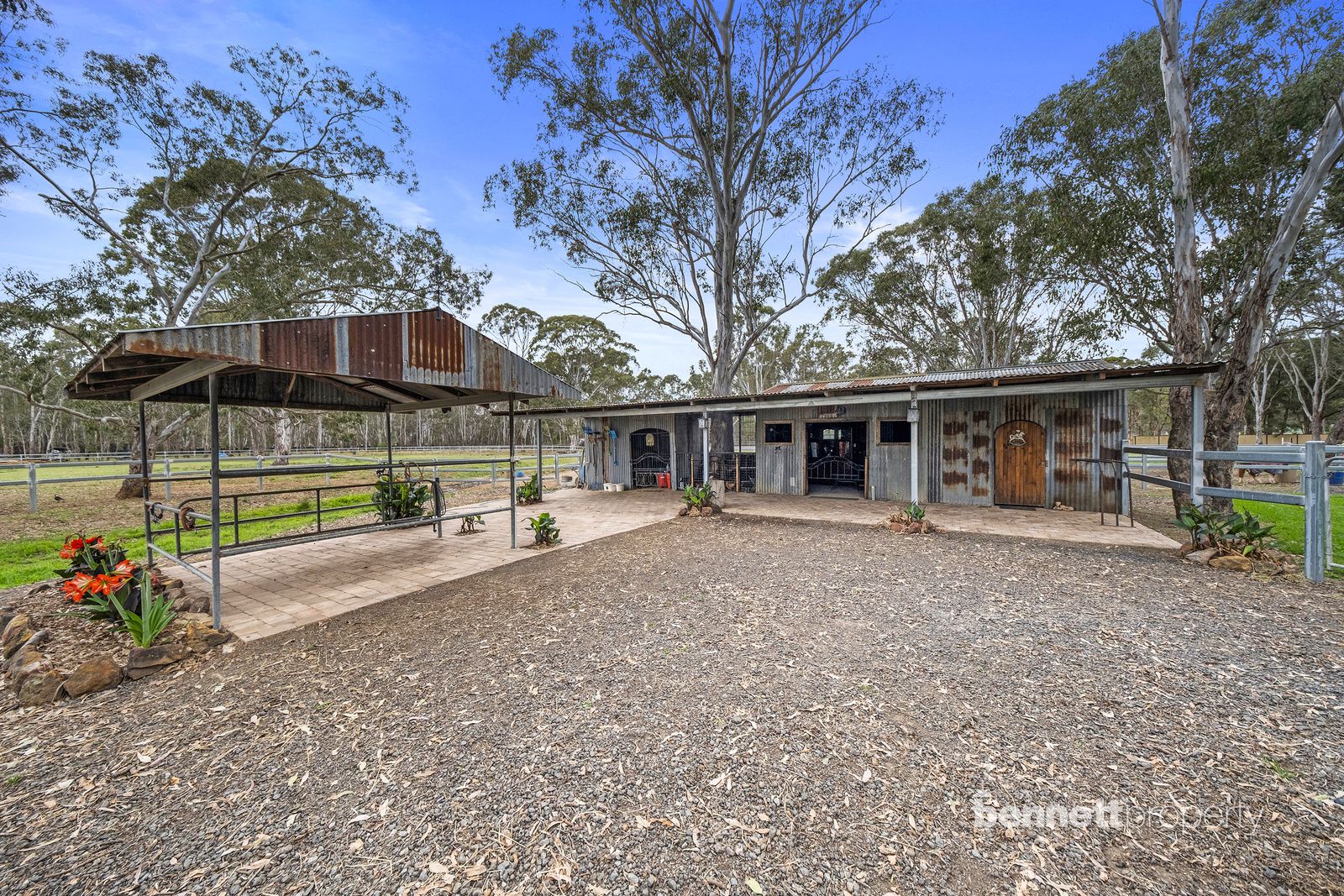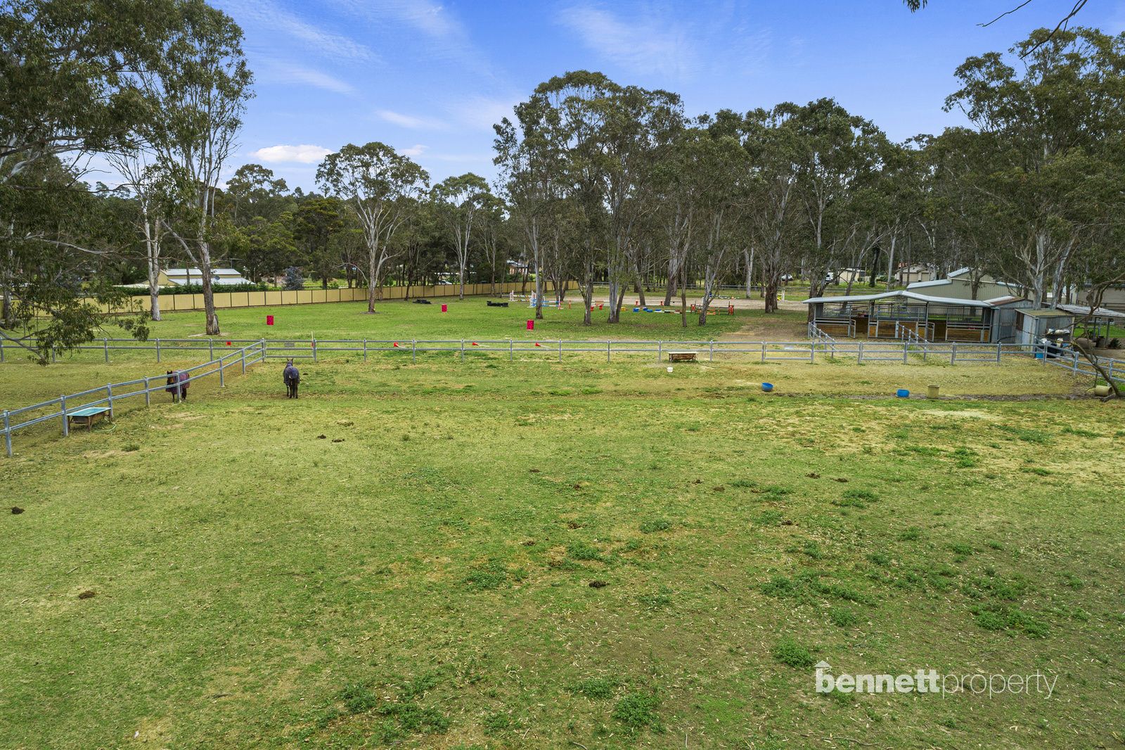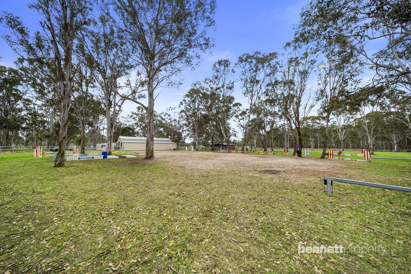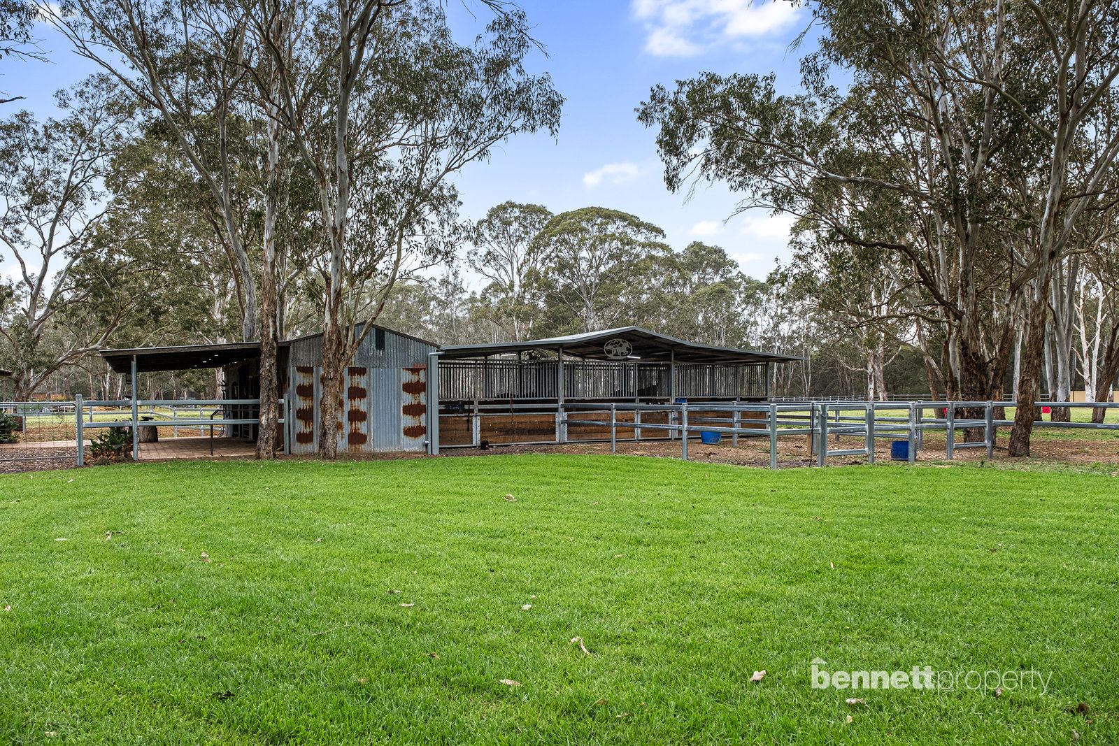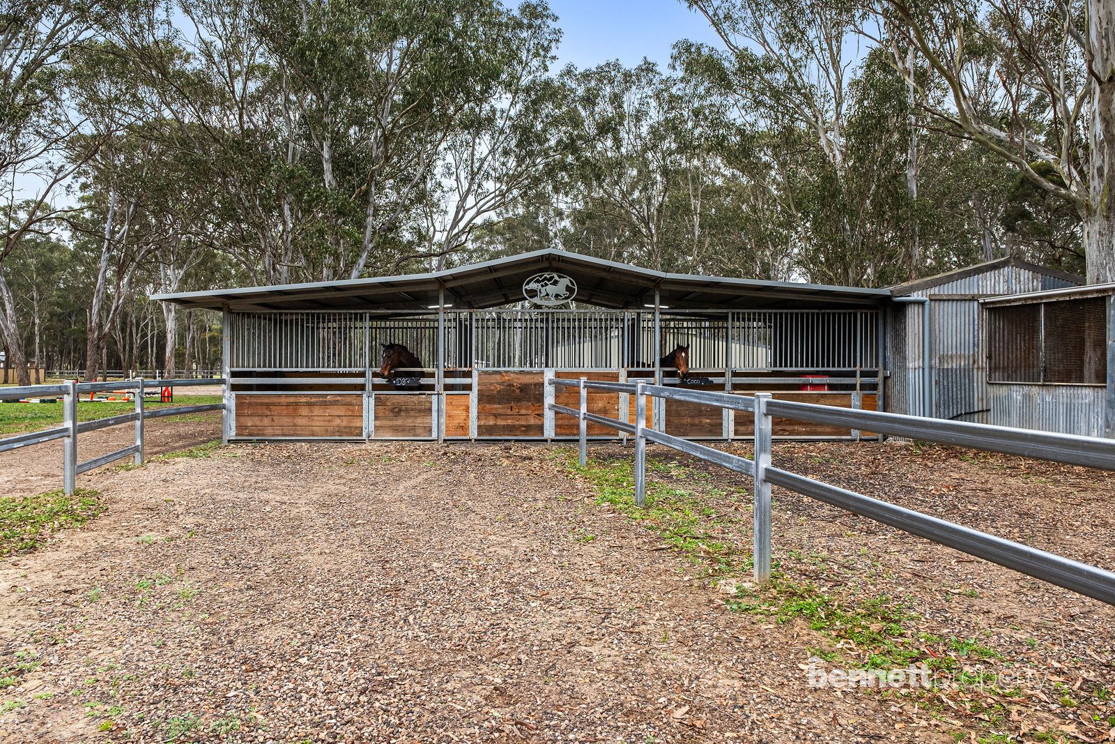 - 9 paddocks in total - all steel cattle post and rail fencing - 5 stables in total, 2 large mare and foal boxes, all with connecting day yards - All paddocks and stables are set up with automatic water troughs - Round yard, full size sand dressage arena with mirrors and lettering - Several level flat open areas for riding and exercising - Centrally positioned free standing shelter with automatic waterer