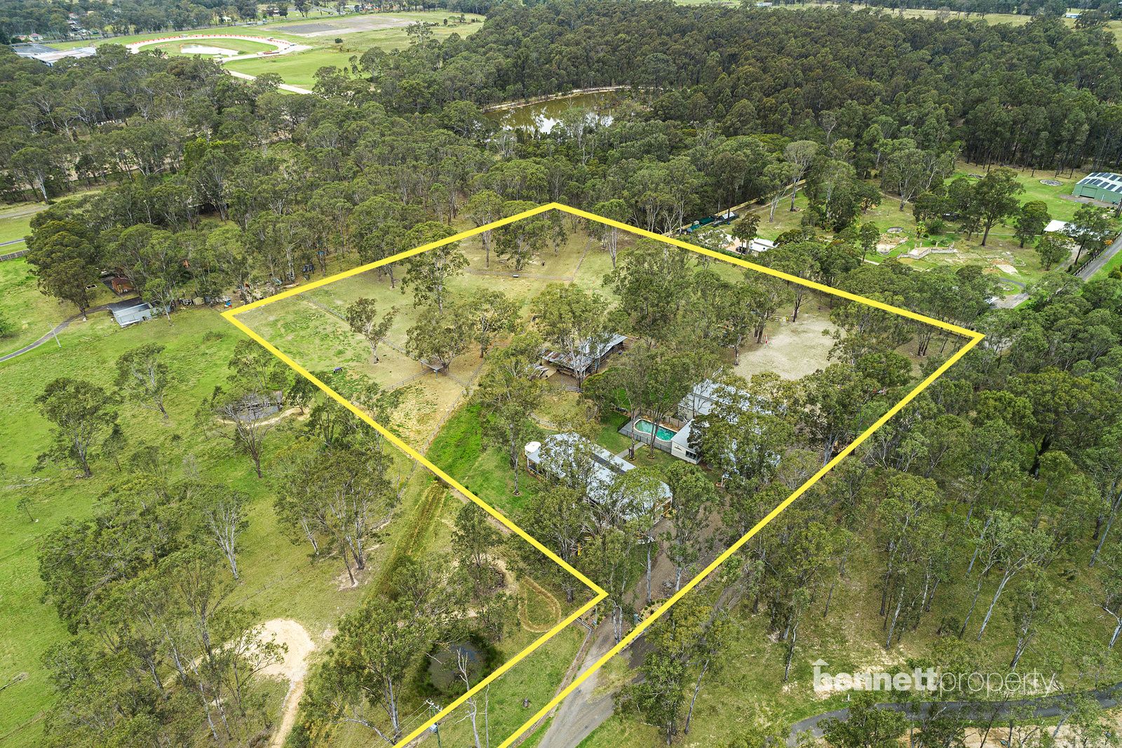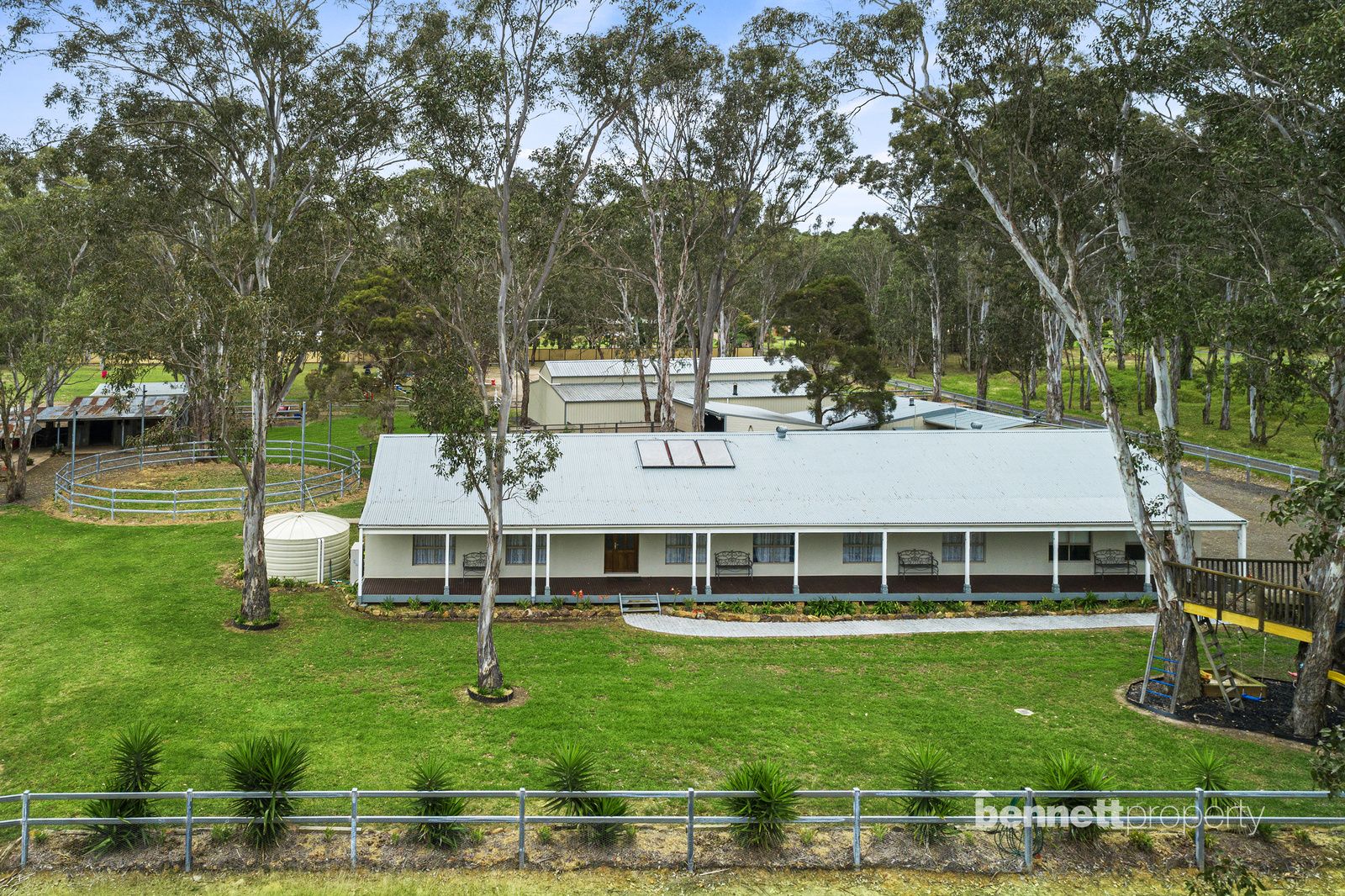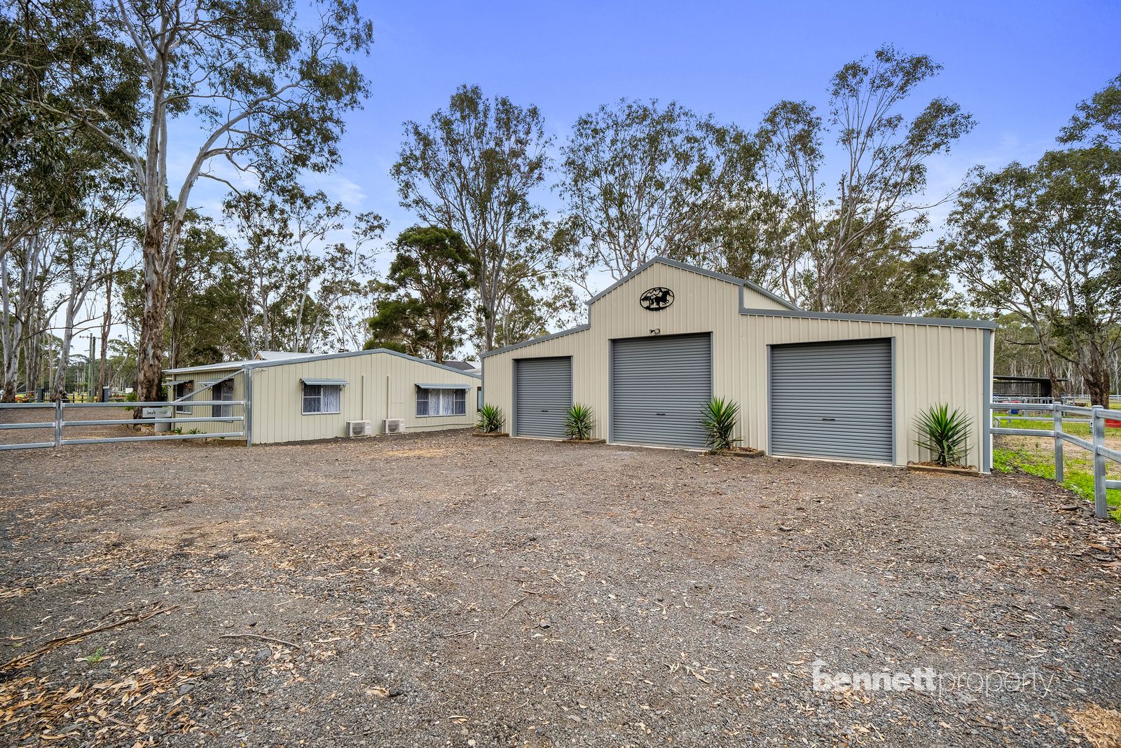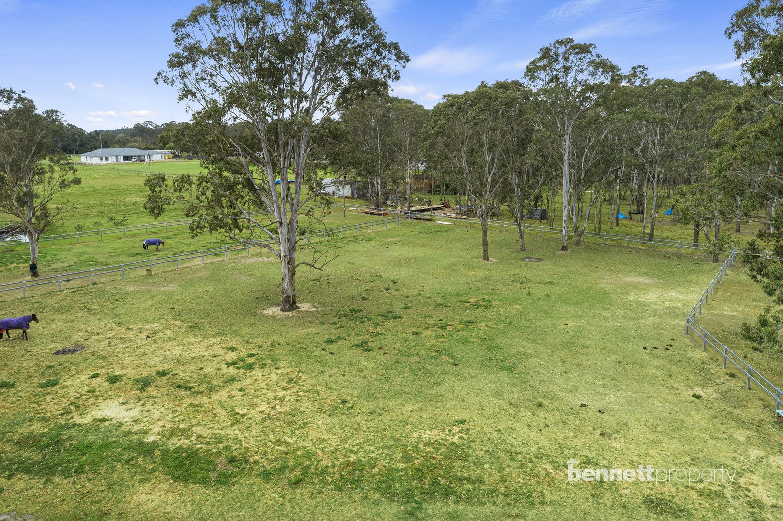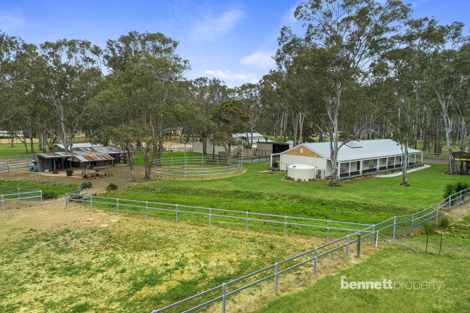 - 9 paddocks in total - all steel cattle post and rail fencing - 5 stables in total, 2 large mare and foal boxes, all with connecting day yards - All paddocks and stables are set up with automatic water troughs - Round yard, full size sand dressage arena with mirrors and lettering - Several level flat open areas for riding and exercising - Centrally positioned free standing shelter with automatic waterer