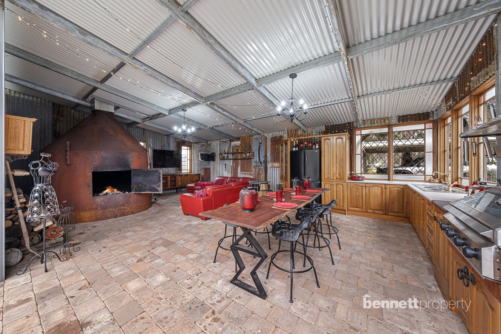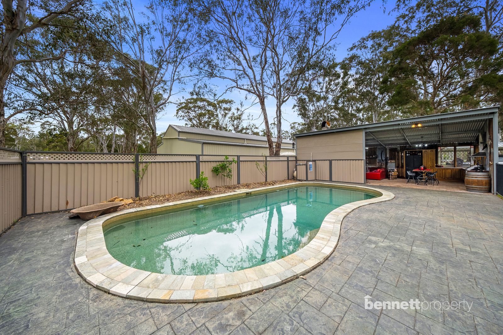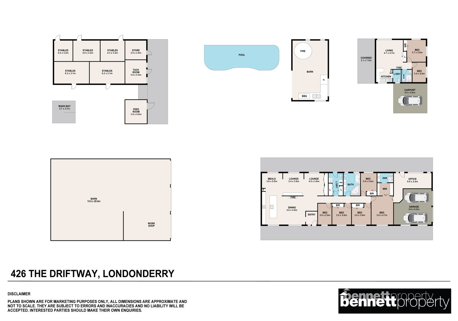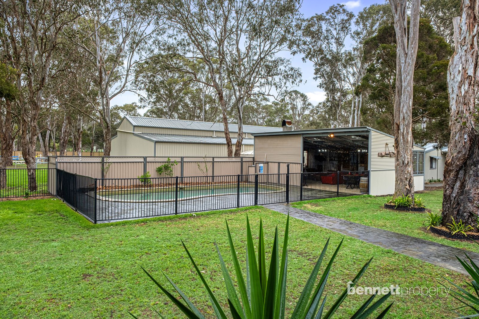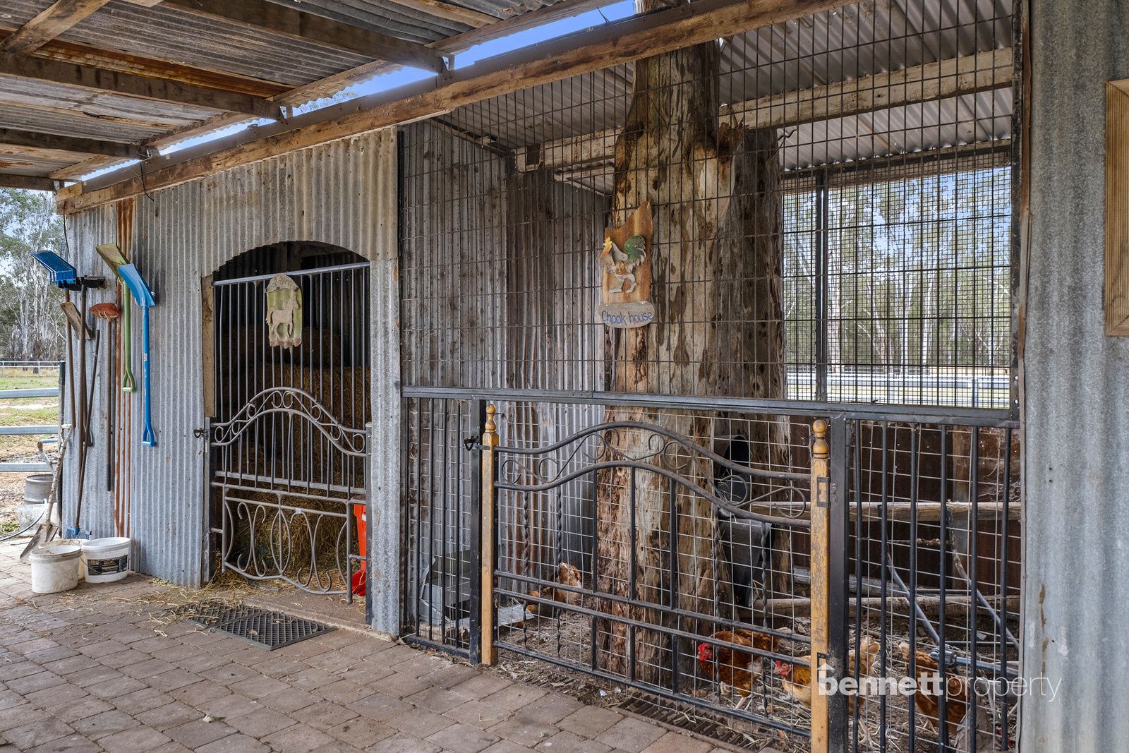 - 9 paddocks in total - all steel cattle post and rail fencing - 5 stables in total, 2 large mare and foal boxes, all with connecting day yards - All paddocks and stables are set up with automatic water troughs - Round yard, full size sand dressage arena with mirrors and lettering - Several level flat open areas for riding and exercising - Centrally positioned free standing shelter with automatic waterer