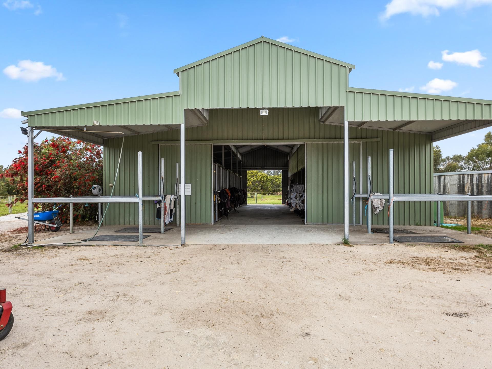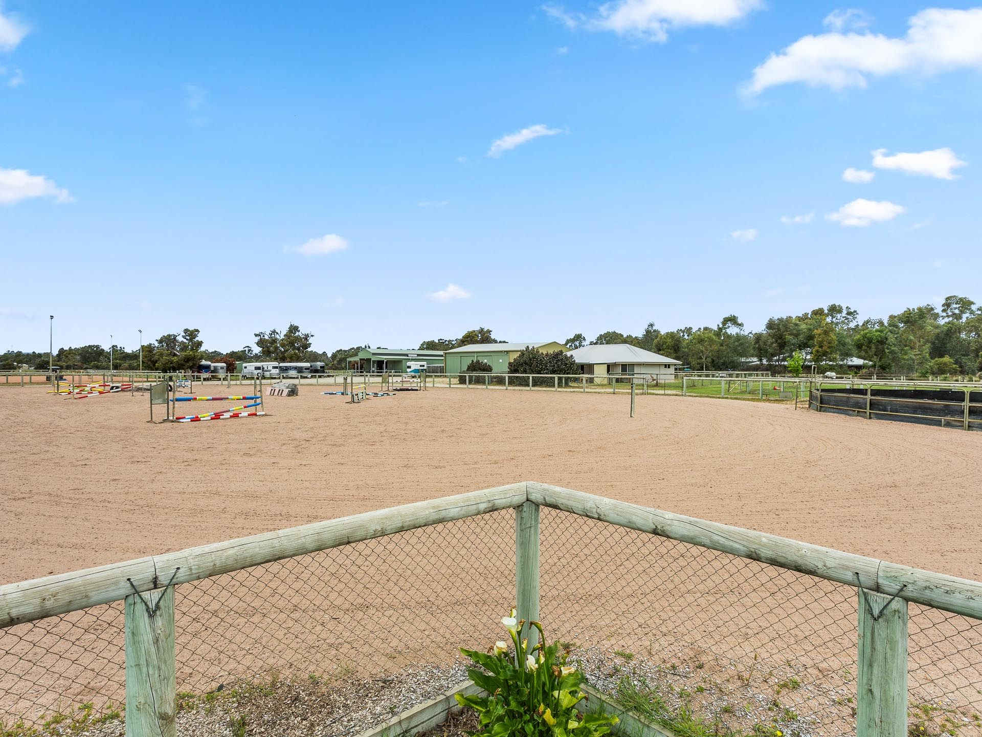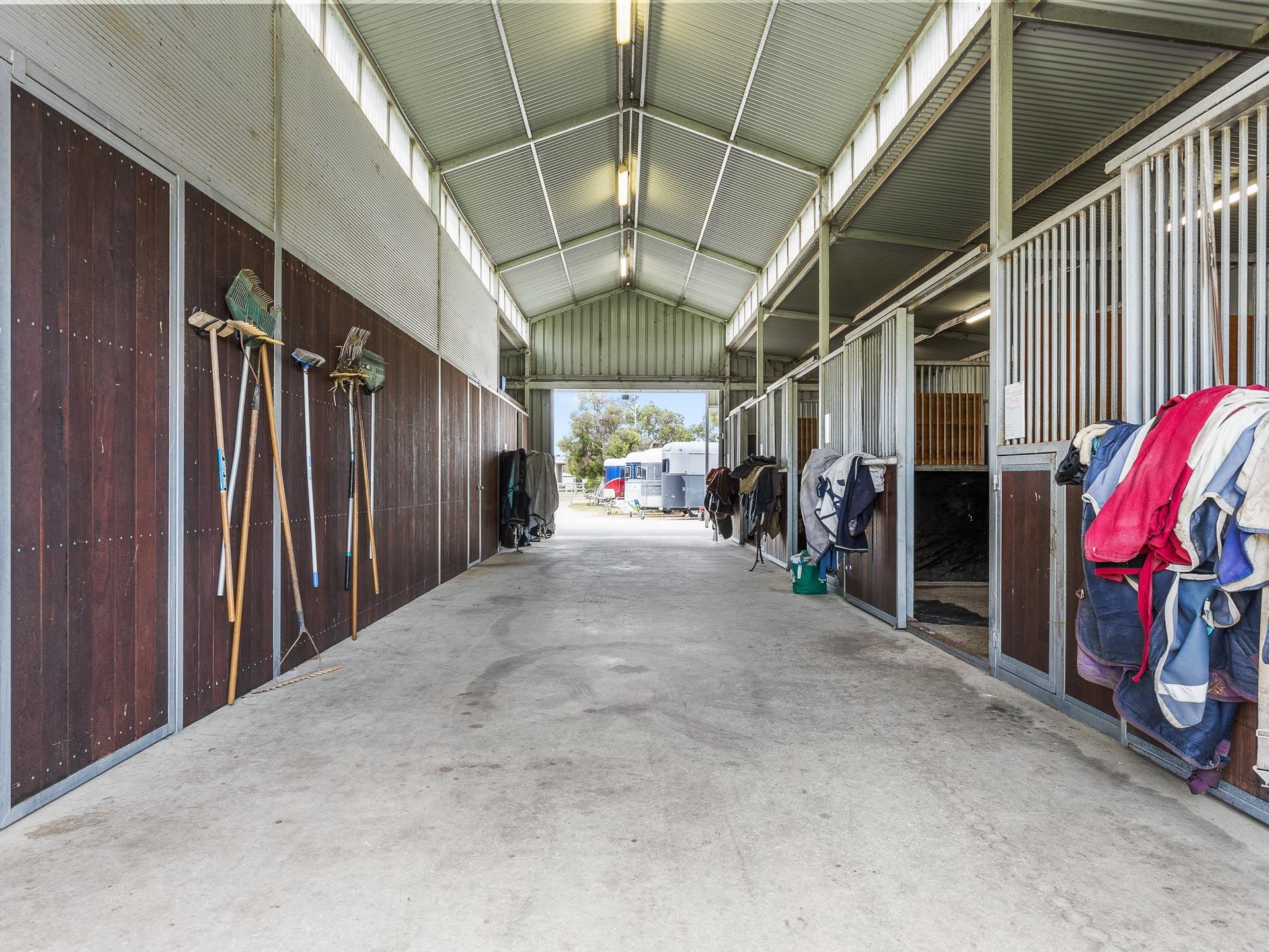 - 14 Steel framed stables, lighting on timers, troughs inside and outside - 20 x 13 feed shed with tack room including storage cupboards, shower, toilet, lunch room, washing machine - 22 paddocks purposely laid "dome" for excess water run-off allowing the horse paddocks to be the driest in the area - 65 x 25 limestone and riversand dressage arena under lights - 80 x 40 show jumping arena with round yard - 3 phase workshop - Septics with Filtrex system - Deep bore with licence for 14,000 kilolitres - 1x Concrete water tank (recently relined) - 1 x bore fed water tank - Fully reticulated property including all paddocks and residence - Electric fence with outriggers and hot wires - Electric gate with keypad - Security cameras - Parking for floats