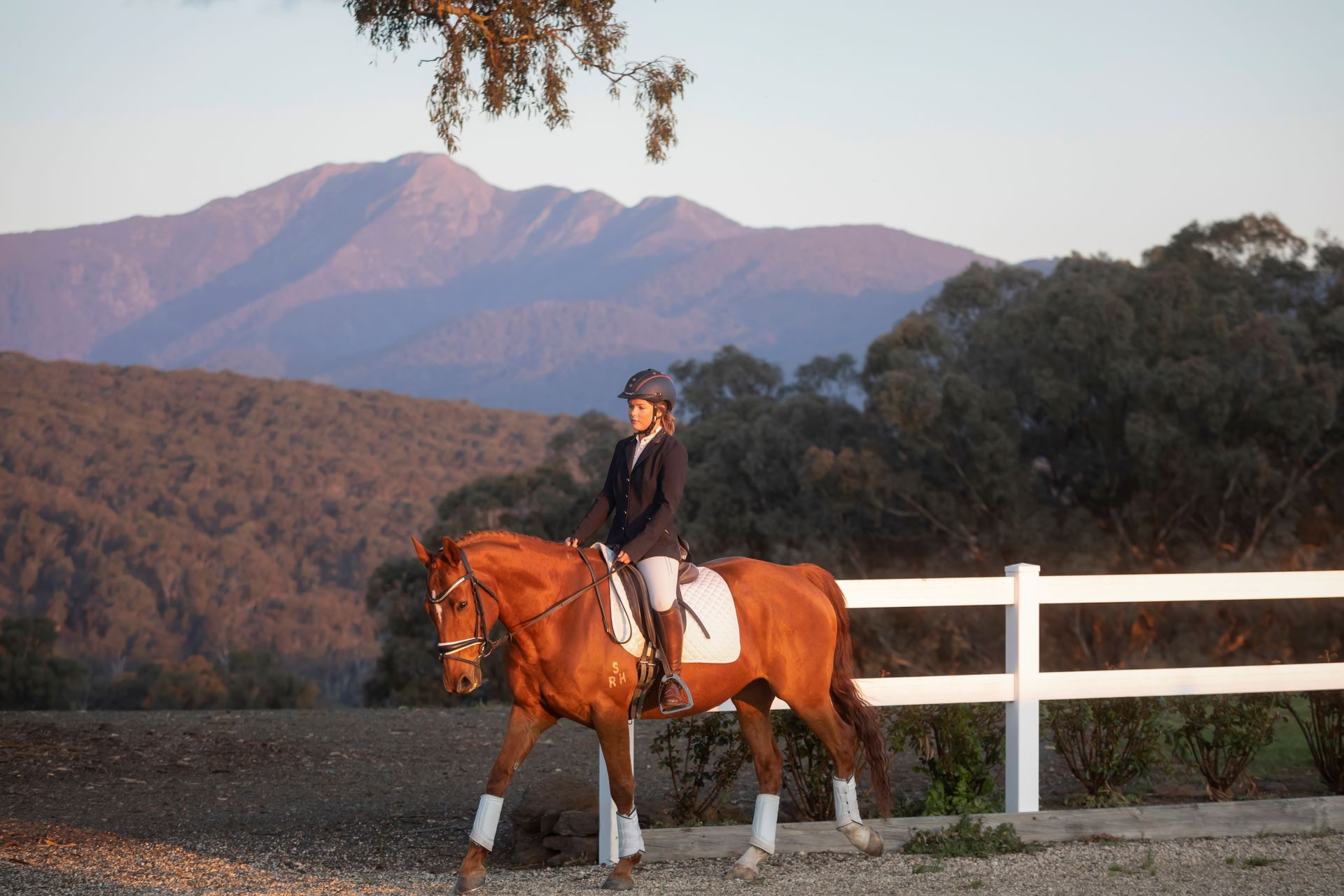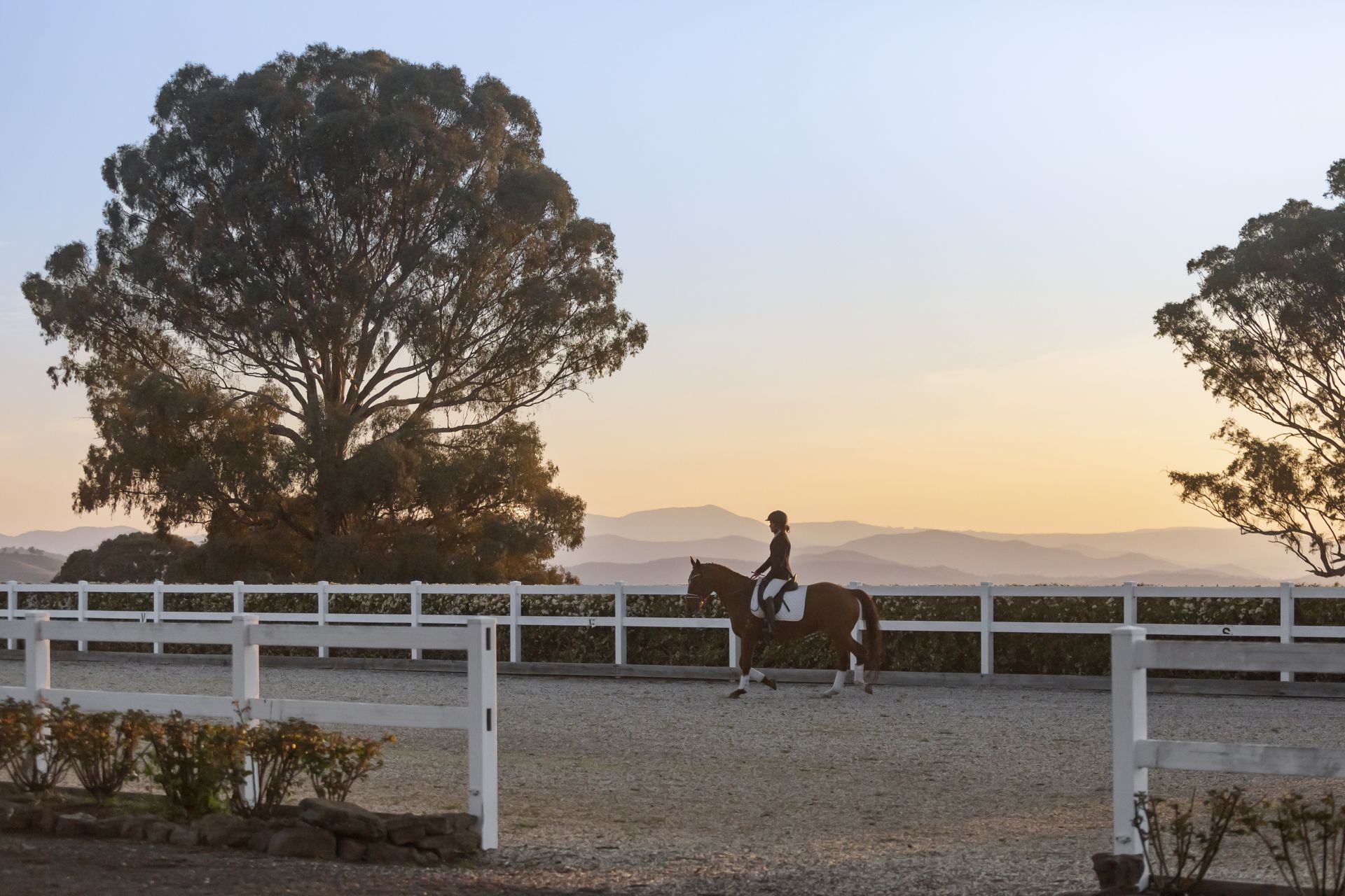 A full-size dressage 20 x 60m arena lined with David Austin roses provides an idyllic training environment.