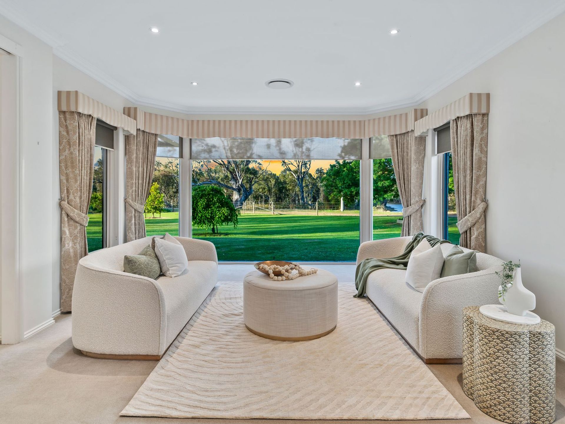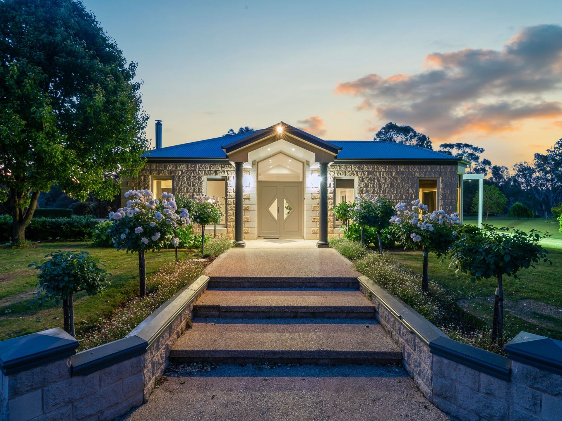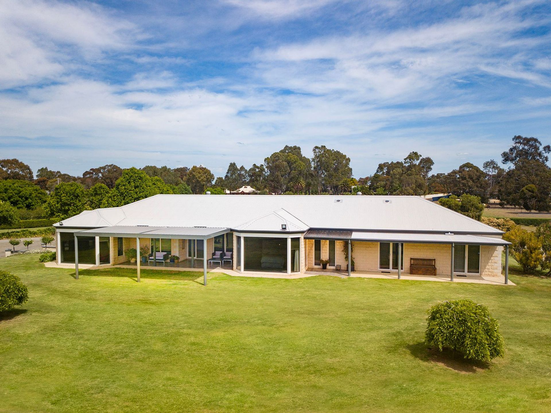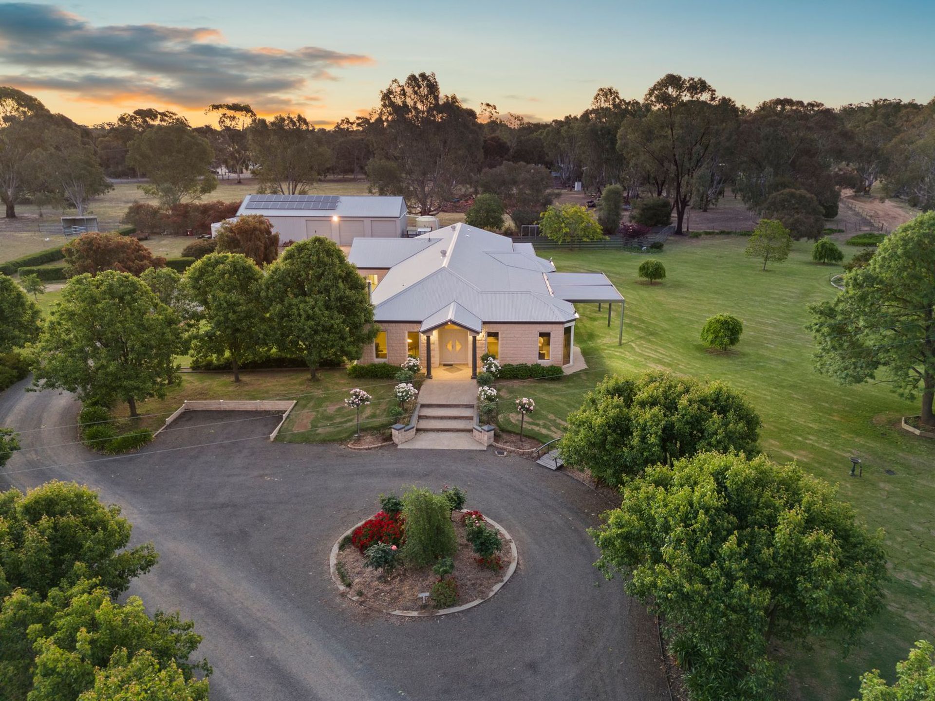 With neighbours to just one side of the property, and at a distance, this impeccable home ensures total privacy and uninterrupted views for years to come. The property is divided in half with 2.5 acres of landscaped gardens with an automatic watering system which includes a European tree-lined circular driveway with a double car garage plus visitor parking bay, mature sculpted box hedges, garden beds, expansive lawns and elegant tree roses lining the entry stairs. The additional 2.5 acres is divided into 2 large paddocks, suitable for horses or livestock.
