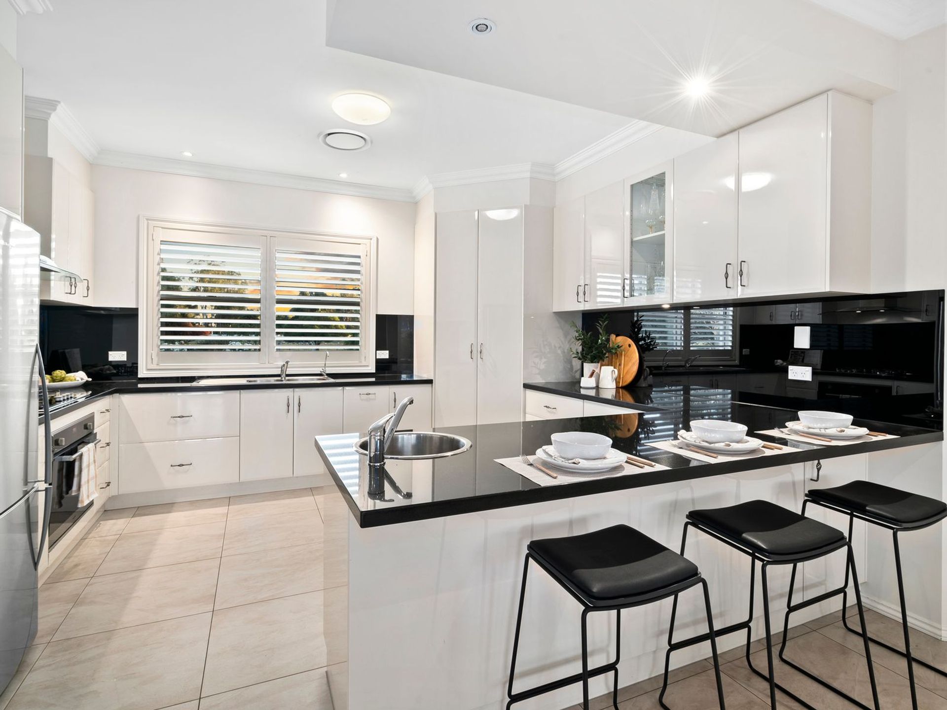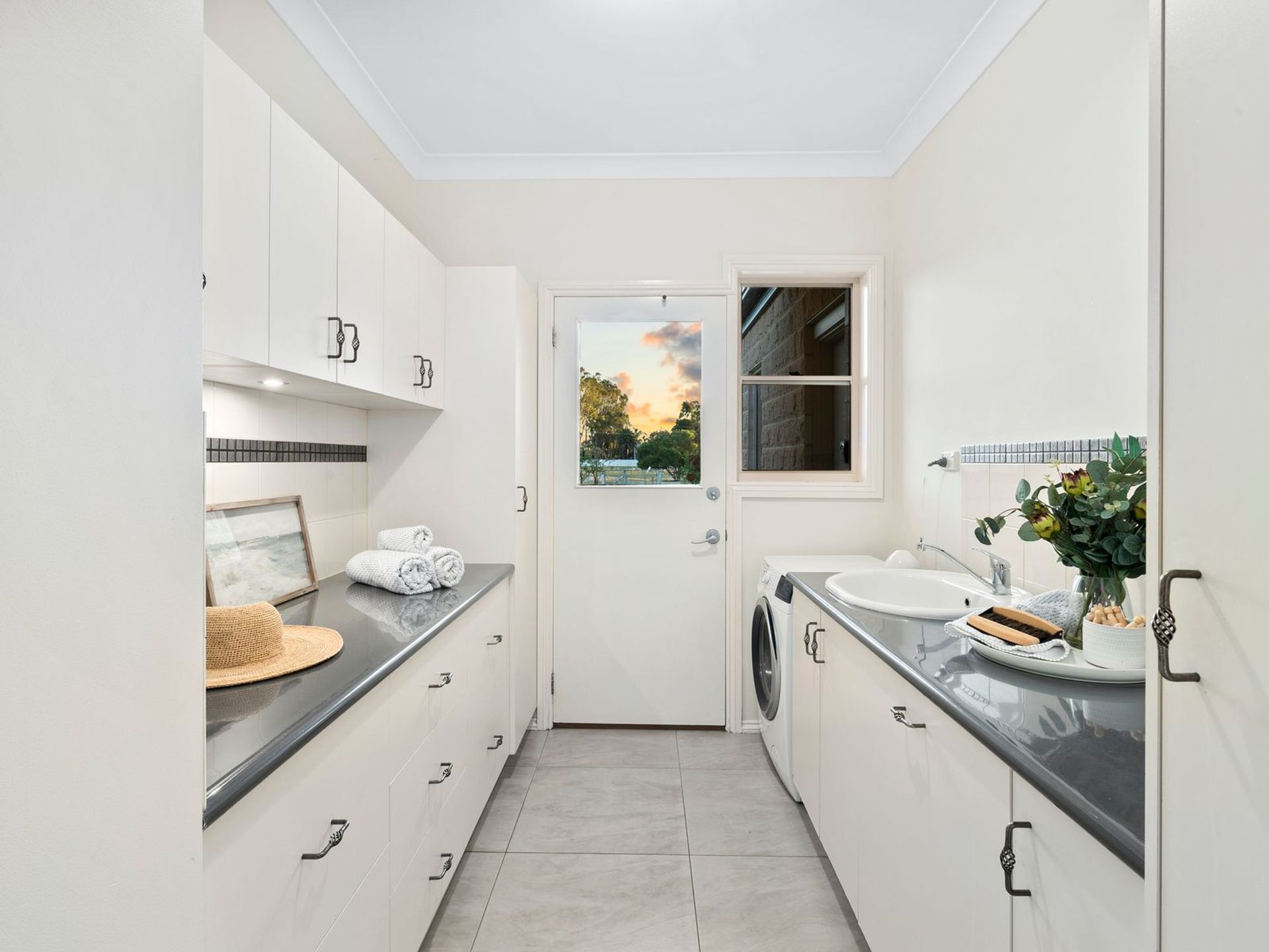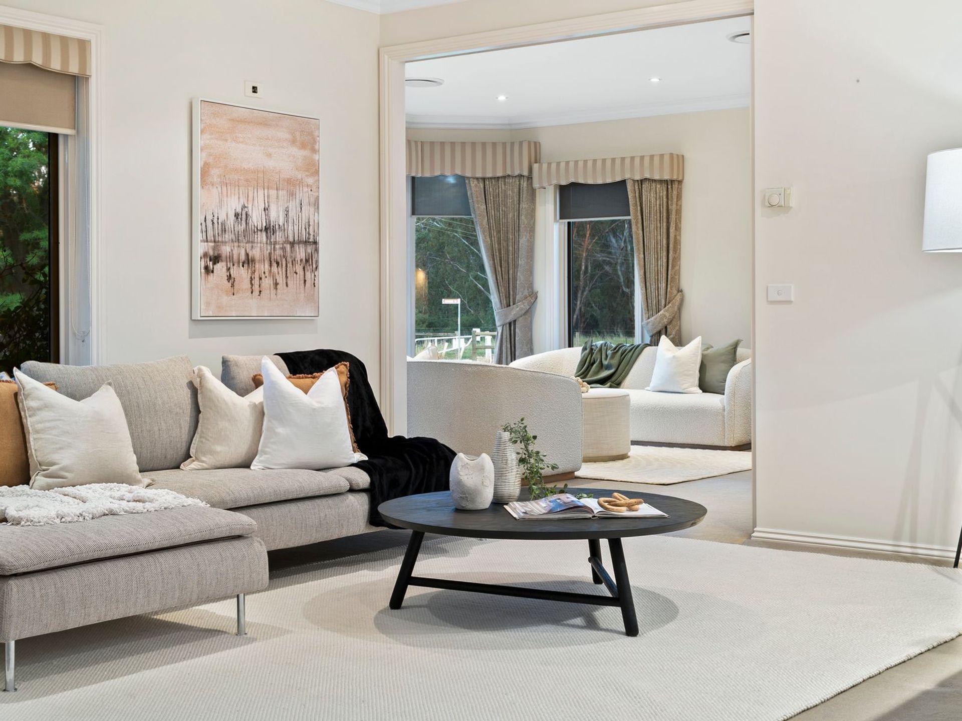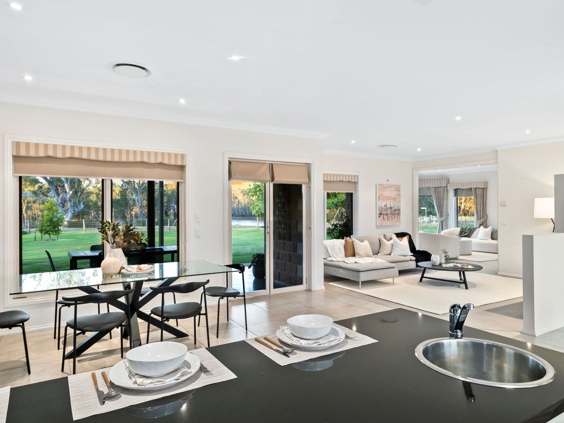 Step inside the generously proportioned, meticulously designed sandstone five-bedroom home to enjoy a true sense of style and elegant, year-round comfort. The home is thoughtfully designed to maximise its Northern aspect, with every room offering sweeping views of the river. The master suite and formal lounge feature floor-to-ceiling glass-panelled bay windows, flooding the spaces with natural light. Open-plan living areas include a formal lounge, sitting room and expansive dining and kitchen zone. Cleverly designed in-wall (hidden) concertina doors pull out, to divide the formal lounge and sitting room; adding additional privacy and flexibility. The contemporary gourmet kitchen features a sleek 2-pac finish, gas cooktop, instant hot, and chilled filtered water, dual sinks, plus utility ‘prep’ sink and black granite stone benchtops, matched to stylish black glass splashbacks.