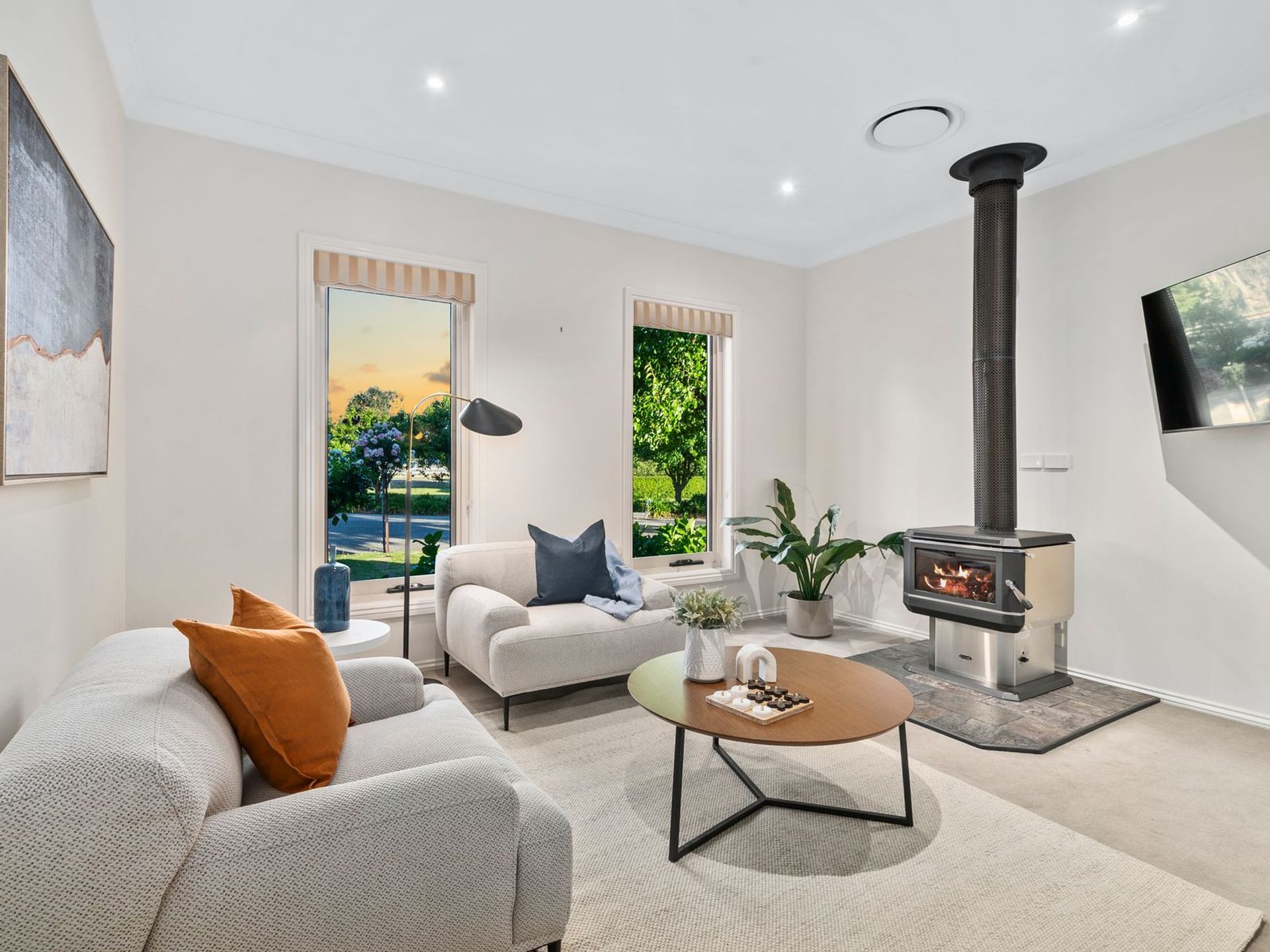 Designed with flexibility and energy efficiency in mind, it is possible to partially section off three bedrooms and a bathroom and powder room – to reduce cleaning and heating/cooling needs, or to provide a private living sanctuary for families and visiting guests. The home also features underfloor slab heating in the tiled areas, tinted glass to all North-facing rooms - reducing glare and providing further energy-efficiency and added privacy. Zoned central ducted heating and cooling with overhead fans in all bedrooms and the veranda keeps you cool in the summer, plus a cosy wood fire for added tranquillity on those cooler winter nights.