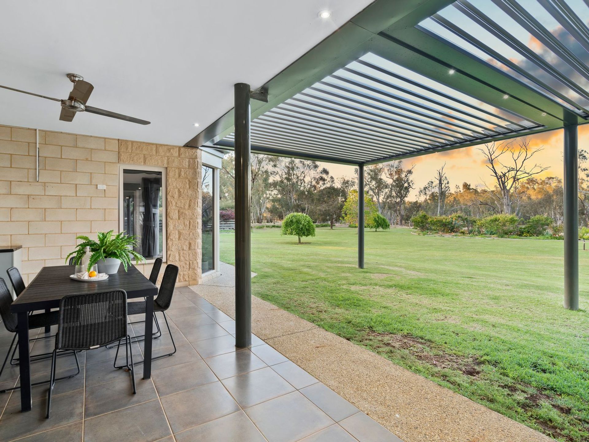 Outdoor features include a beautiful outdoor entertaining area overlooking the gardens and river covered with a remote-controlled ‘Vergola’ providing the option of partial or complete shade or rain covering, sandstone stepped grand entry with tree and riverbank garden lighting that can be controlled from the master suite; adding an elegant touch to evening and sunset viewings!