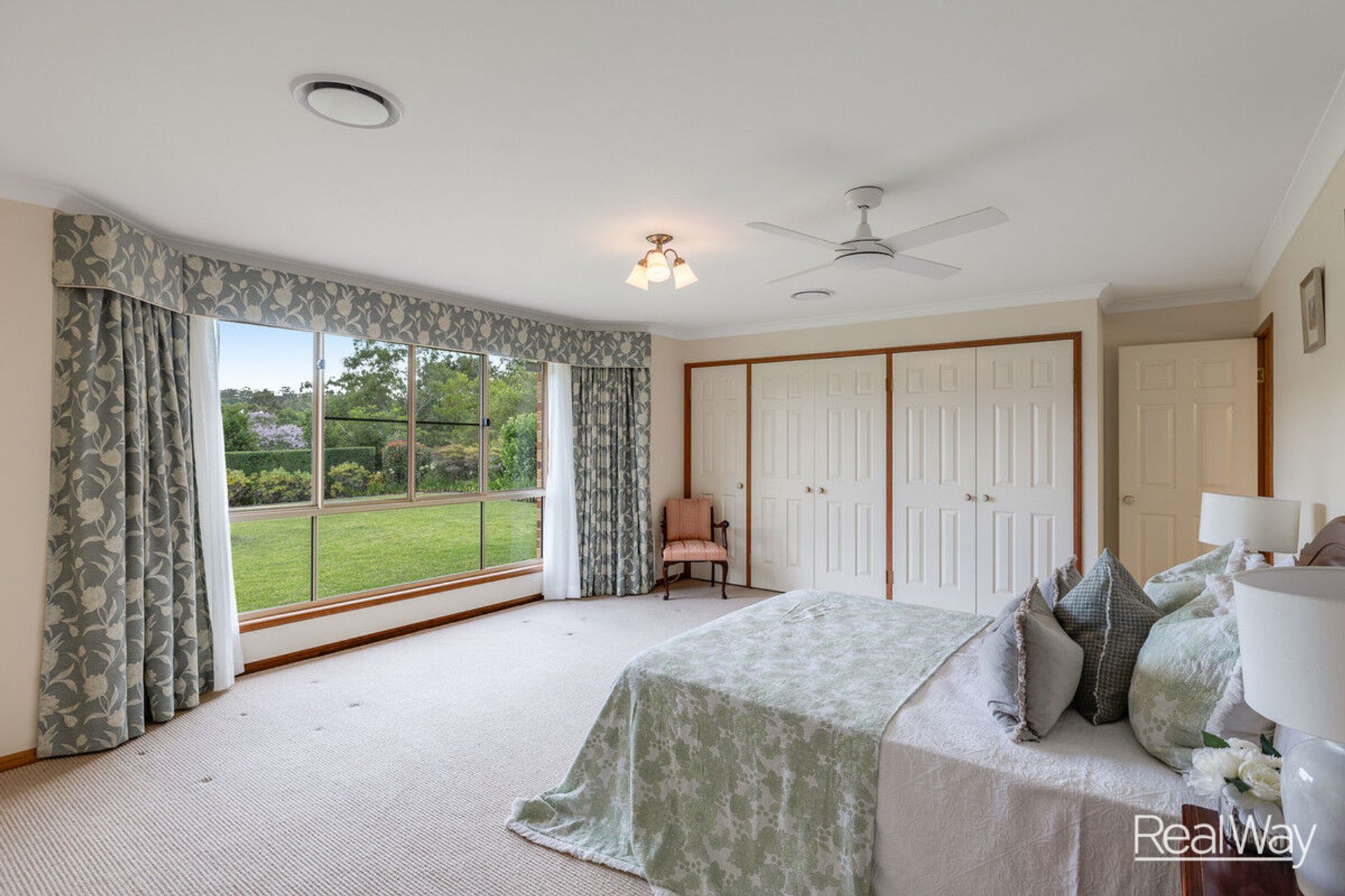 The principal bedroom is a true retreat, showcasing peaceful views of the rolling hills through elegant electric curtains. Its luxurious ensuite is a highlight, featuring granite bench tops, underfloor heating, and temperature-controlled heating for ultimate comfort.