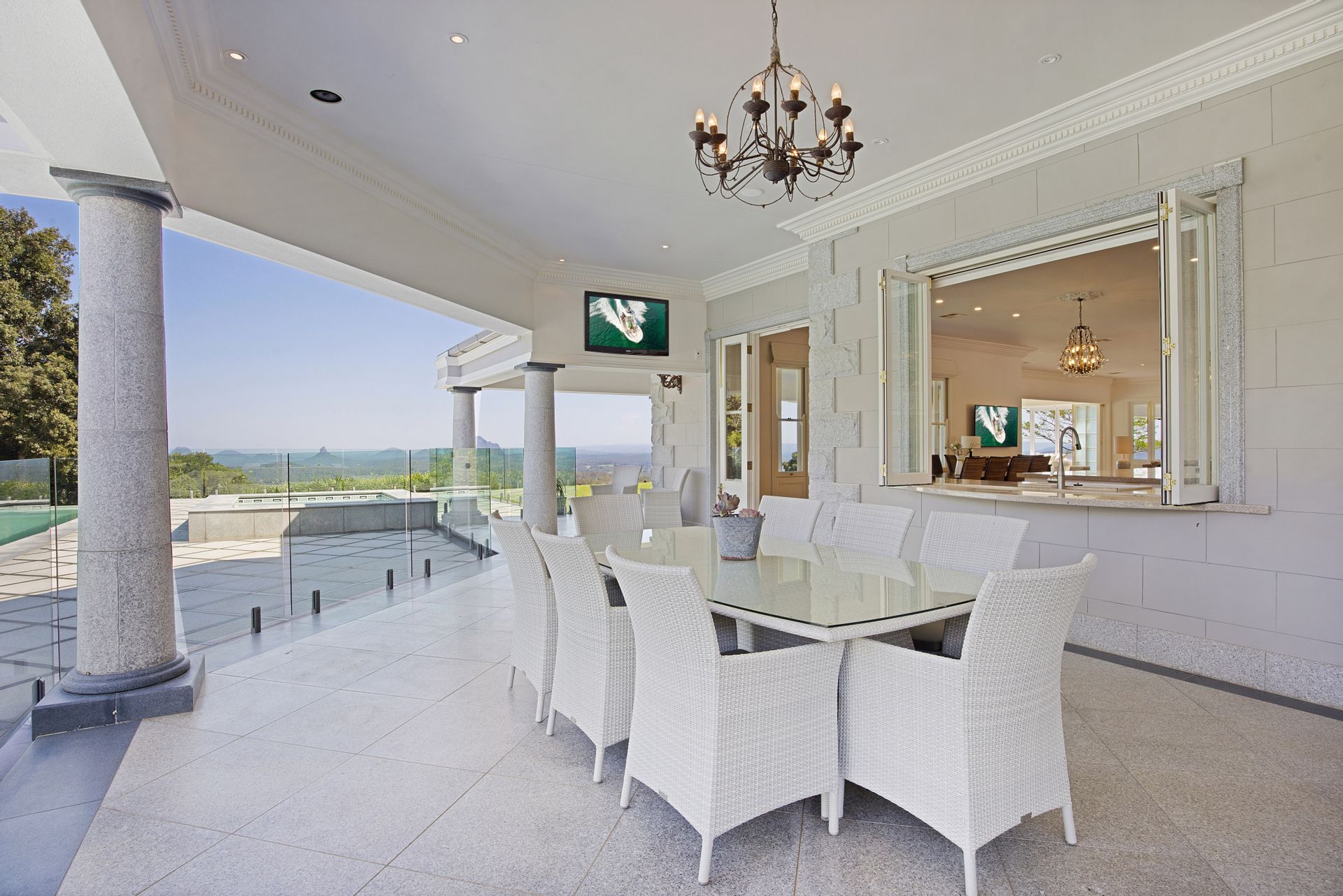 As you pass through the wrought iron electric gates, a grand entrance sets the tone for what lies ahead. The sweeping concrete driveway meanders through pristine cattle country (approximately 100 acres of prime grazing country), past tranquil dams, guiding you toward the estate. The journey alone hints at the magnificence of Mountain View Manor, with the Glass House Mountains seemingly within arm's reach, offering awe-inspiring views that stretch to the coast and beyond to Brisbane and the distant Gold Coast.