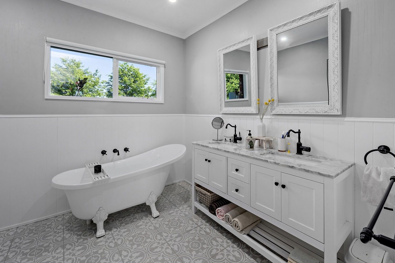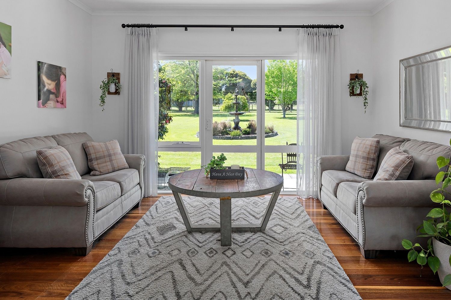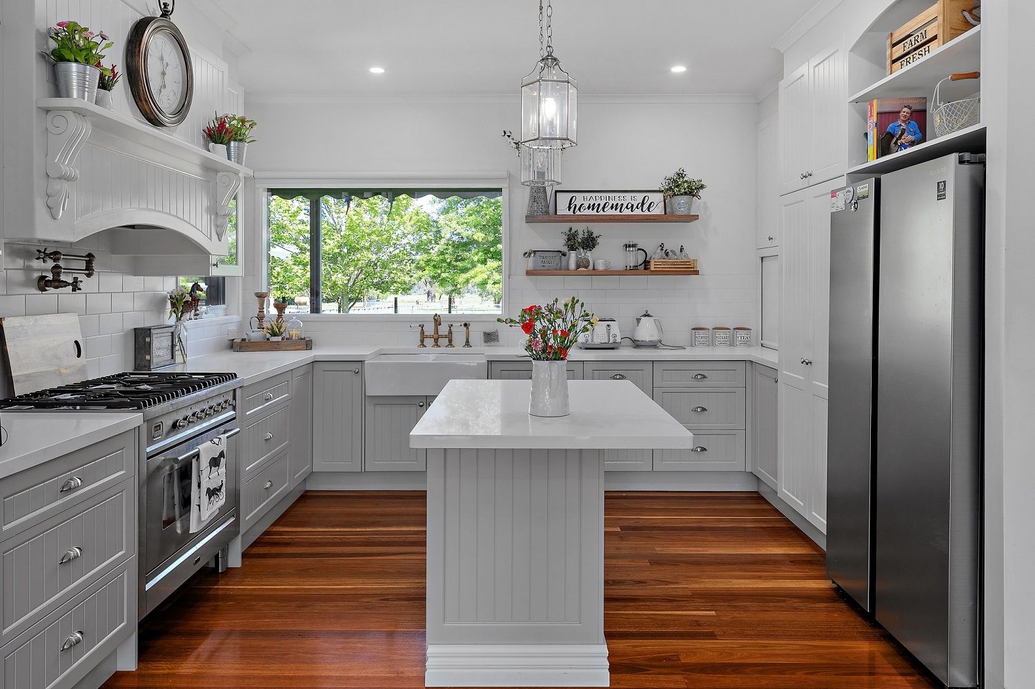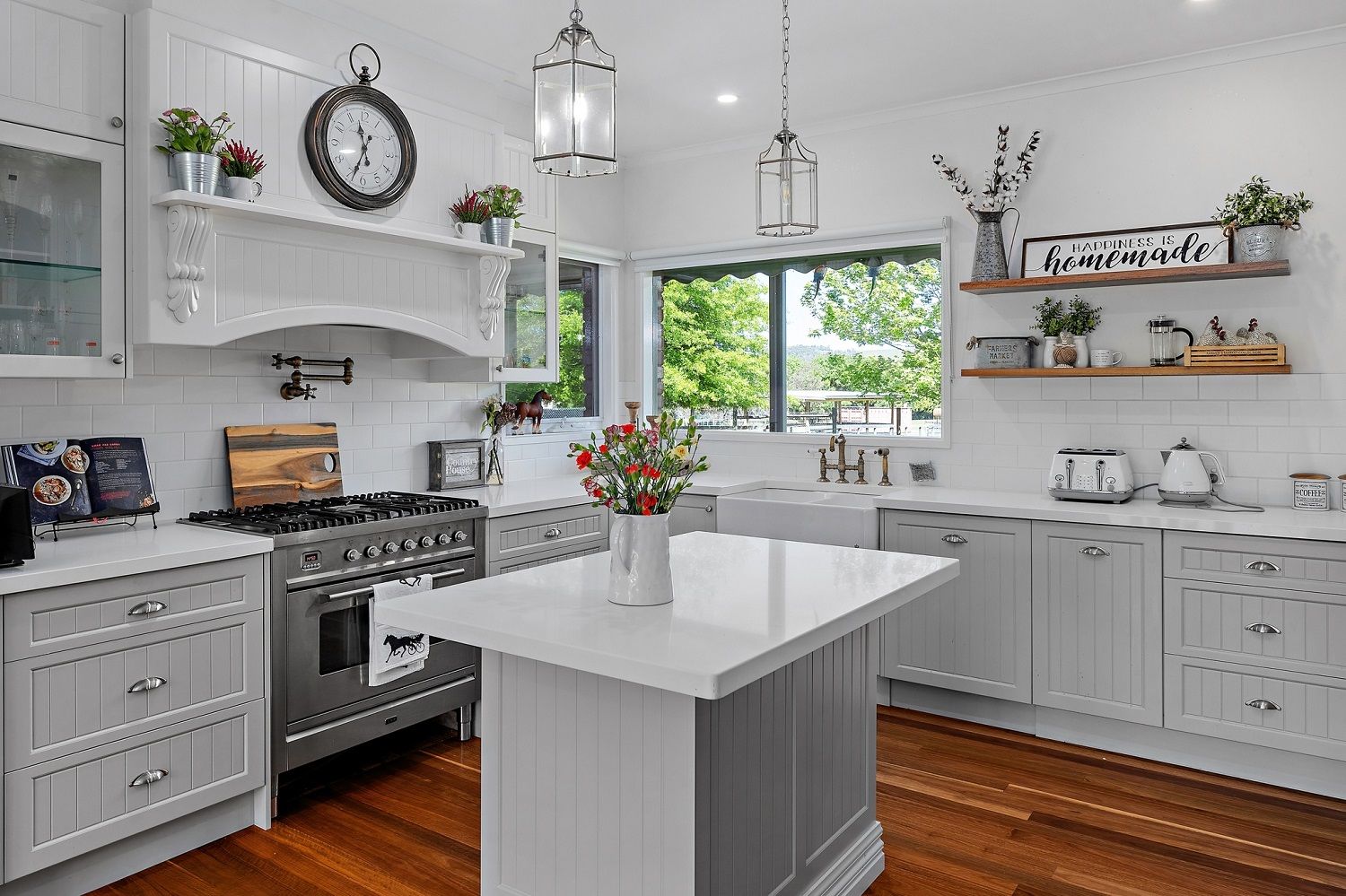 The home itself is a stunning four-bedroom brick homestead with a large study/5th Bedroom and a double garage, all designed for family enjoyment and entertaining with an abundance of additional storage space. The master suite is a true retreat, with a chandelier, feature panelling, and an ensuite that includes a clawfoot bath and double vanity. The open-plan living areas are filled with natural light, thanks to high ceilings, large picture windows, and exquisite spotted gum timber flooring. Thoughtful design elements such as barn doors, skylights, and feature lighting enhance the modern farmhouse charm of the home.