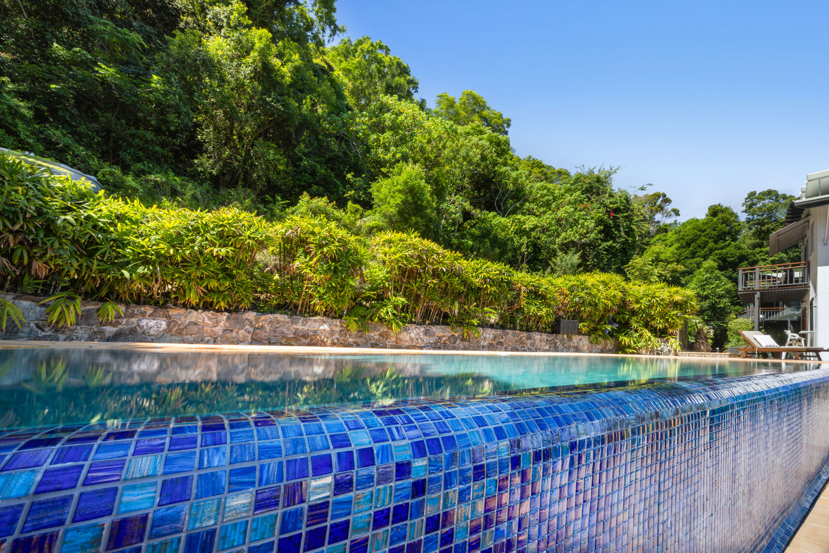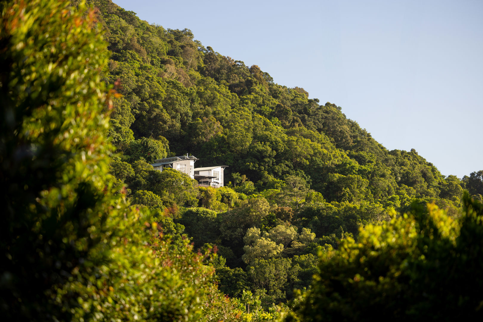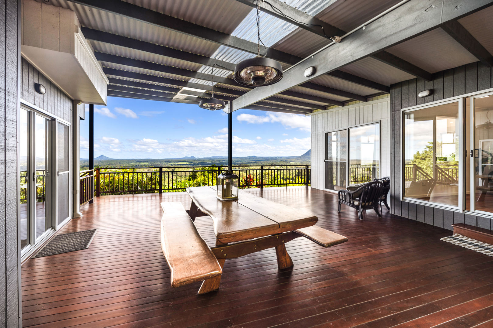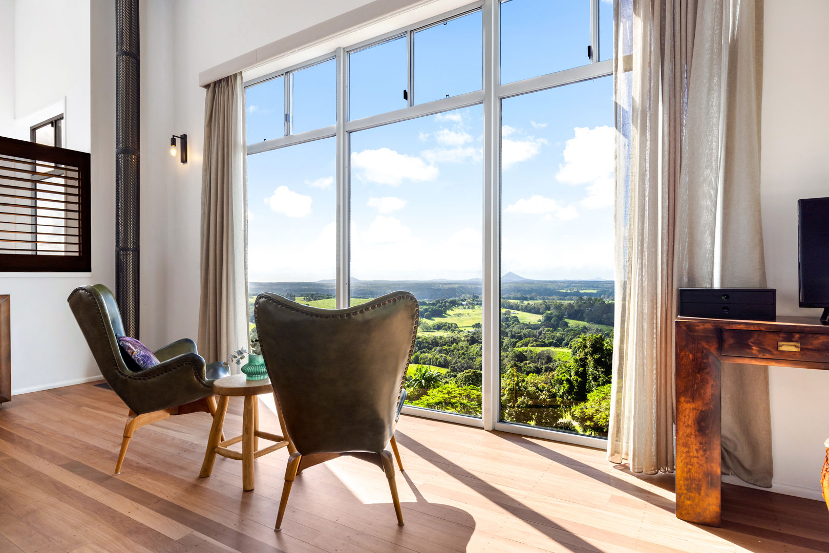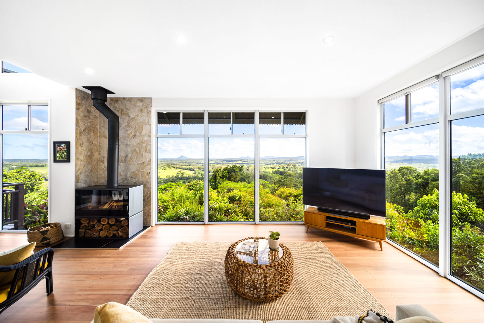 The architecturally designed home features three bedrooms, two bathrooms (including an ensuite), and a gourmet kitchen with premium appliances. Every room offers panoramic views of the Noosa and Sunshine Coast hinterland.