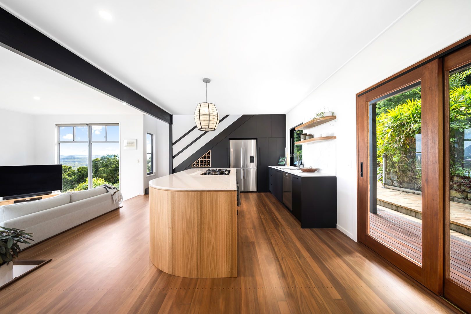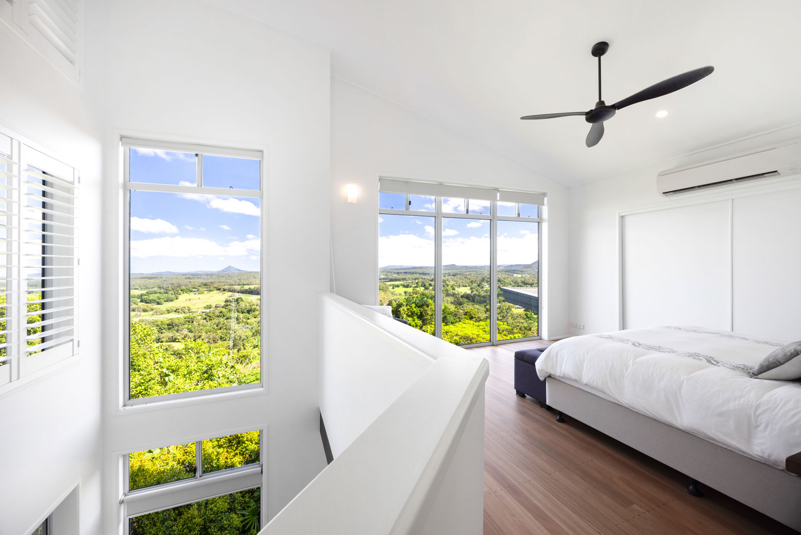 The architecturally designed home features three bedrooms, two bathrooms (including an ensuite), and a gourmet kitchen with premium appliances. Every room offers panoramic views of the Noosa and Sunshine Coast hinterland.