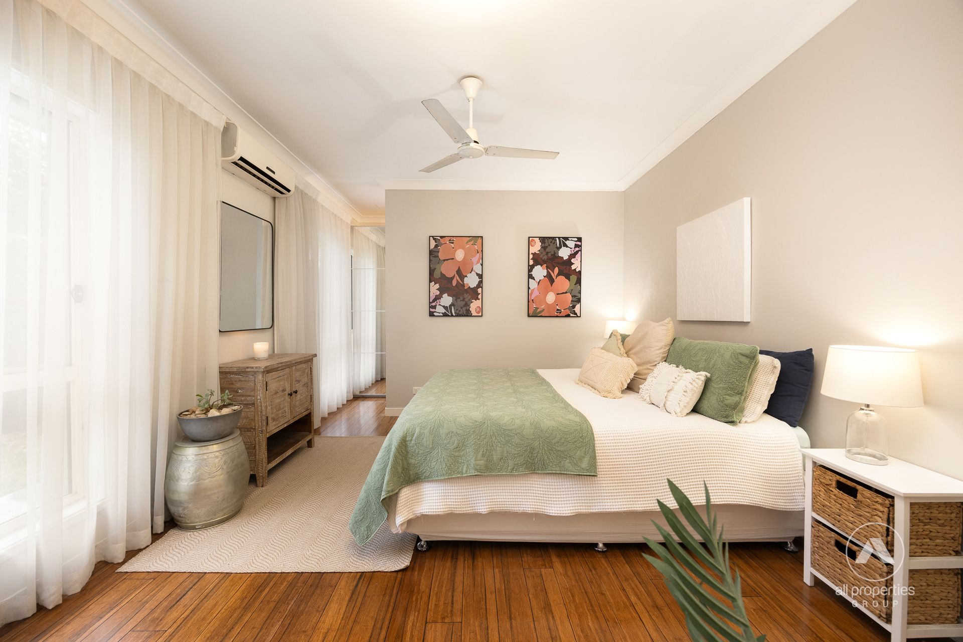 Bedrooms: 3 spacious bedrooms, all with air conditioning, fans and robes, plus a 4th bedroom or study option.