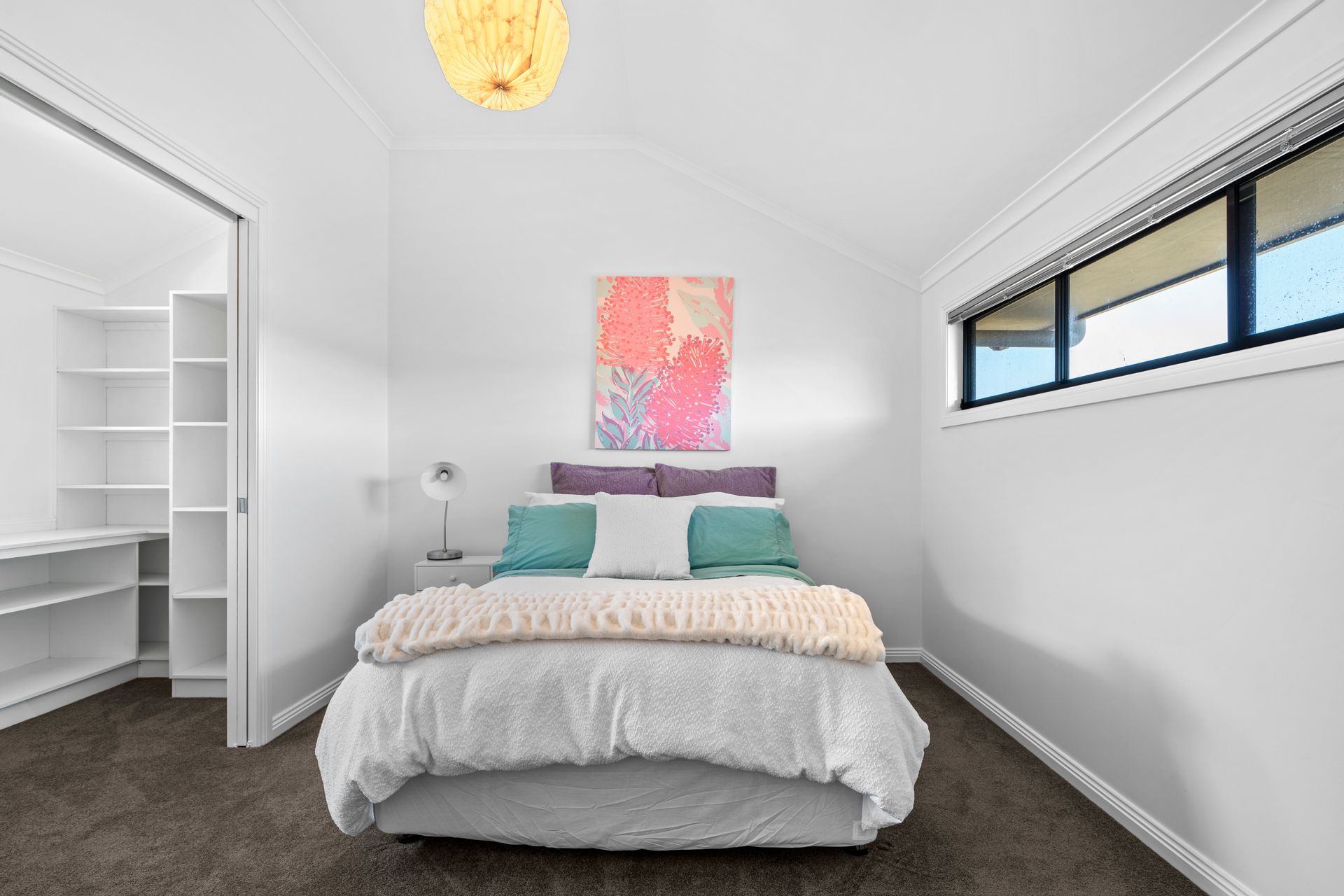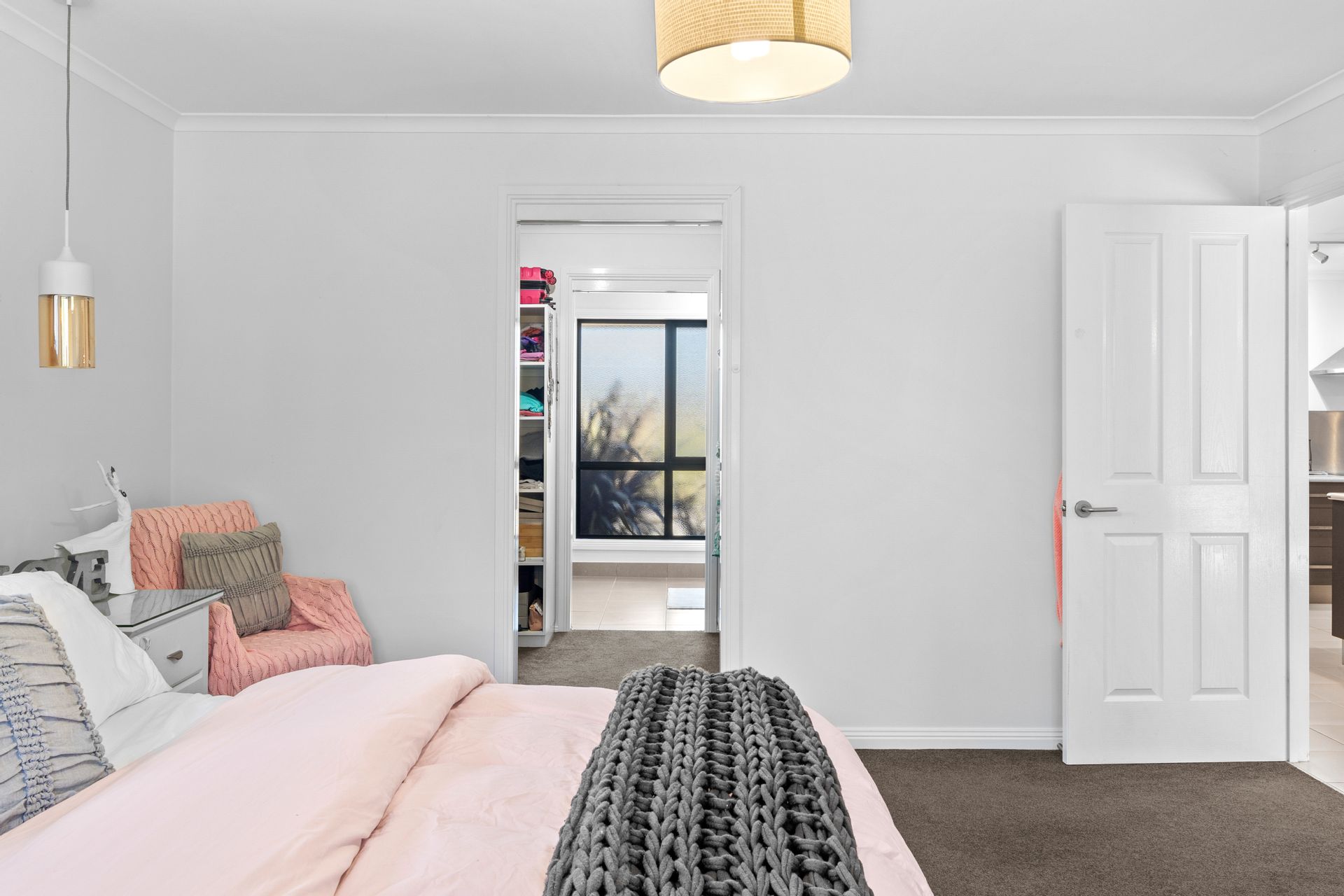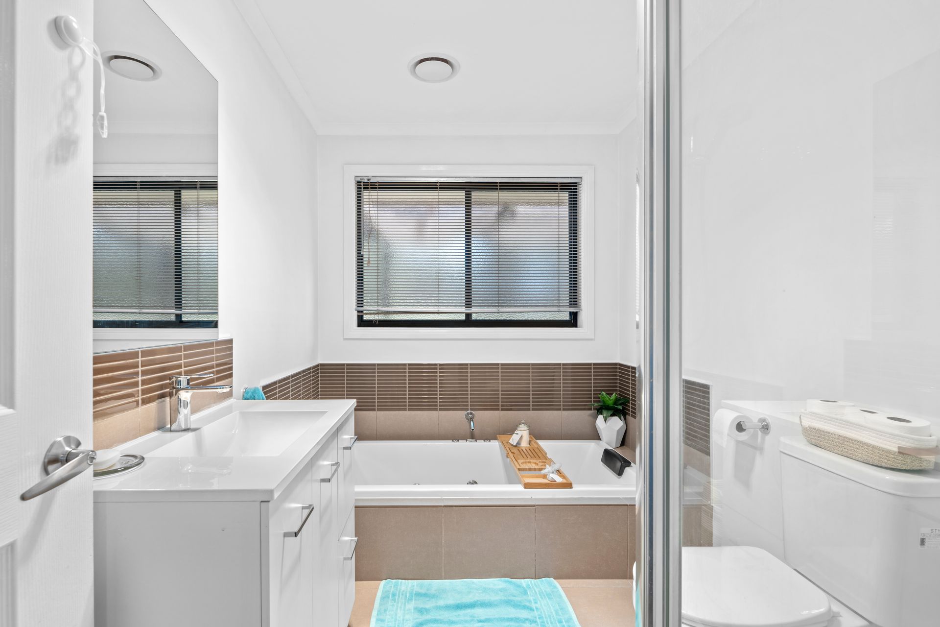 The main bedroom is a true retreat, complete with a walk-in robe and ensuite plus additional storage within the window bench seat, while the second bedroom also offers its own walk-in robe. Upstairs, two additional bedrooms, each with walk-in robes, share a charming powder room, perfect for guests or growing teens. A modern family bathroom on the ground floor features a separate shower, bath, and vanity, catering to all needs.