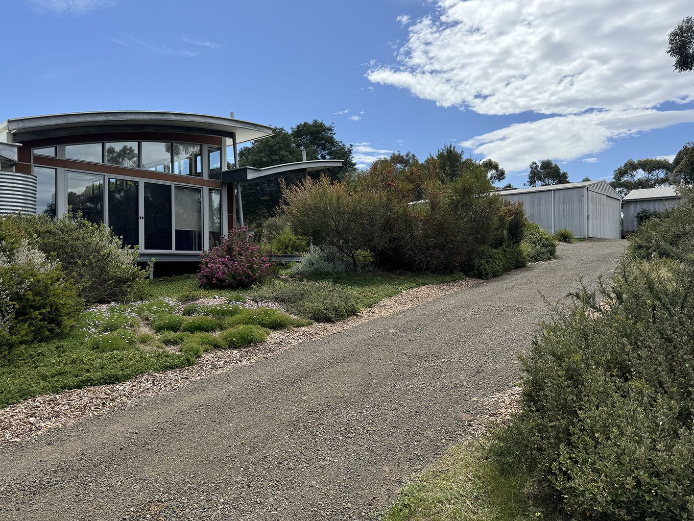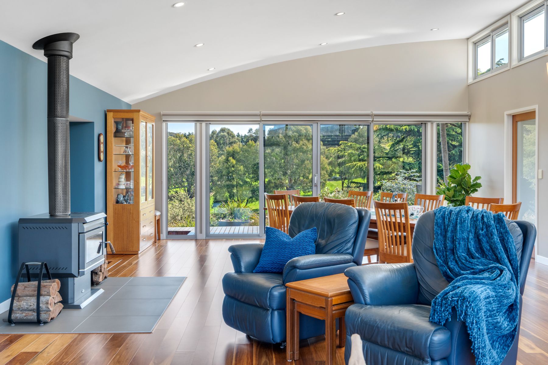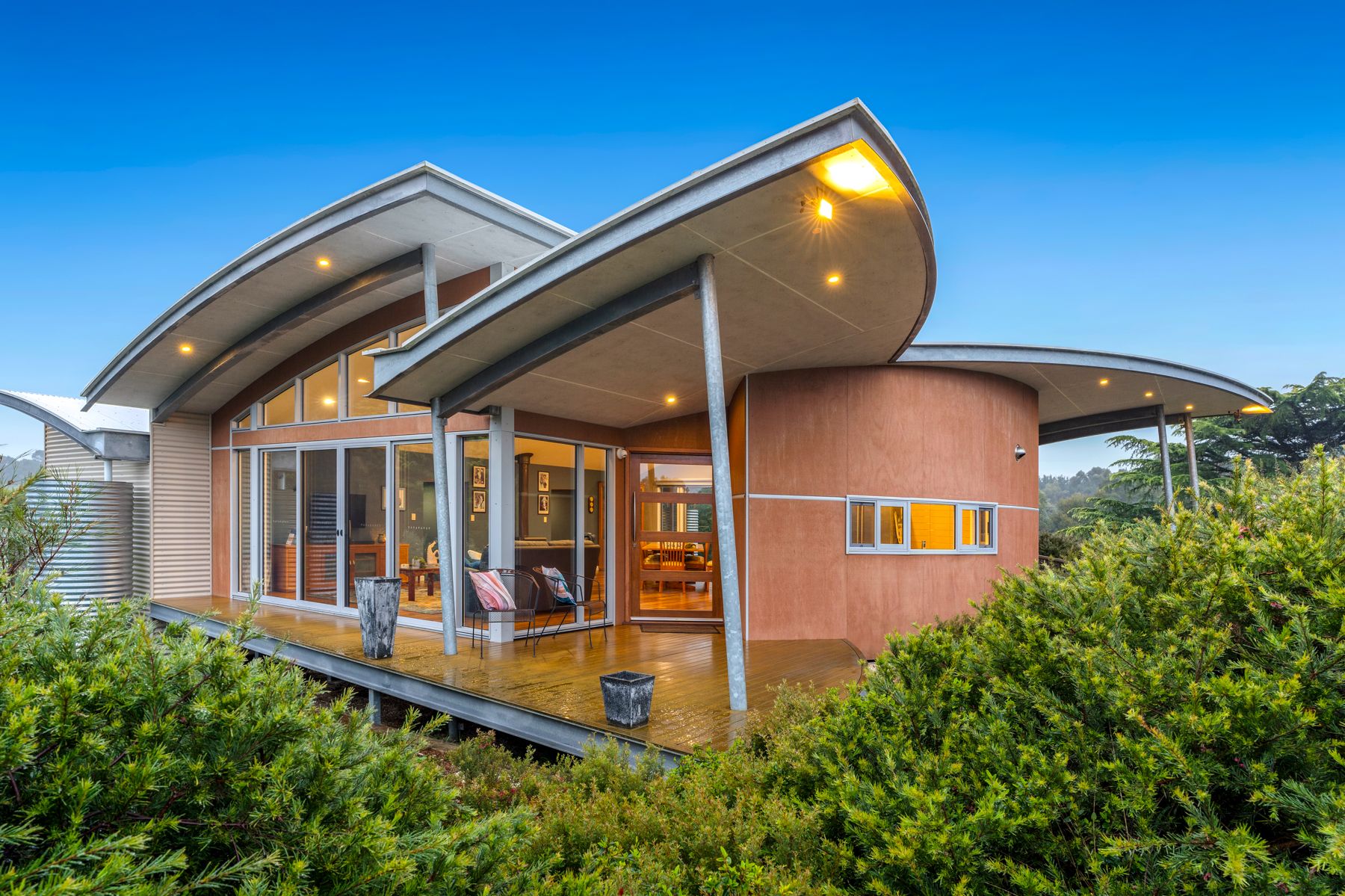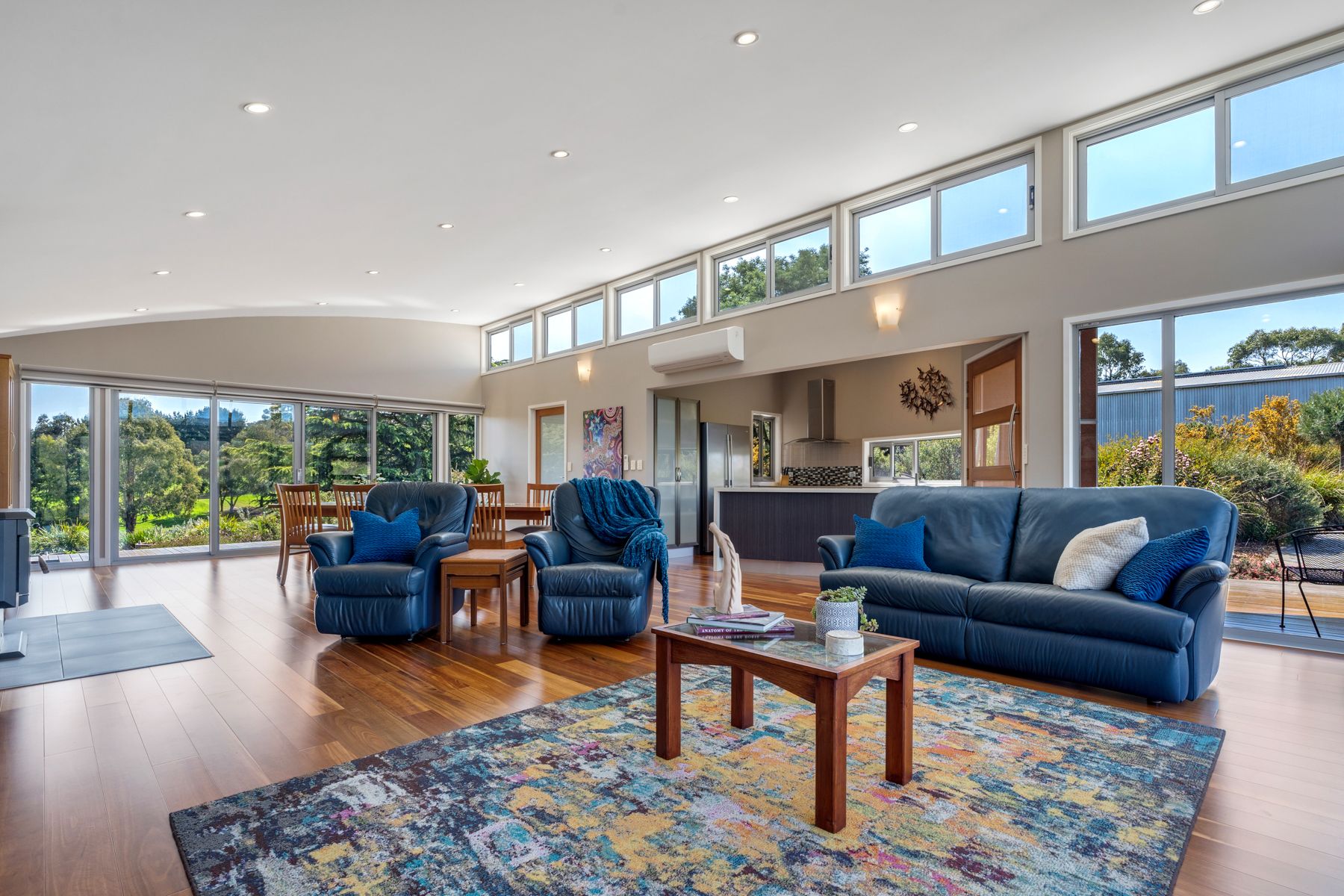 A meticulous, steel framed, modern built country home with striking curved roof lines with steel fascia detail, high curved ceilings, clear story windows and an abundance of natural light makes this home an absolute standout. Its built along passive solar principles with double glazing throughout and clever energy efficient lighting. Sliding doors on both sides of the home lead out to curved decks with undercover areas or you can stay inside, either way you'll be immersed in the outlook and professionally designed, relaxed, established landscaped gardens.