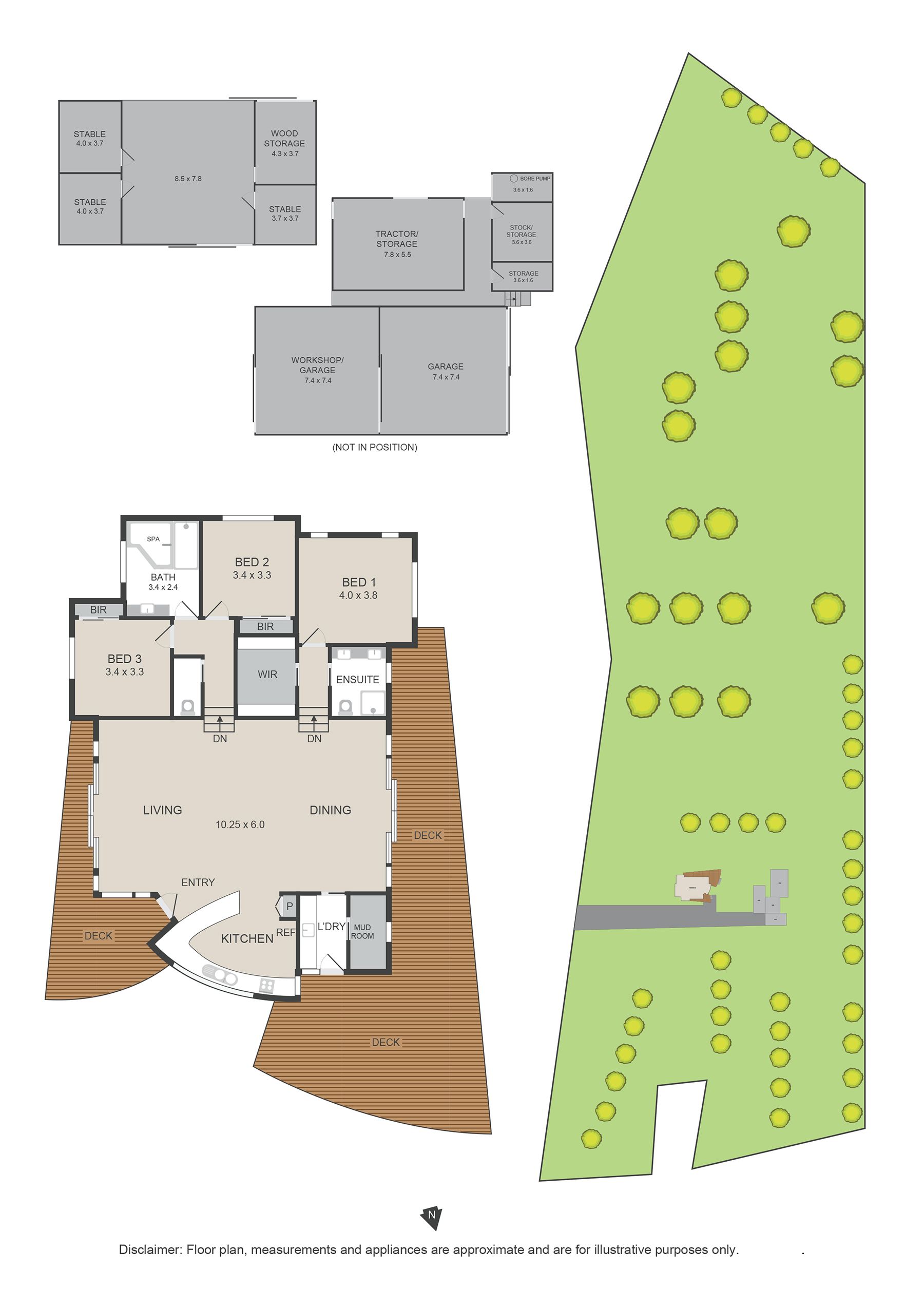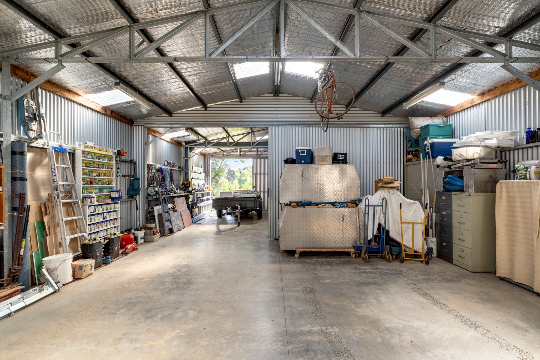 Paths and garden integrate the home and shed complex consisting of generous 4 car/workshop lock up garage with 3kW solar system and convenient drive through. Open sided shed for big toys or tractor, large wood shed and vermin-proof room for stockfeed/tack or storage.