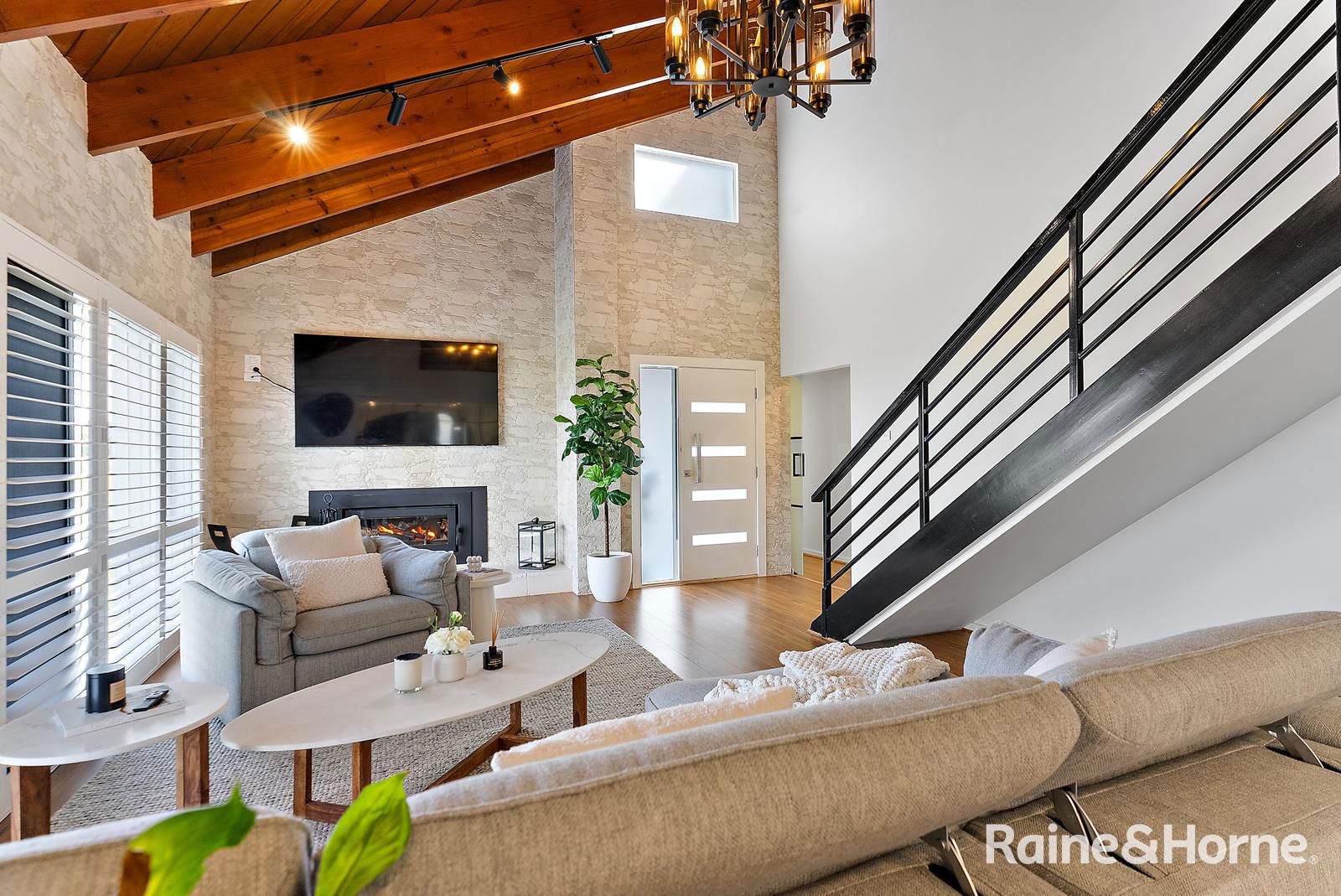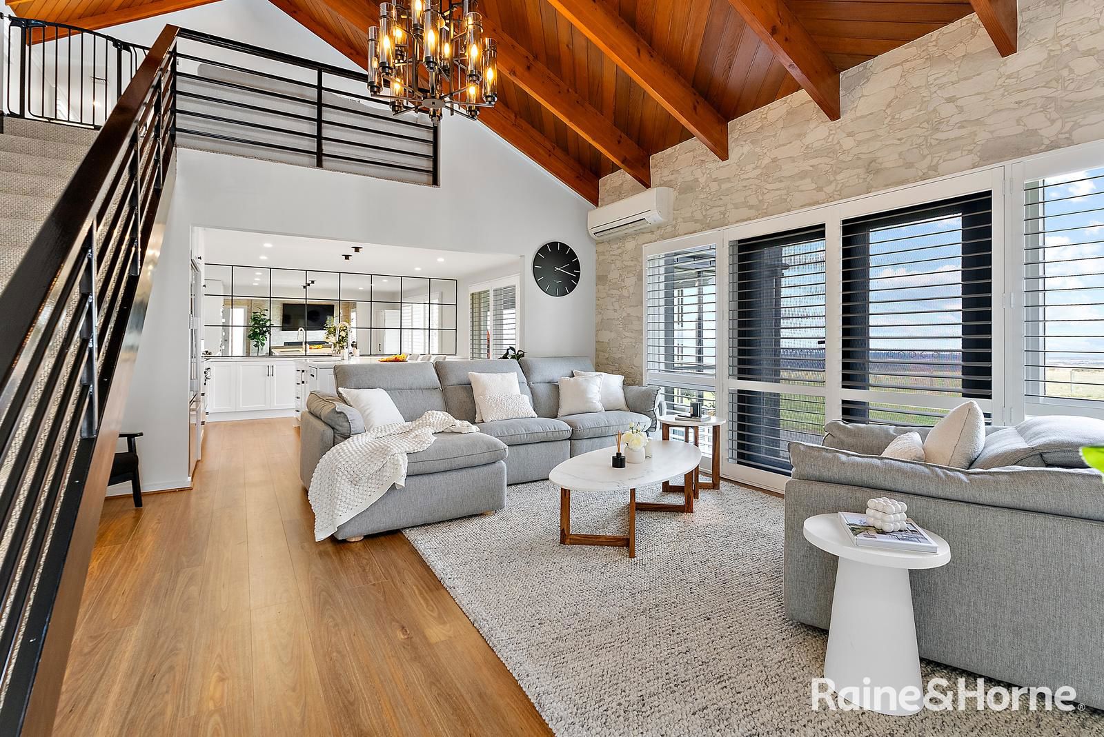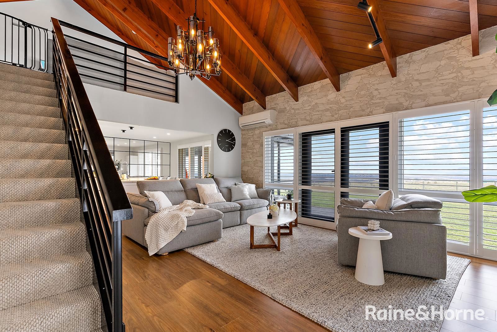• The expansive main living area features a striking stone wall, timber cathedral ceilings, and large plantation-shuttered windows.
