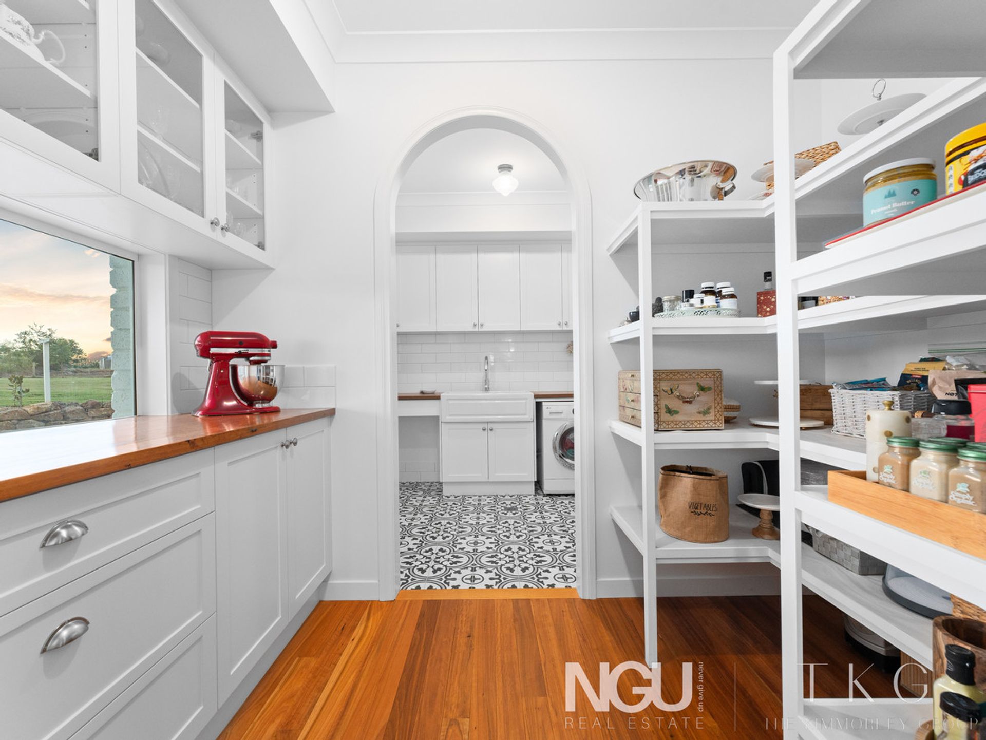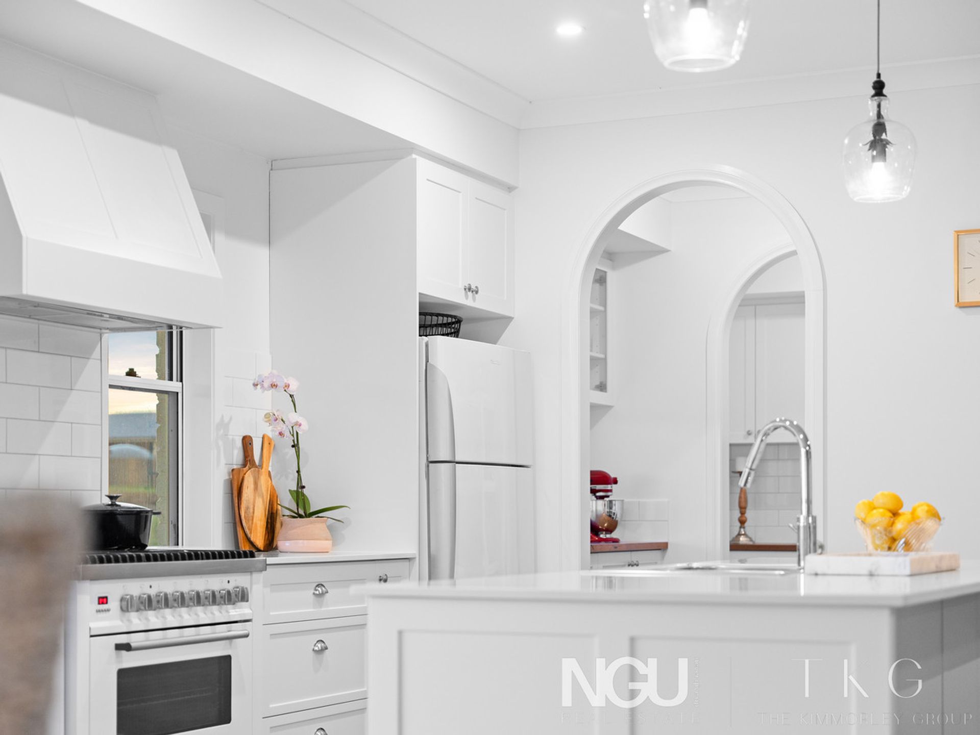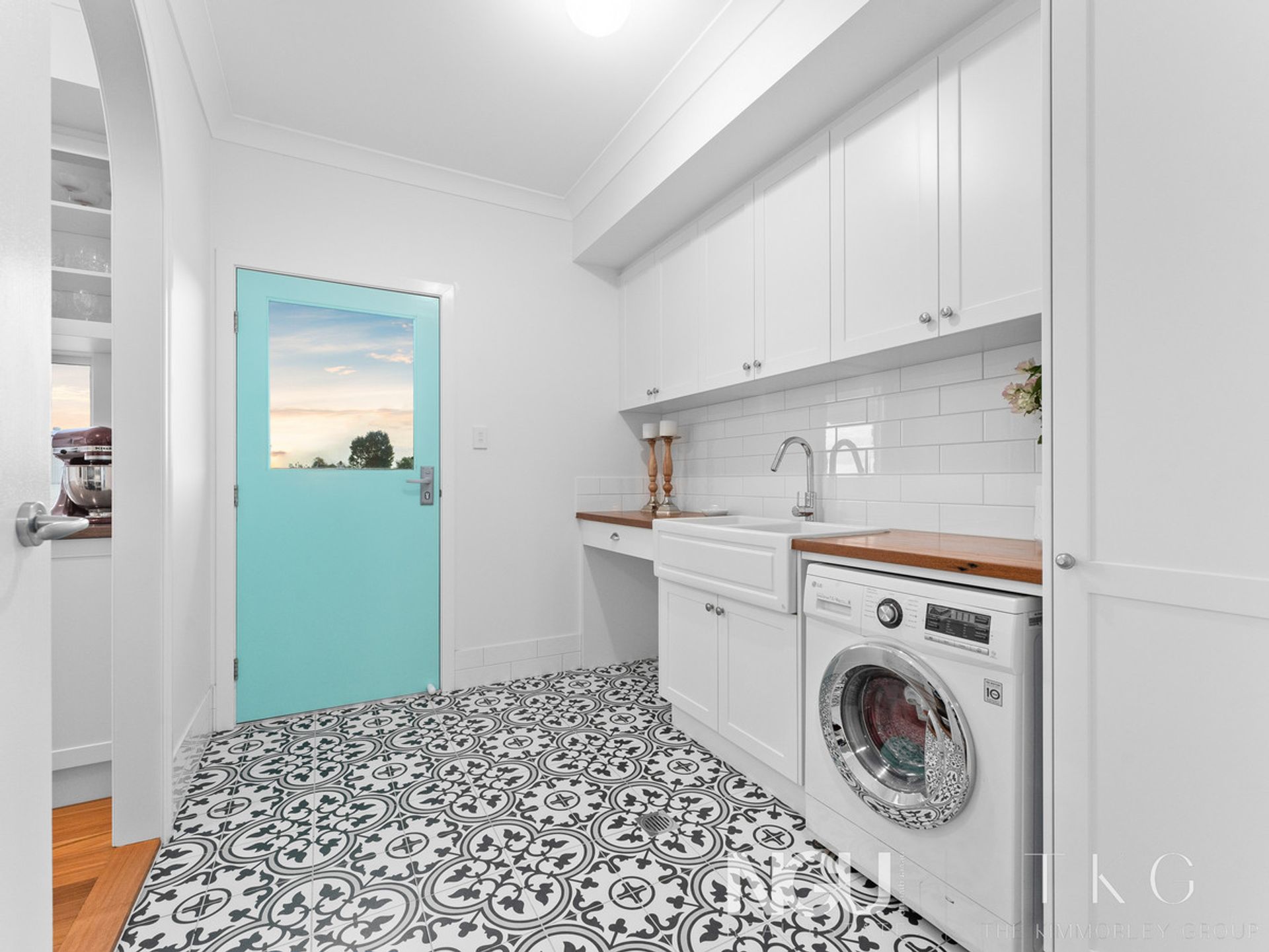 The cabinetry features a durable, high gloss finish achieved through a specialized two component painting process, providing a sleek and sophisticated look while ensuring long-lasting quality. Adjacent spaces feature thoughtful details like a Fireclay farmhouse sink in the laundry and sustainable reclaimed timber benchtops in the butler's pantry.