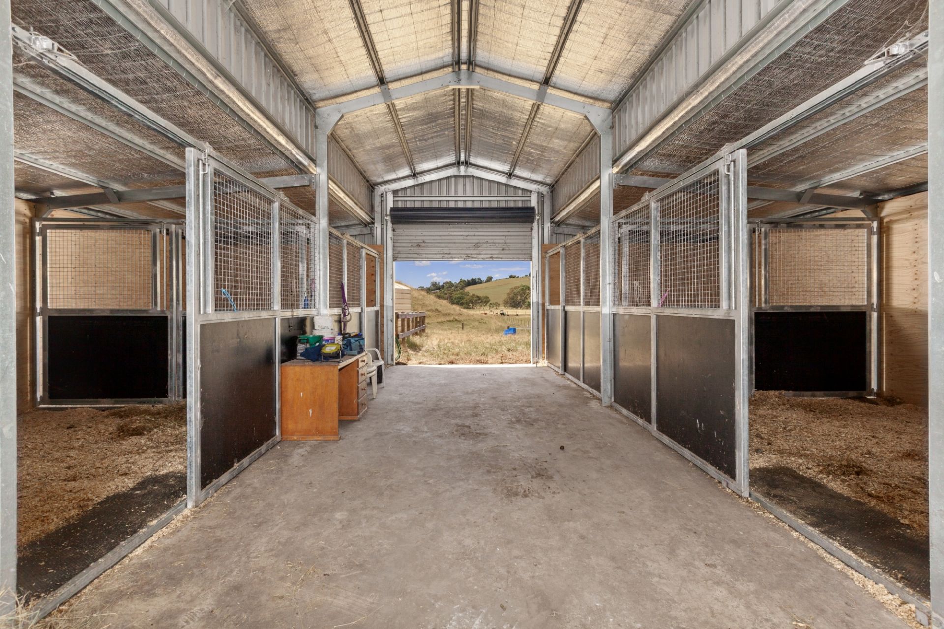 Equestrian Facilities: Enthusiasts will be in their element with the as-new American barn stable complex. Four stables with swinging central dividers (easily converting to two double stables), a tack room, feed room plus hot wash cater to every need. Two large water tanks service the stables. The barn is fenced, creating a secure area with a tree plantation, perfect for stock. Beyond the barn, discover three large, robust animal shelters and thoughtfully designed paddocks. New, top-of-the-line fencing lines the creek, while two smaller horse paddocks, one with a day yard and shelter, provide quality options. Water troughs in all paddocks are fed from a reliable bore. A livestock loading ramp at the yards simplifies stock management via laneway.