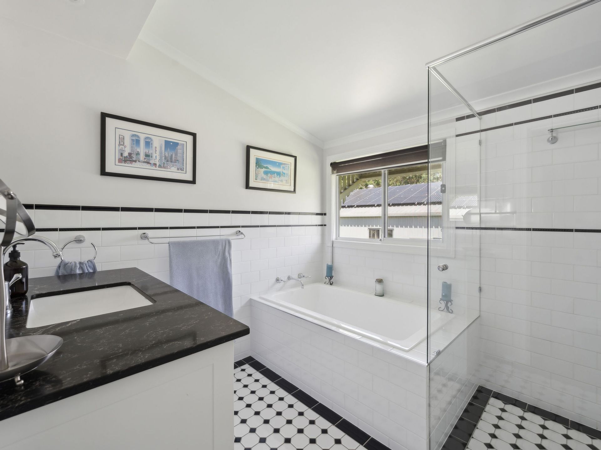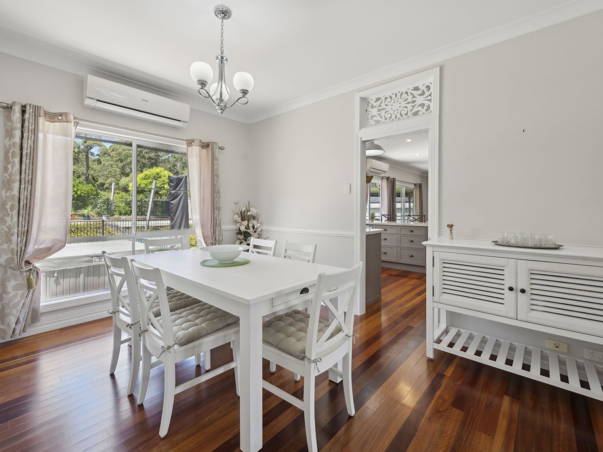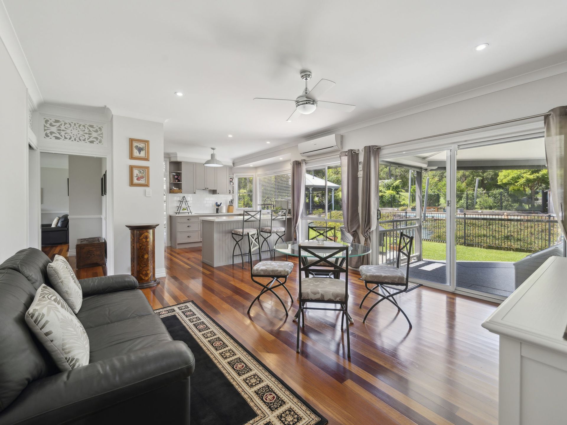 4 generous bedrooms in total with ceiling fans, 2 with air-con and 2 again offer pretty French doors and double hung windows out to the veranda. Add to the list refurbished main bathroom touched with tradition in classic black & white tiles & hosting a vanity with deep draws and striking marble top, a luxurious bath and separate W.C. The main suit is positioned away from the other 3 bedrooms and like the entire home is bathed in gorgeous natural light and boasts a large robe & well appointed refurbished ensuite continuing the fresh black and white theme. From the main bedroom be tempted out to the pool and spa area through siding doors for a quick moonlight dip.