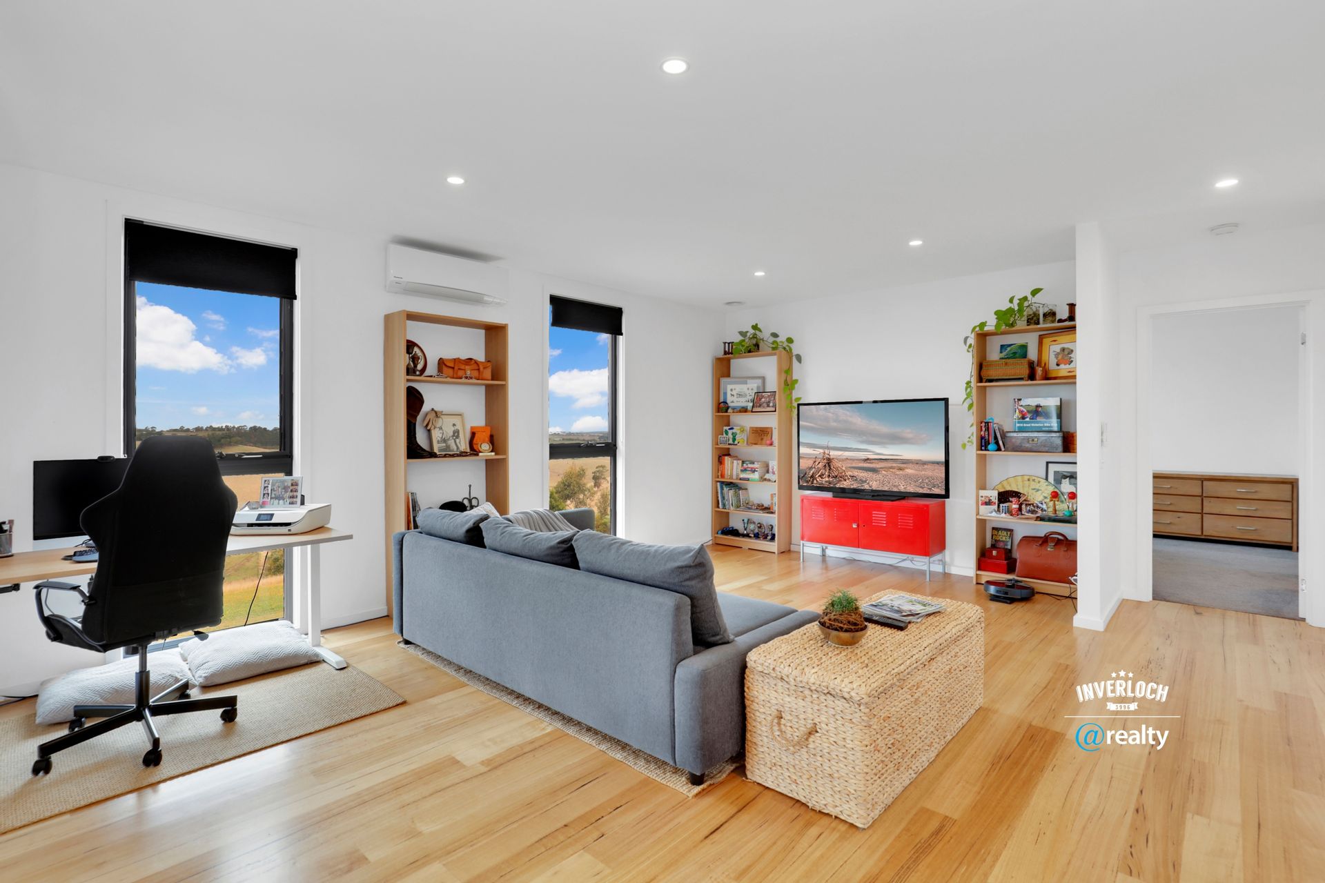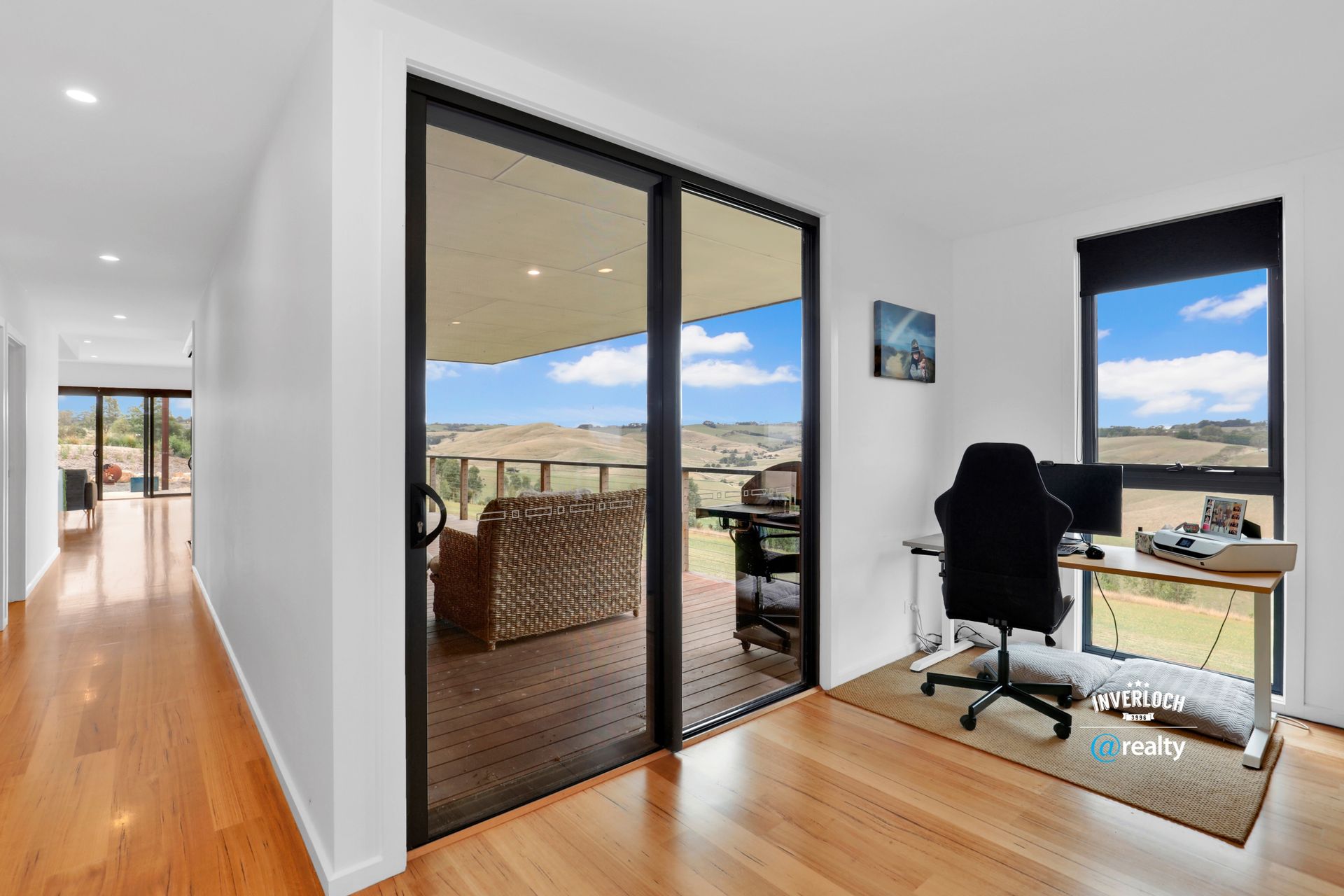 The home's clever floor plan creates distinct zones for connection and solitude – three generous bedrooms (master with luxurious ensuite), dual living areas that pivot around a stunning central kitchen, and a dedicated home office with a view that makes remote work not just possible but pleasurable. Bathed in natural light and featuring beautiful timber floors throughout, the interior spaces maintain a visual connection to the landscape beyond.