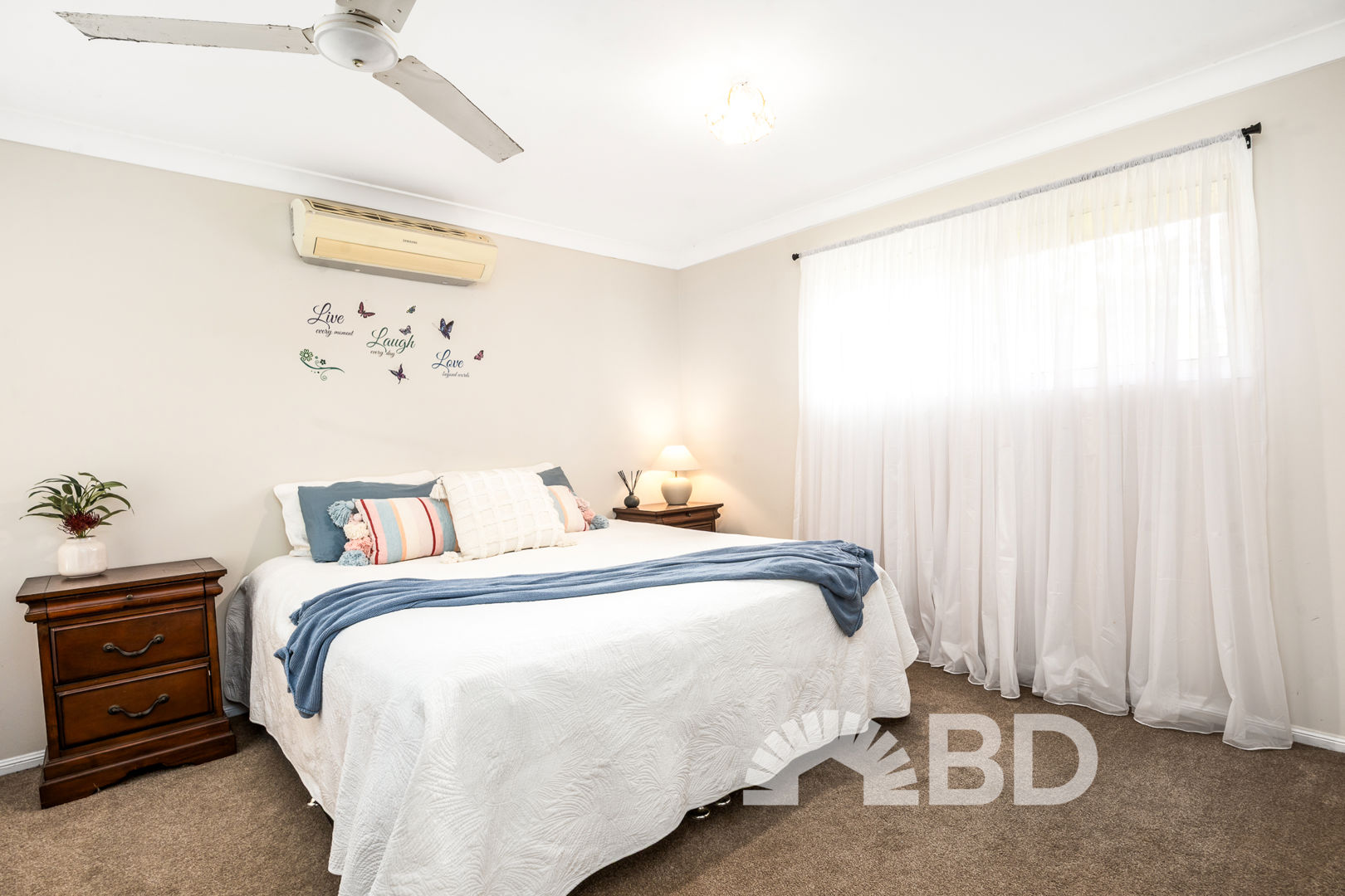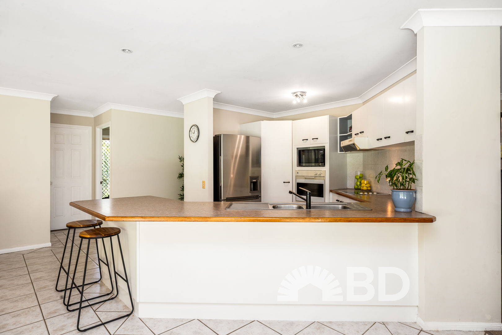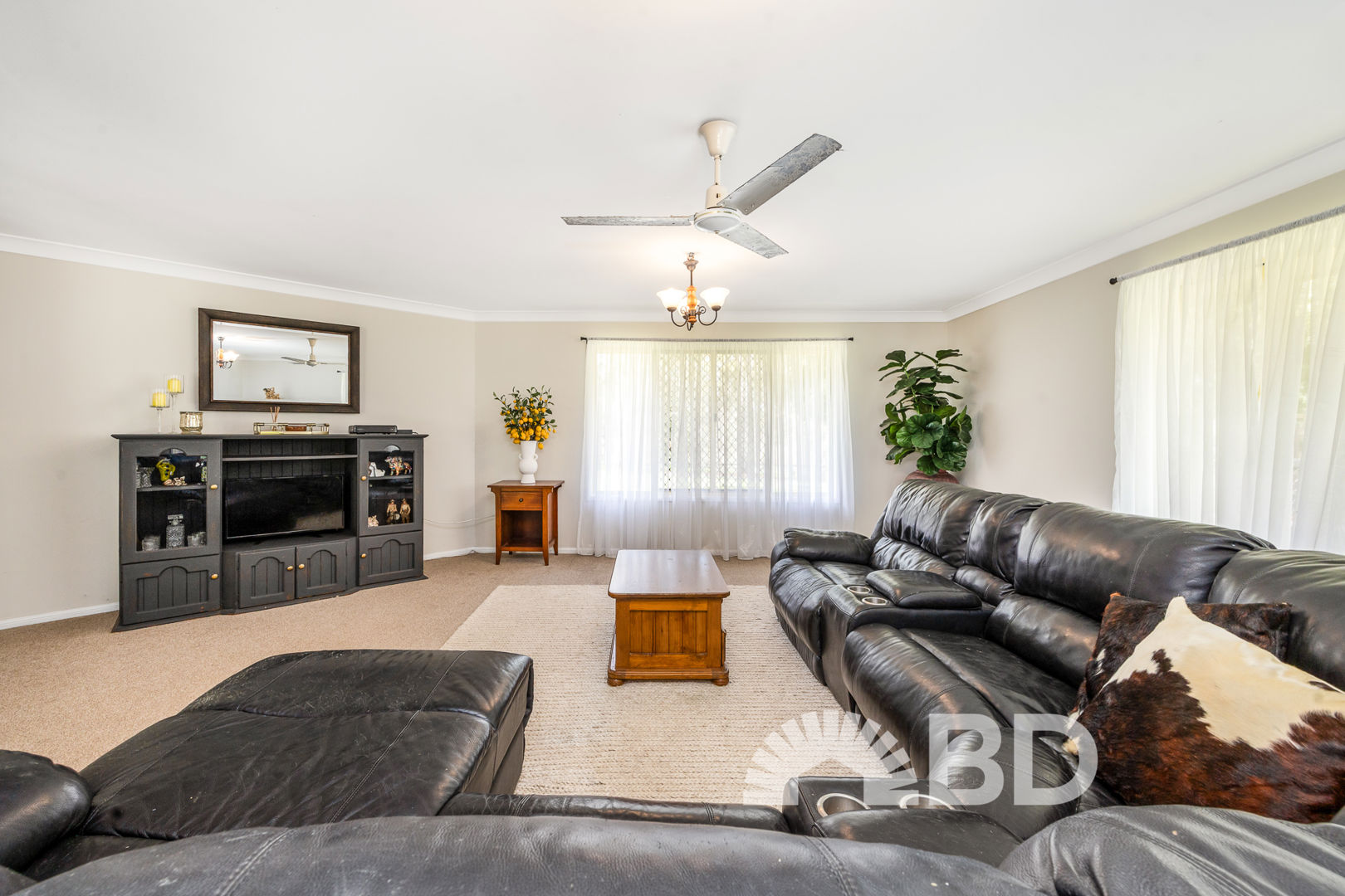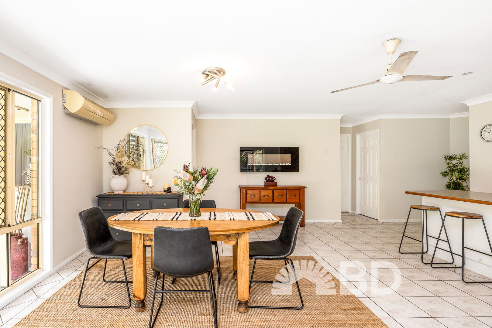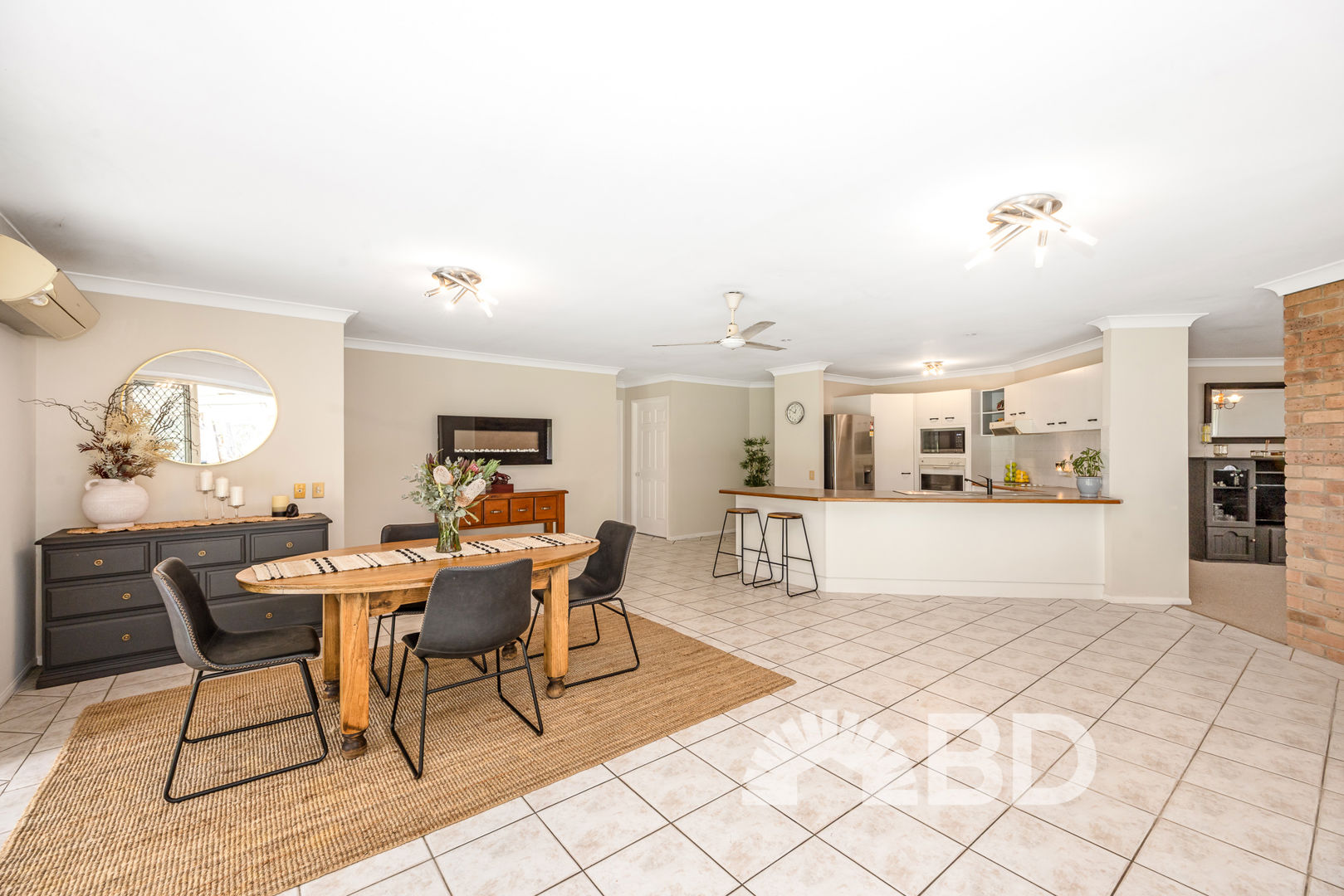 Step inside and discover a spacious open plan layout that's perfect for modern living. The tiled kitchen, dining and living area is the heart of the home, fitted with a split system air conditioner and ceiling fan for year-round comfort. The large kitchen includes a breakfast bar, electric cooktop, and wall oven-perfect for preparing meals while staying connected with family and guests. The carpeted lounge room offers a second living area with ample space, large windows for natural light, and another ceiling fan for added comfort.