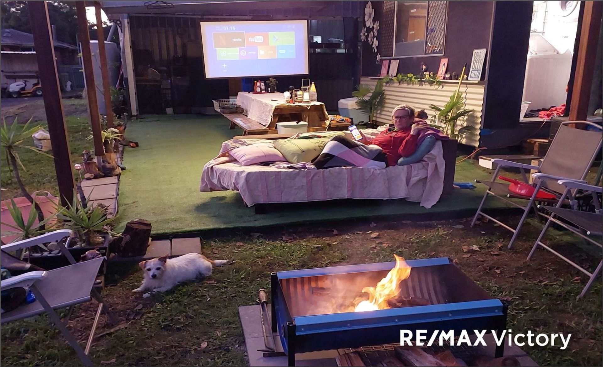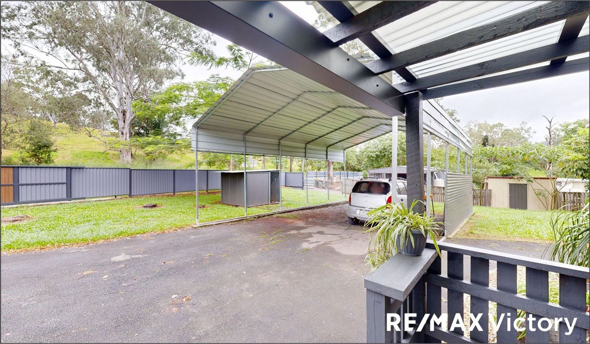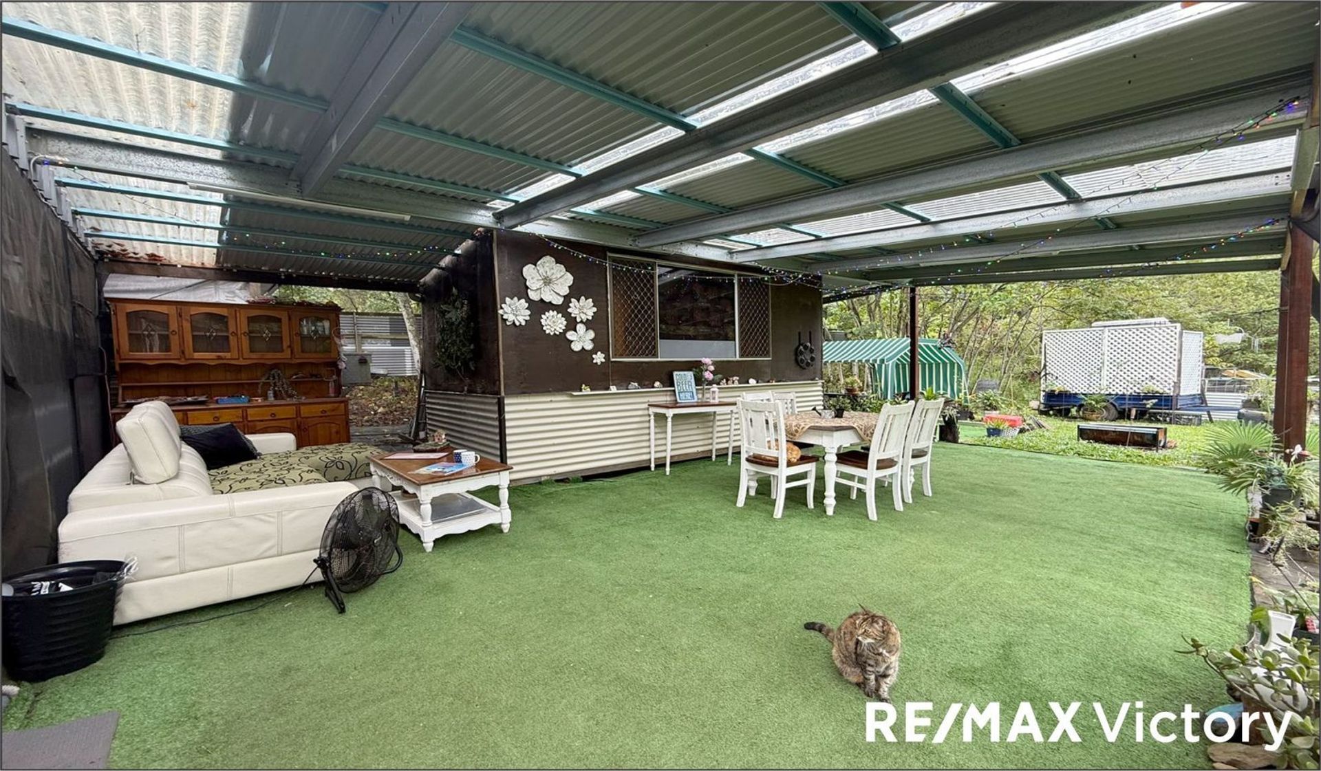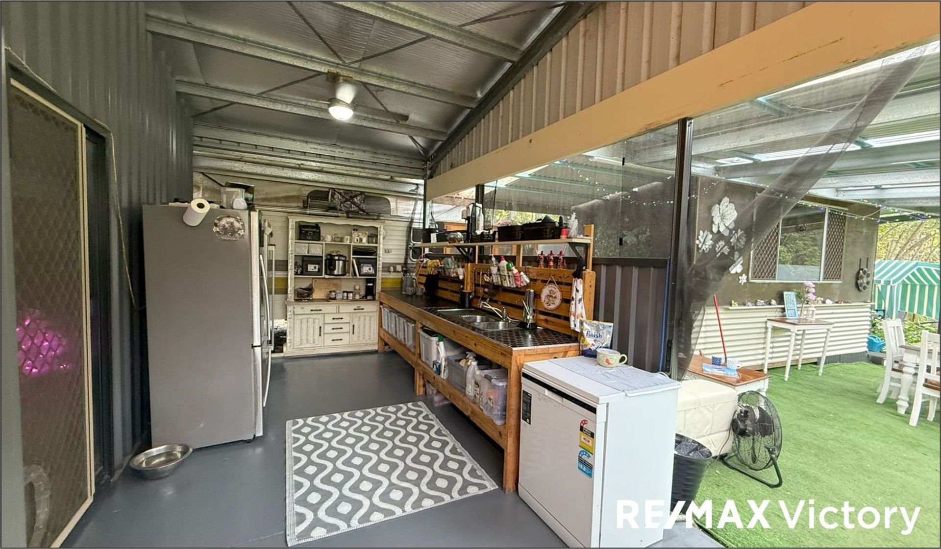 Adjoining the shed's roofline is another (12m x 7m) covered alfresco area with Astro Turf flooring, a shower area, and a laundry room.